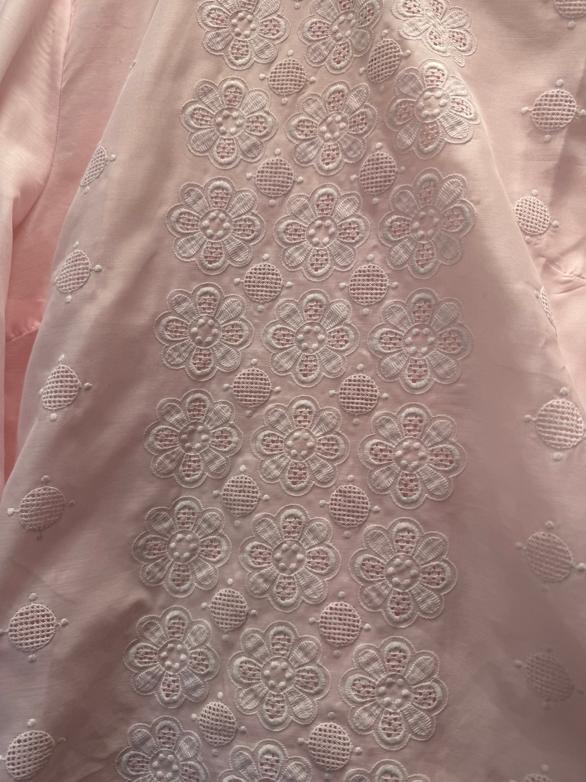 Blouse rose pâle, broderie florale ajourée, col haut, fermeture éclair dans le dos.