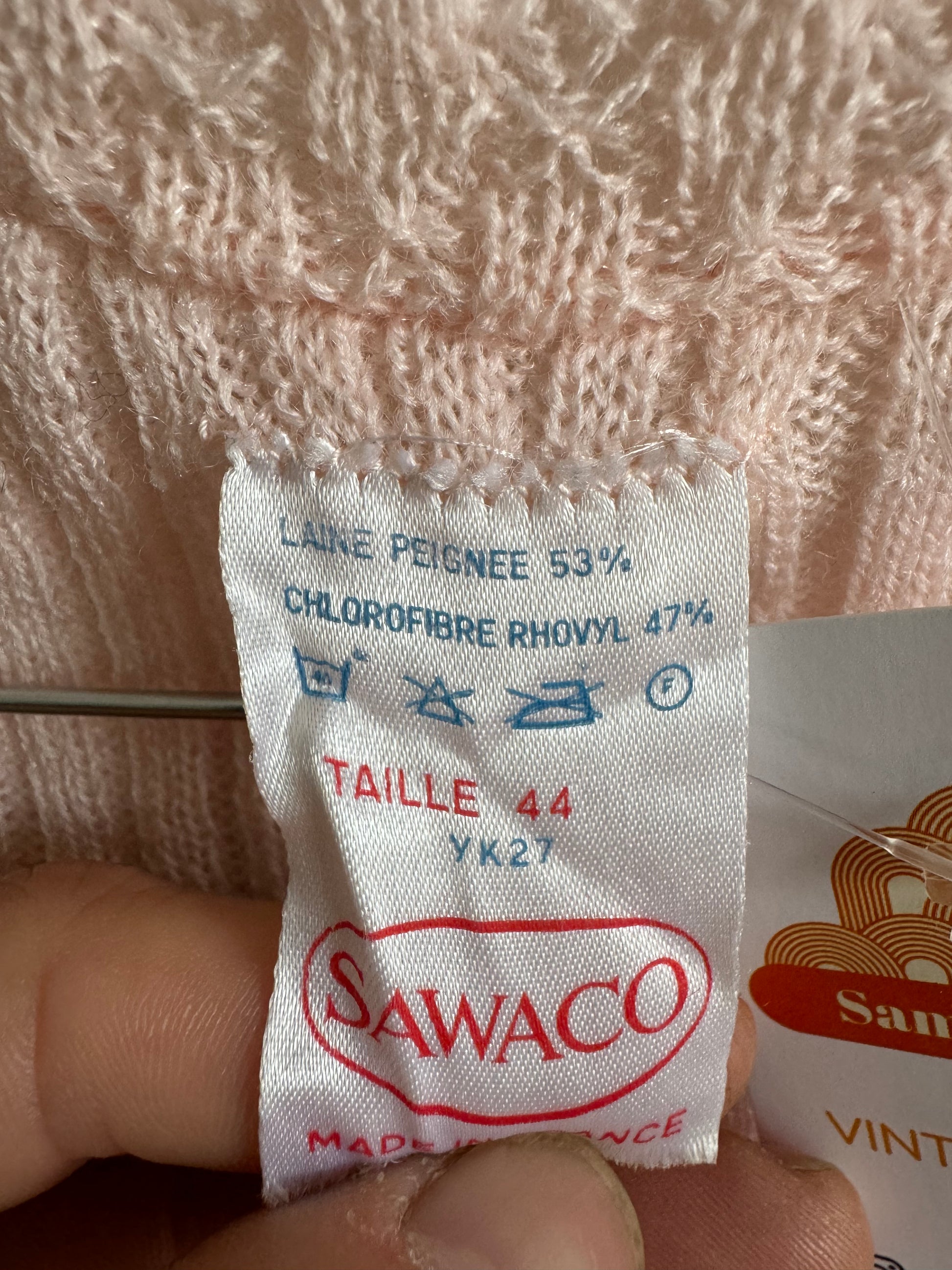 Cardigan rose des années 60, à nouer sur le haut, maille en relief.