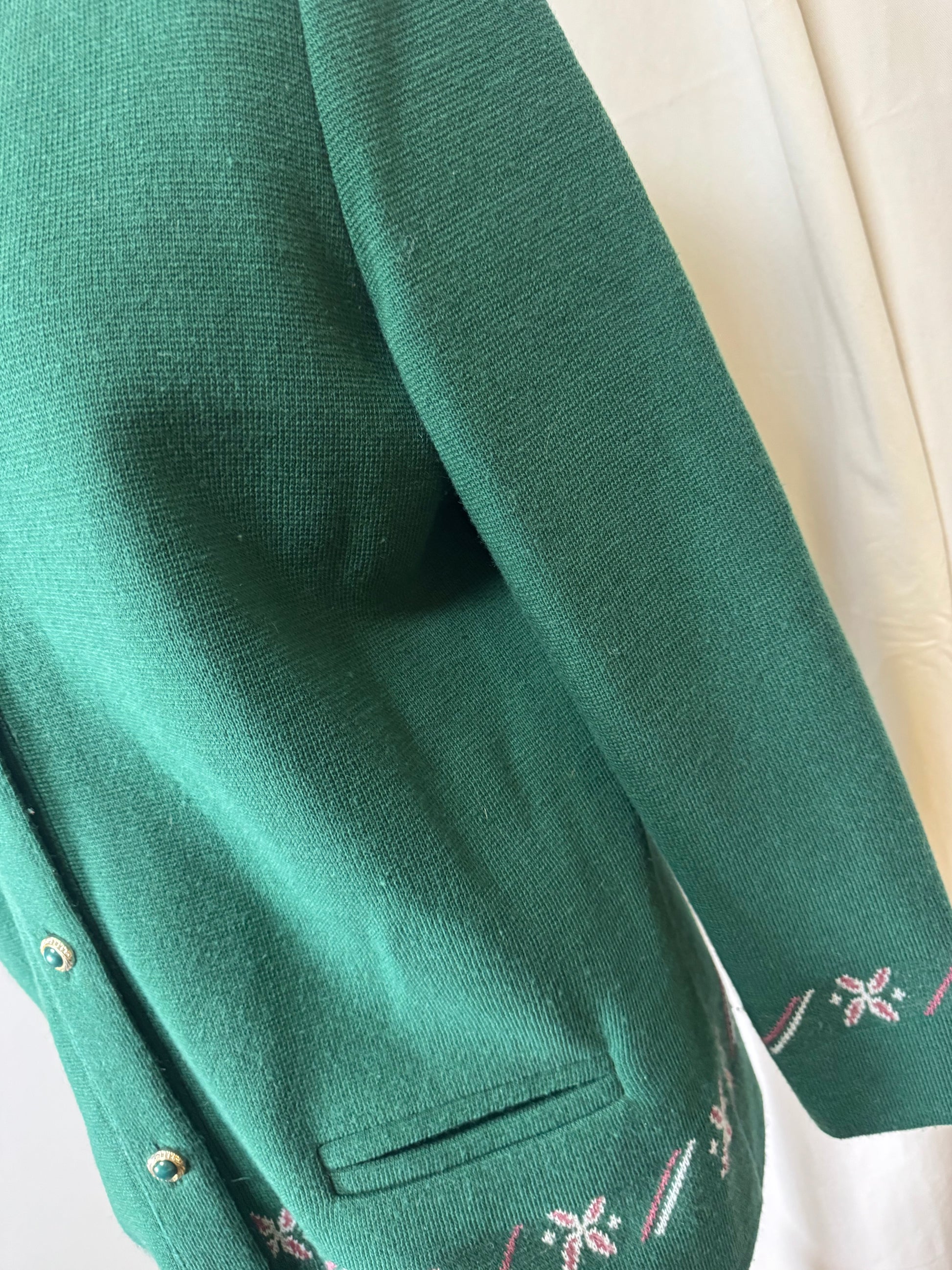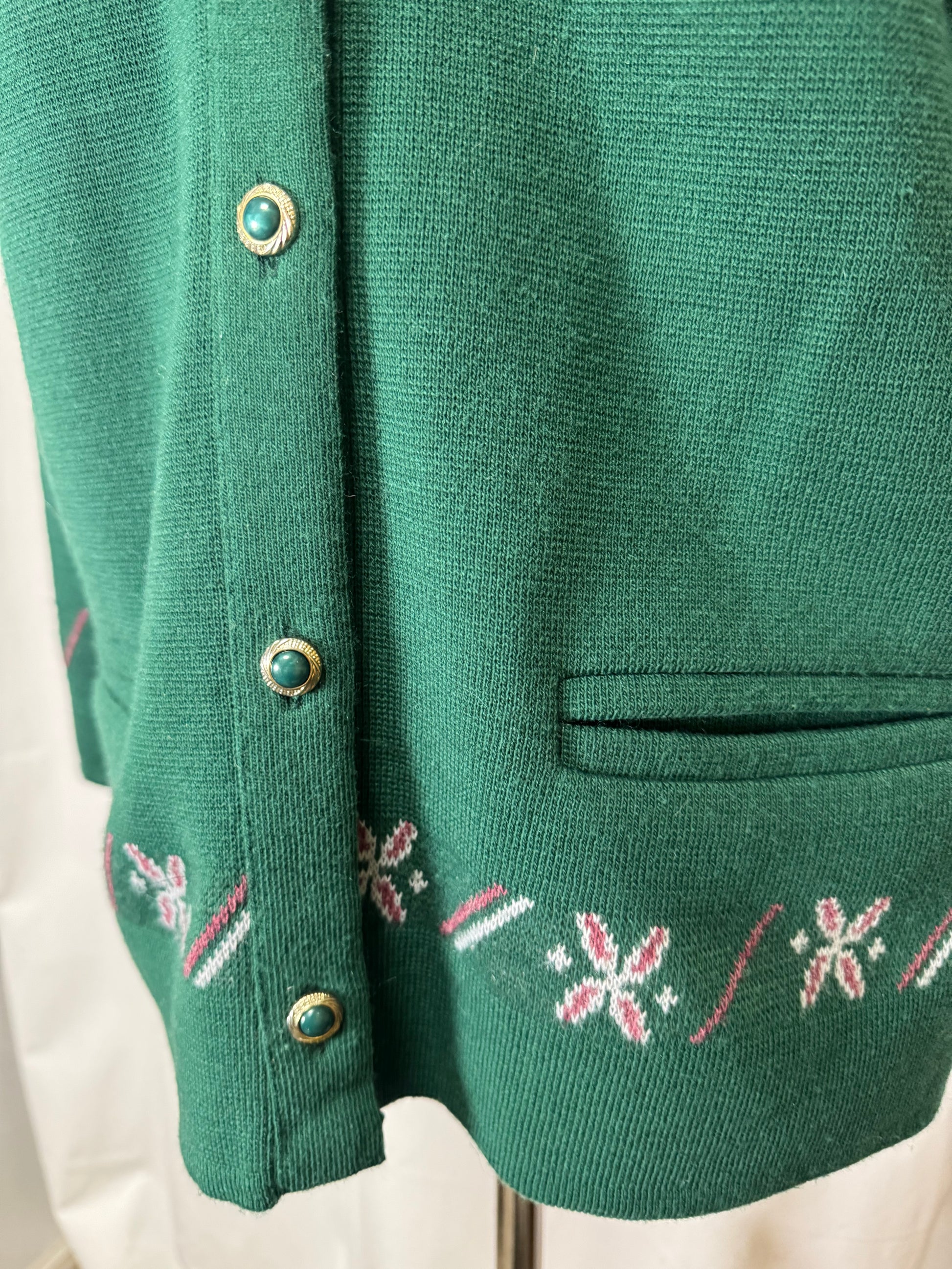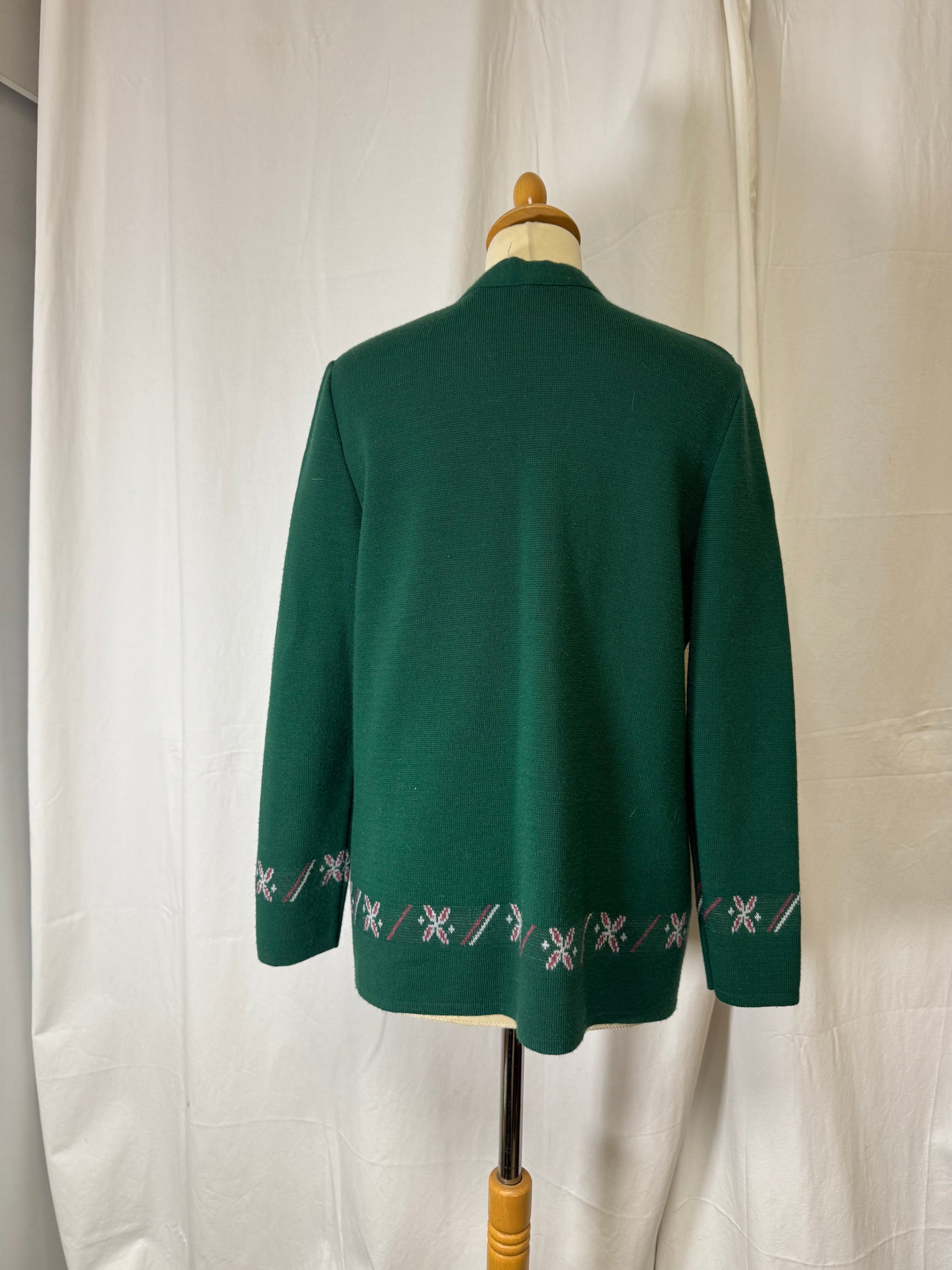 Cardigan, col v, deux poches, motifs sur le bas et les bouts de manches, fermeture par boutons dorés et vert.