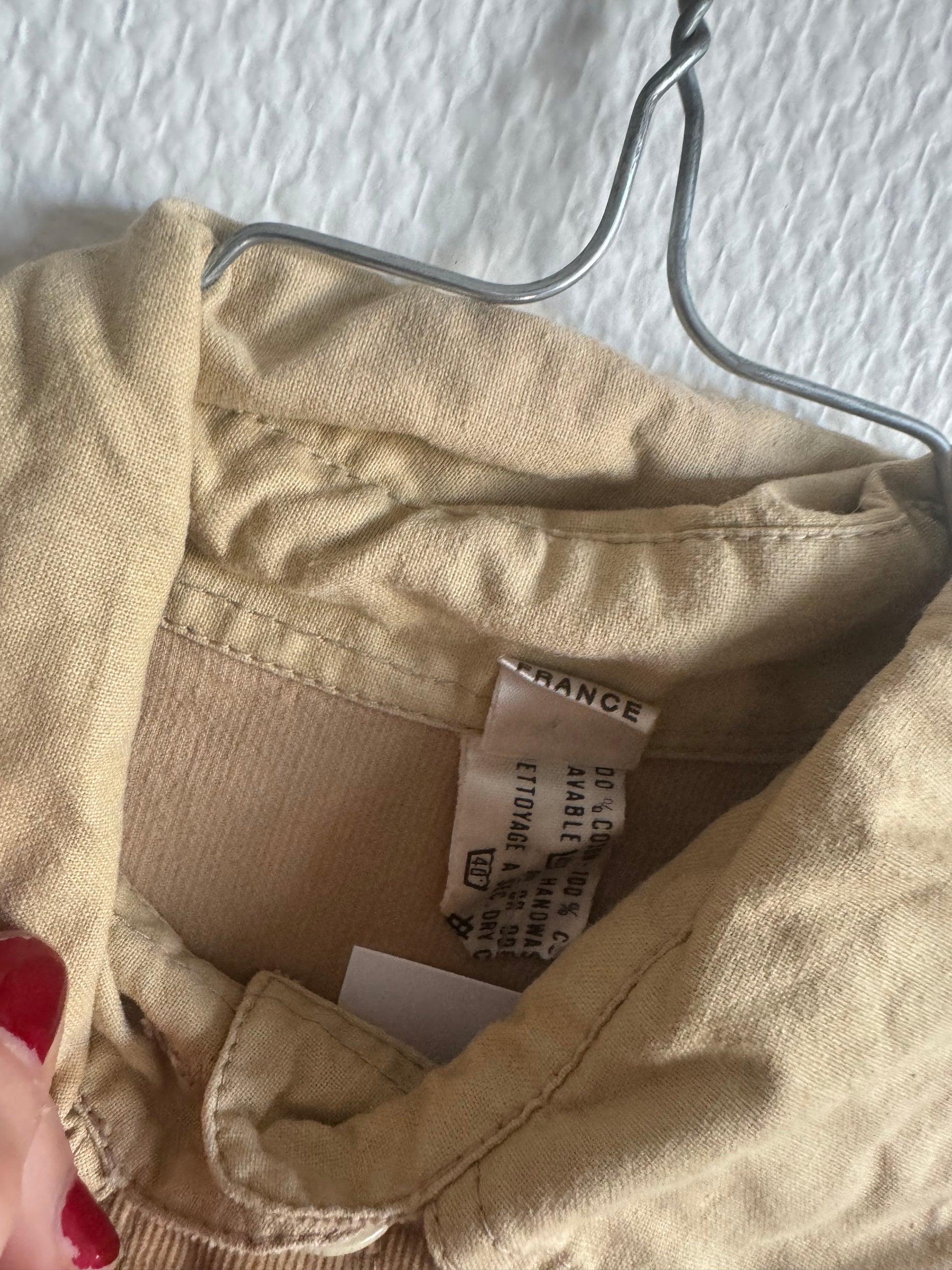 Chemise à manche courte des années 70, beige et marron clair, toile et velours côtelés, deux poches, col pointue / pelle à tarte, passant pour une ceinture.