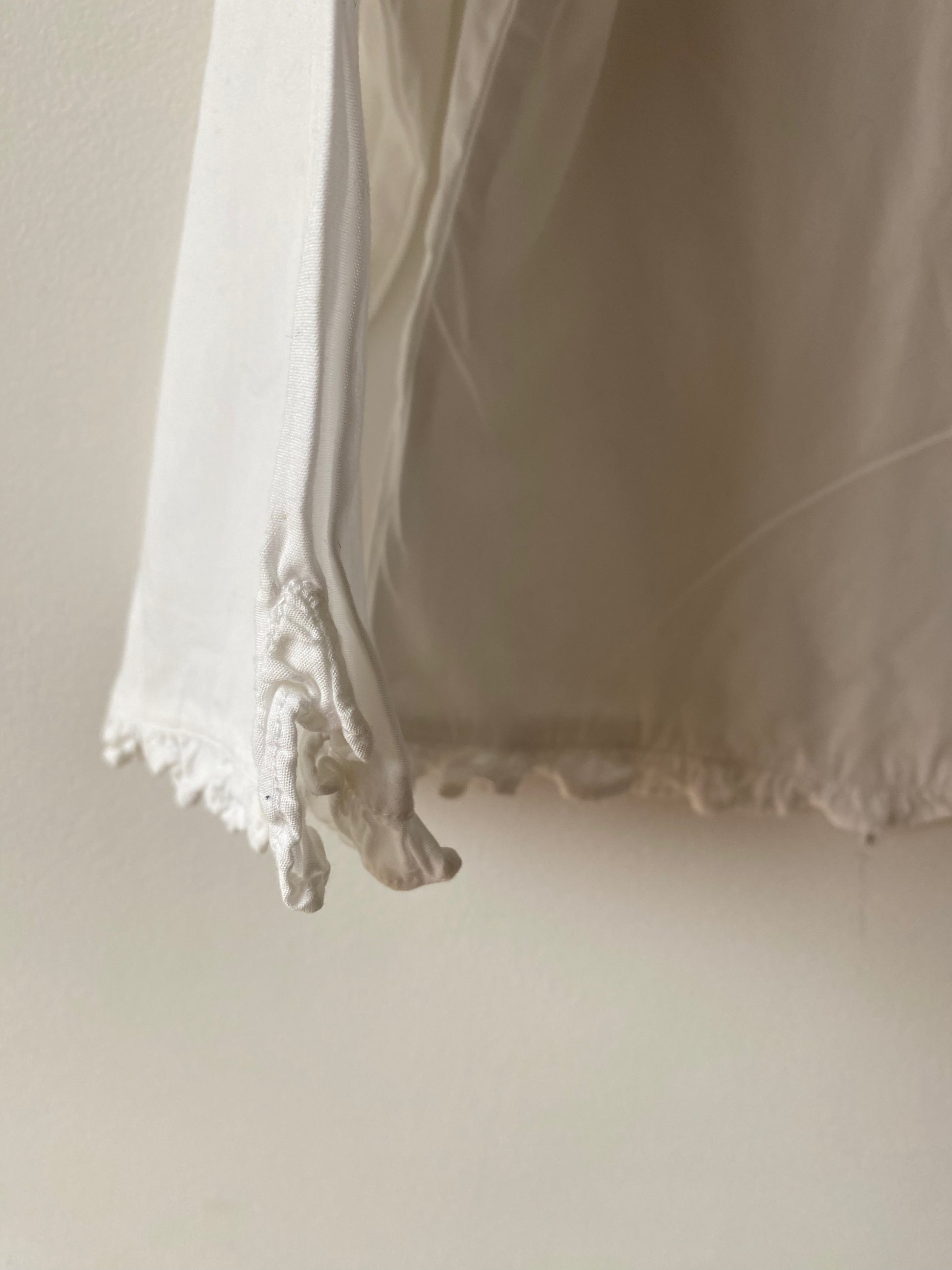 Chemise à manche longue blanc, petit col pointue, froufrou sur les bouts de manches et le bas.