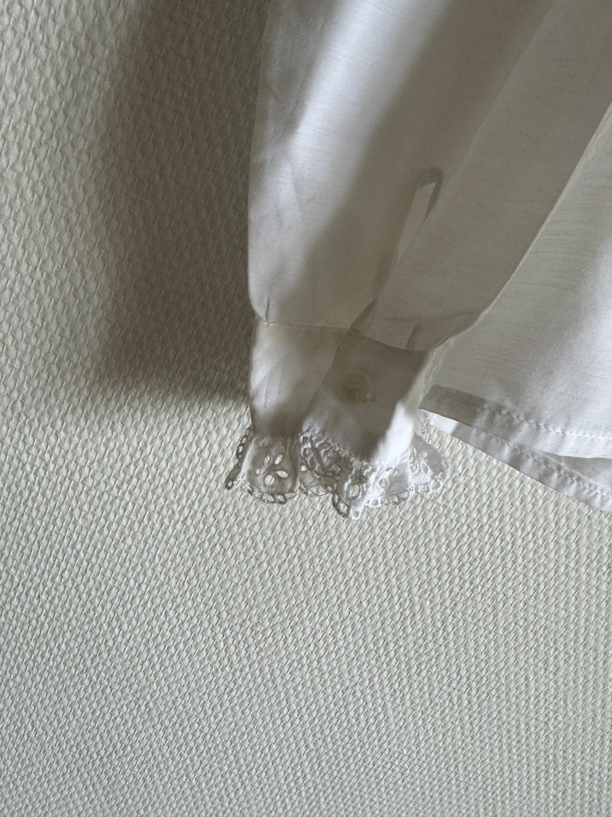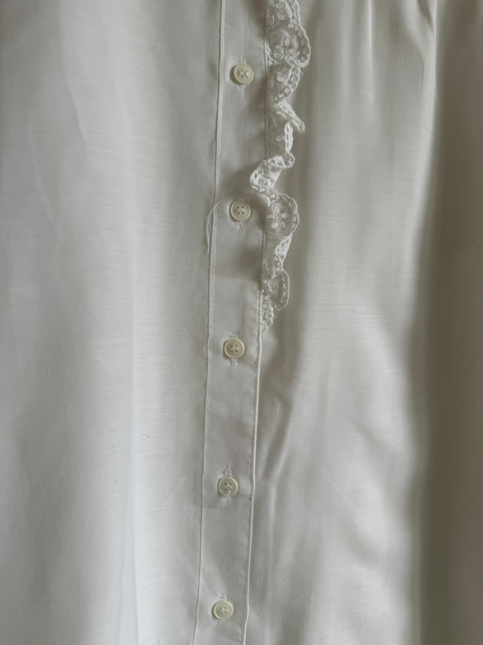 Chemise uni blanche, détails de broderie anglaise, légèrement transparente.