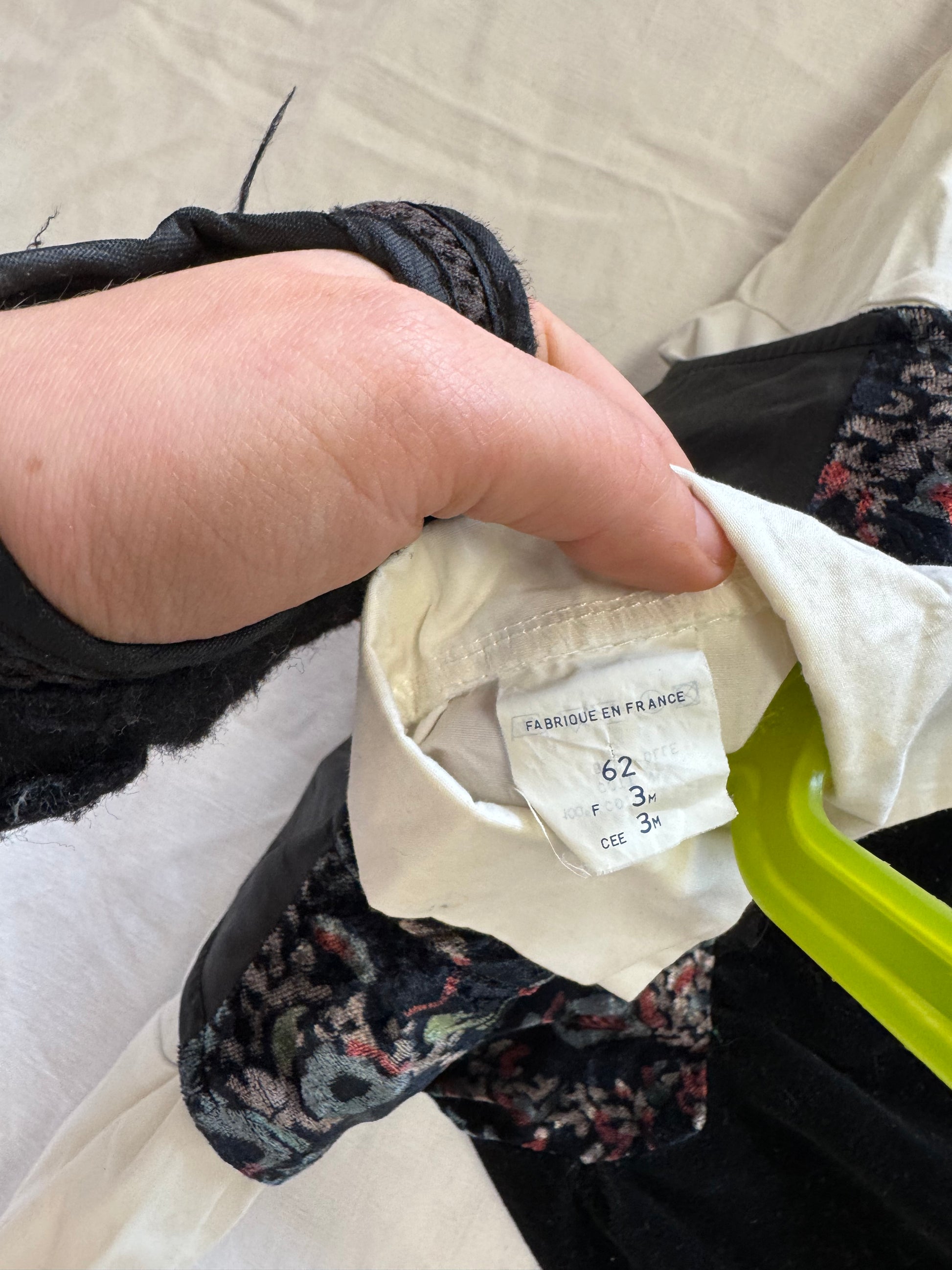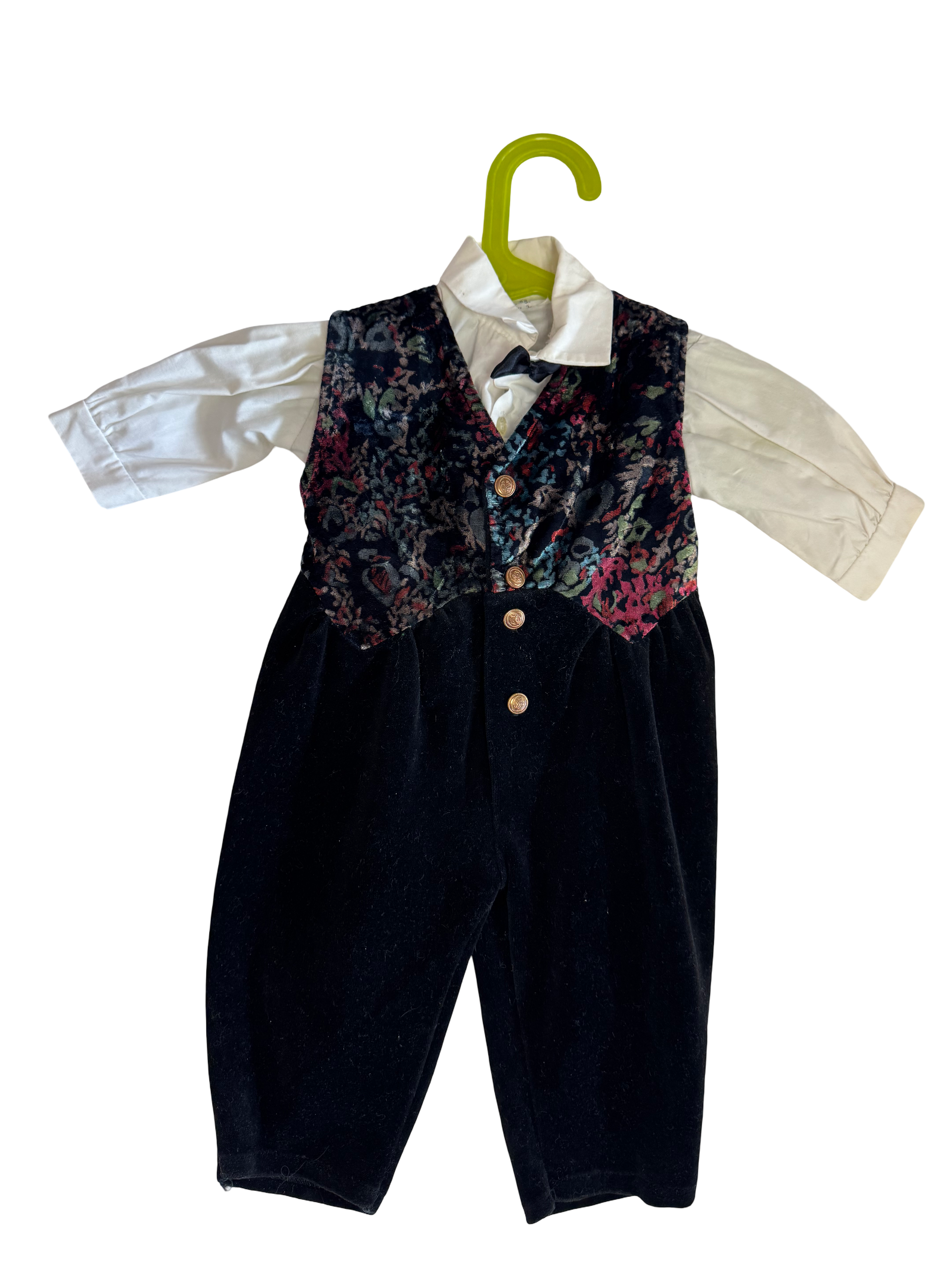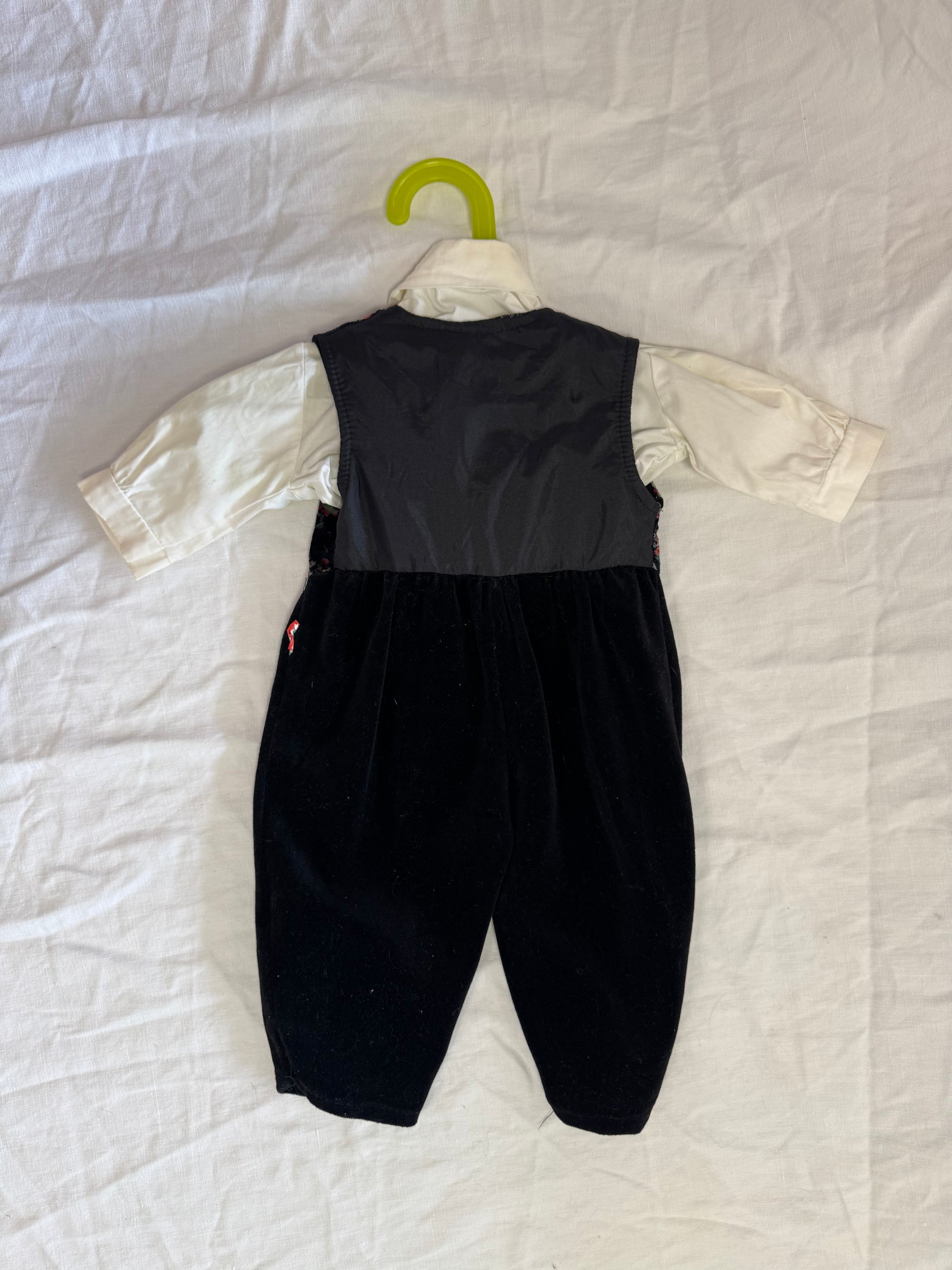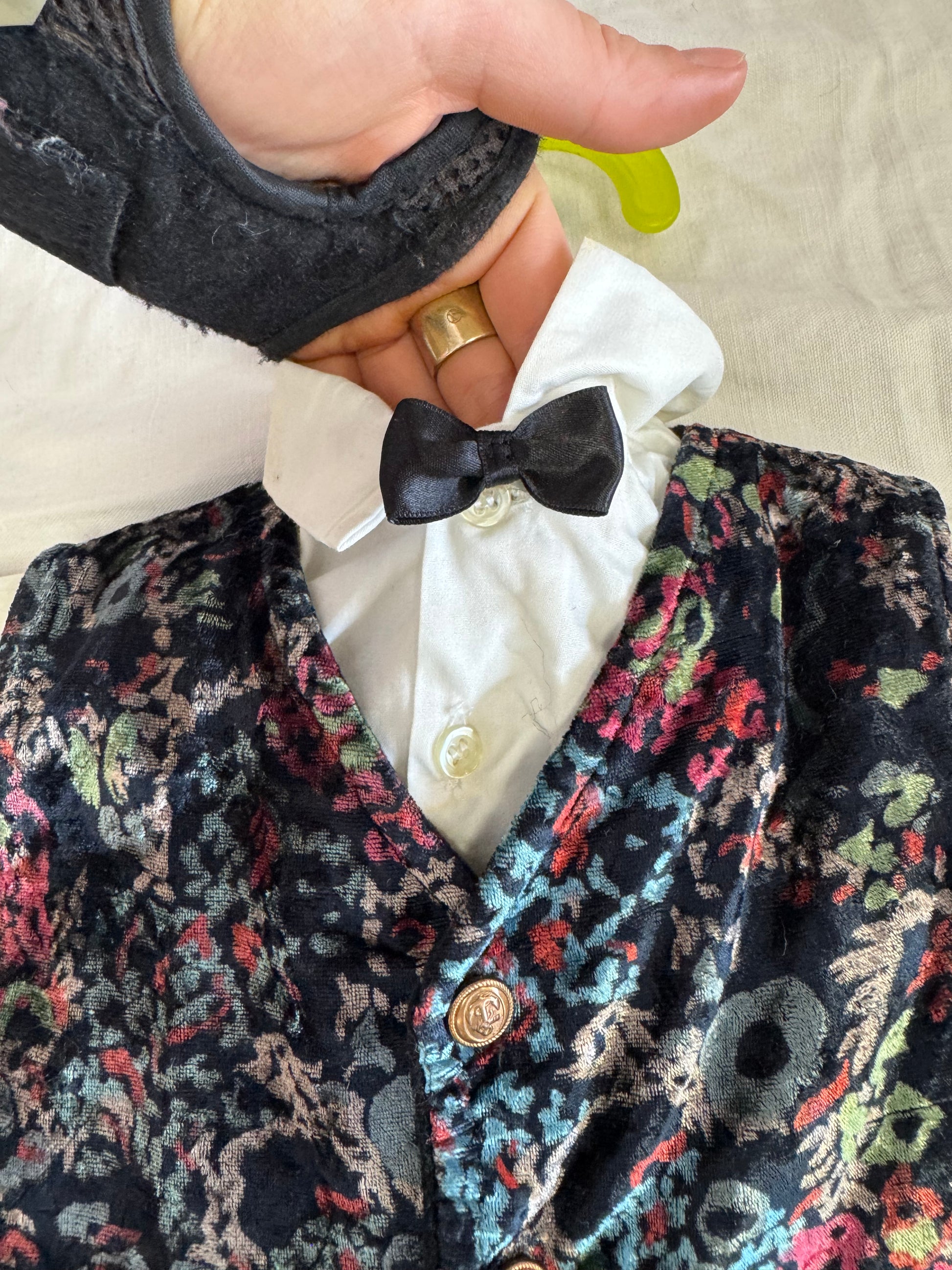 Combinaison pantalon en velours noir, motifs géométrique sur le veston, chemise blanche intégré avec noeud papillon noir.