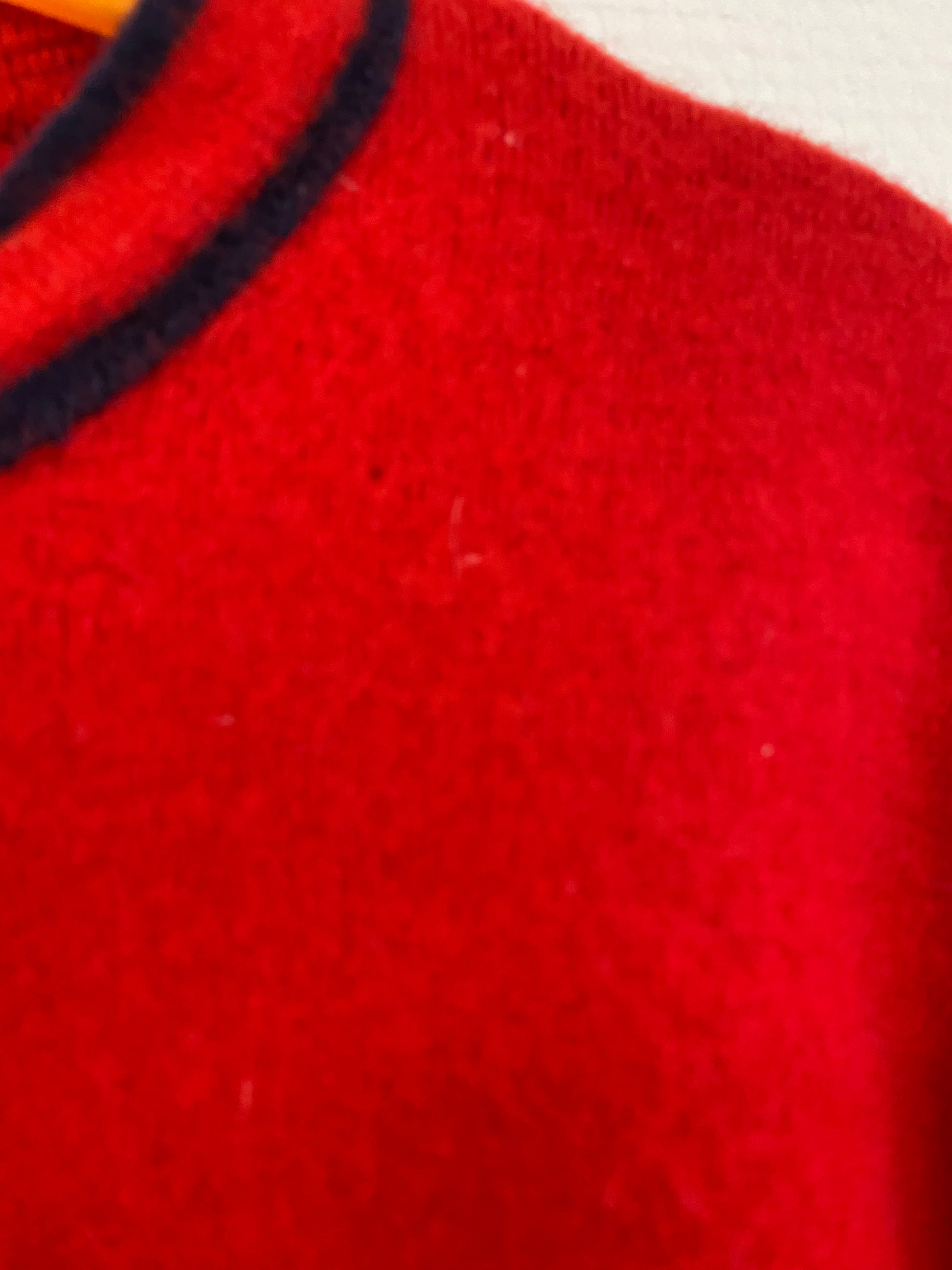 Gilet rouge, détails bleu marine, boutons doré, deux fausses poches, made in france.