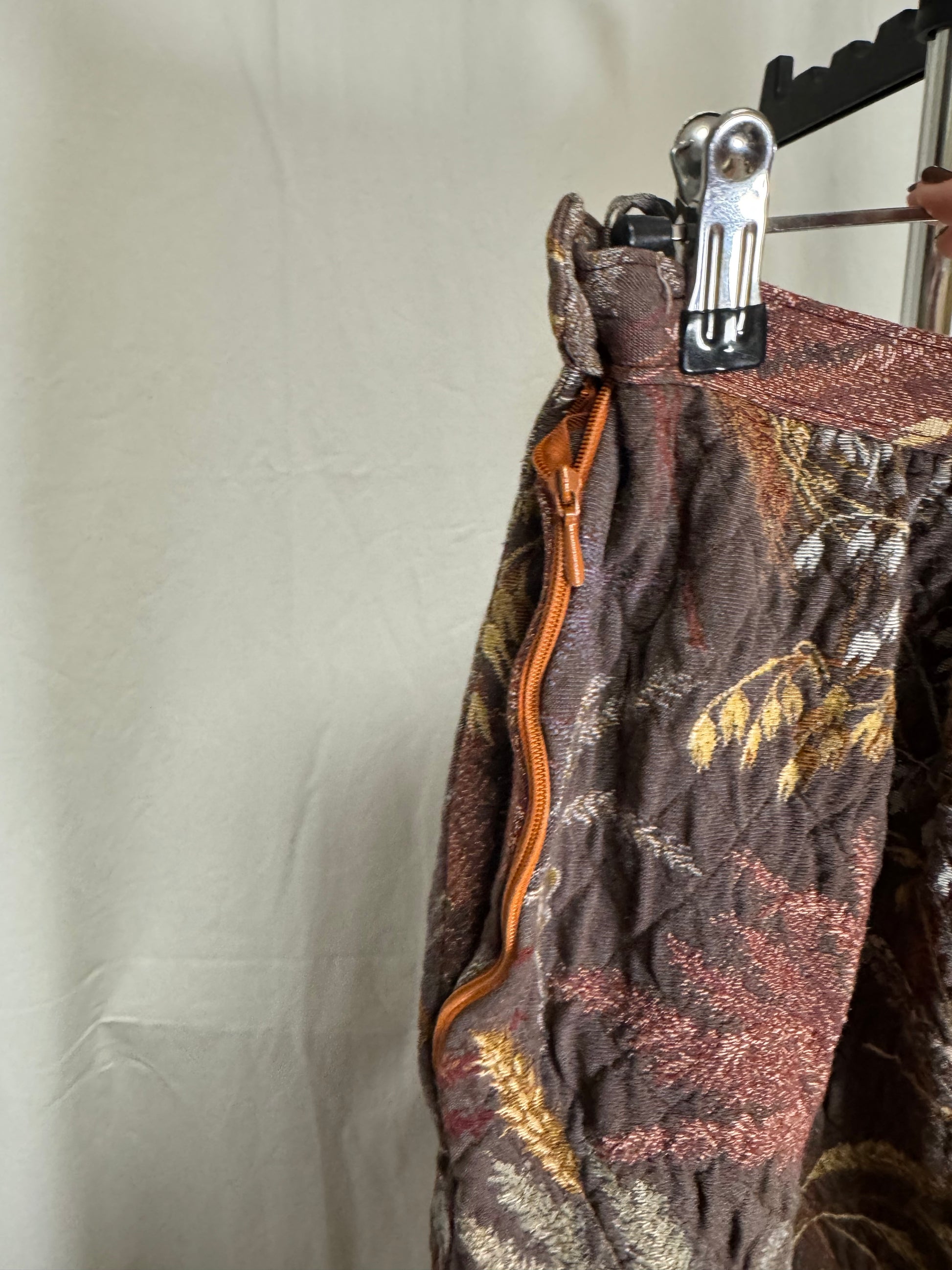 Jupe culotte à motifs floraux, tons marron, fermeture éclair sur le côté, deux poches.