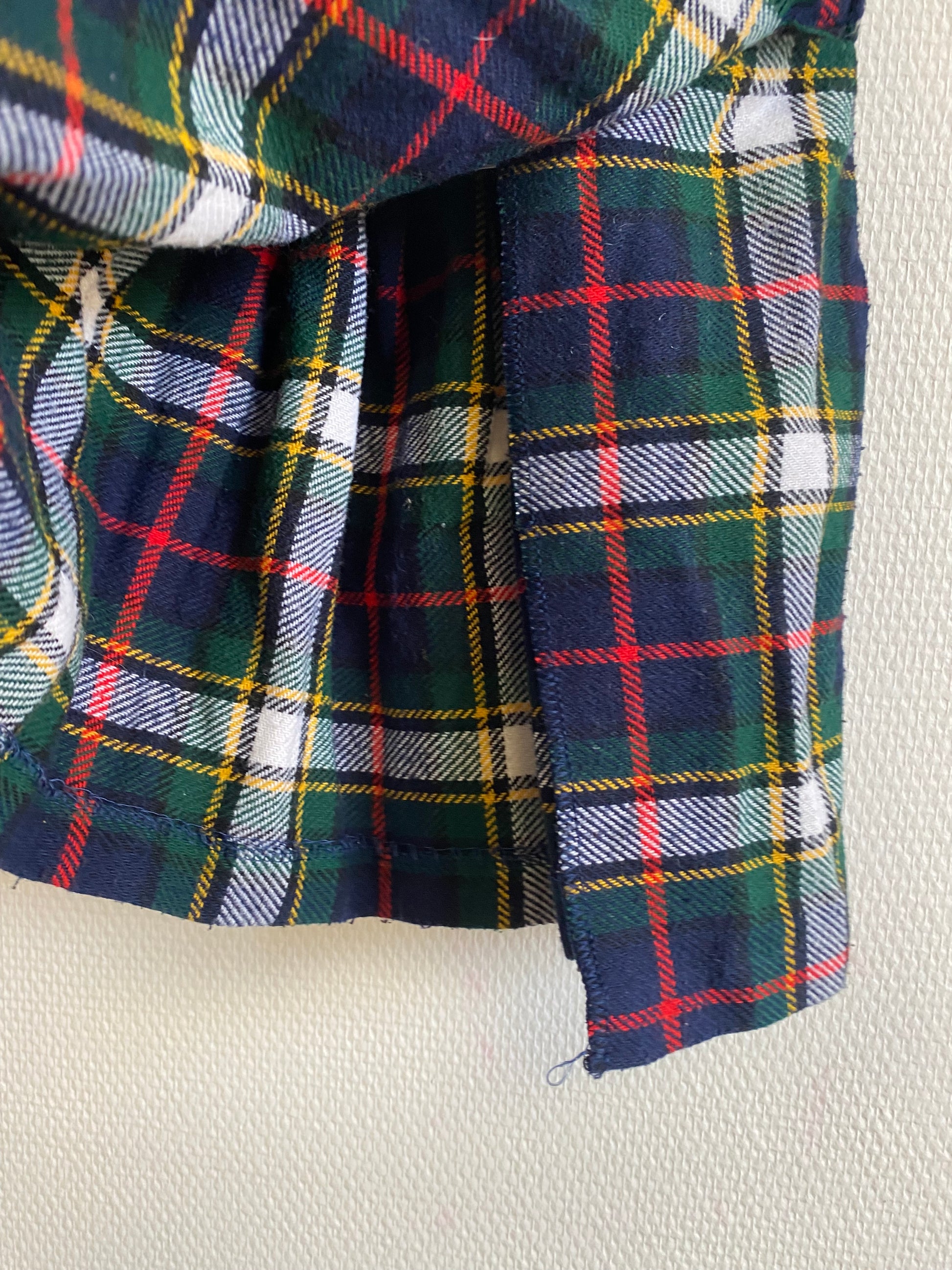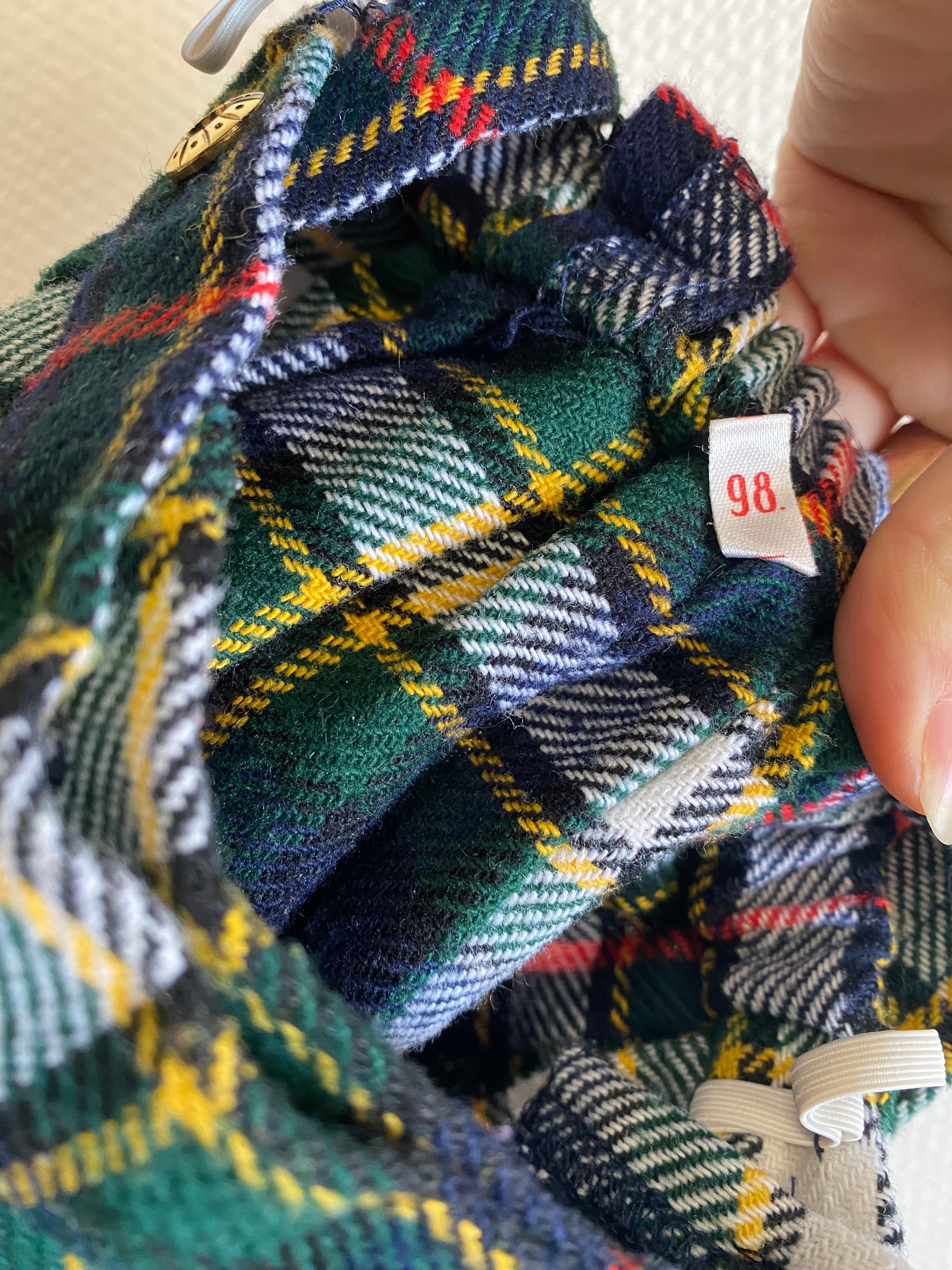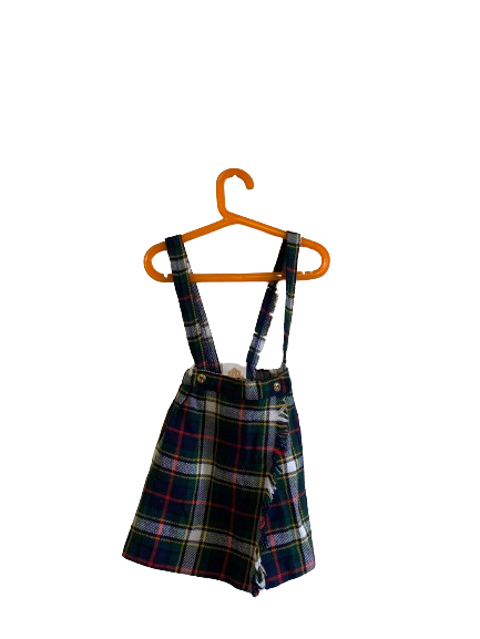 Jupe écossaise à bretelle, fermeture portefeuille, élastique dans le dos.