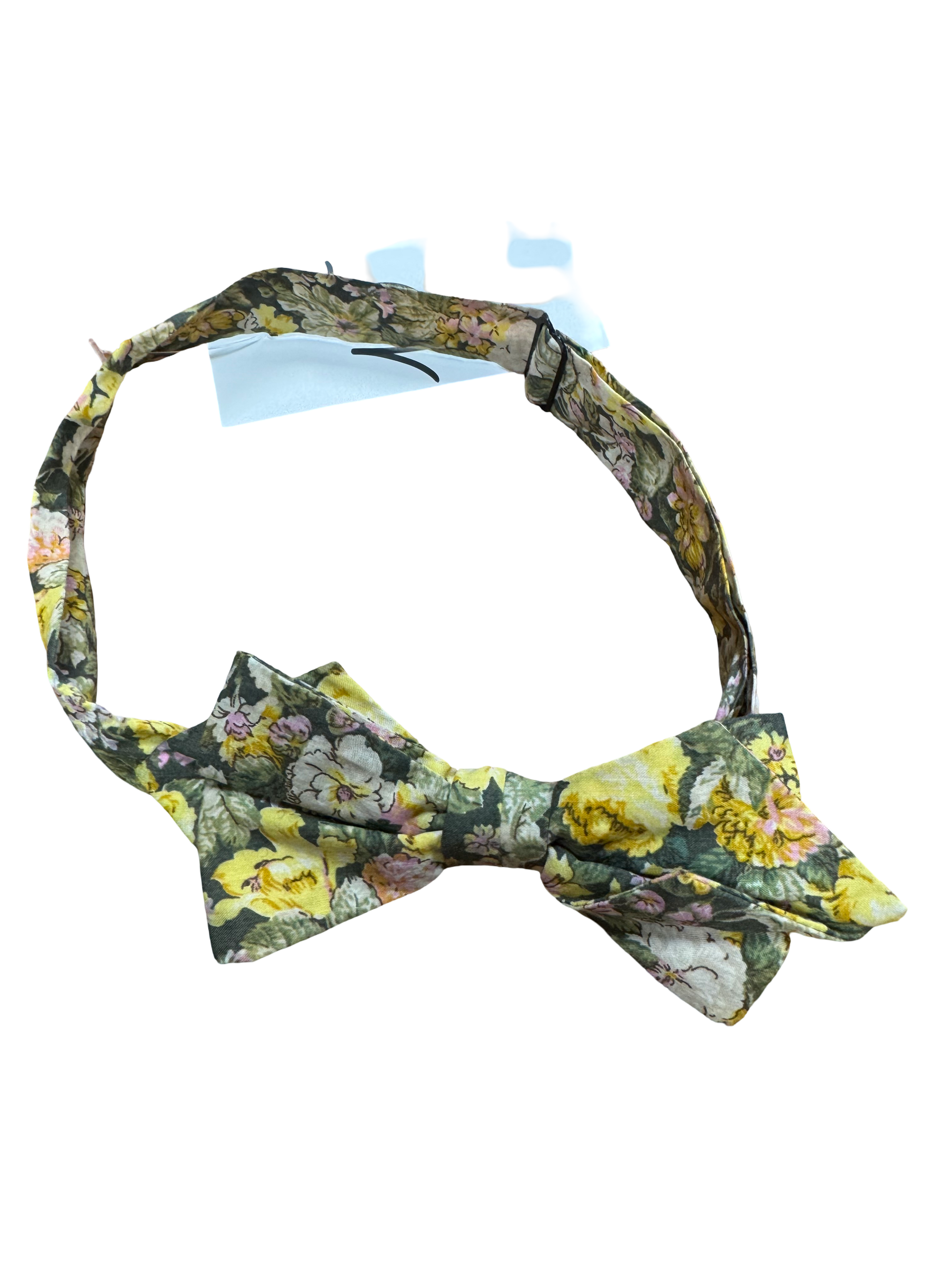 Noeud papillon à fleurs, tons vert et jaune, ajustable.