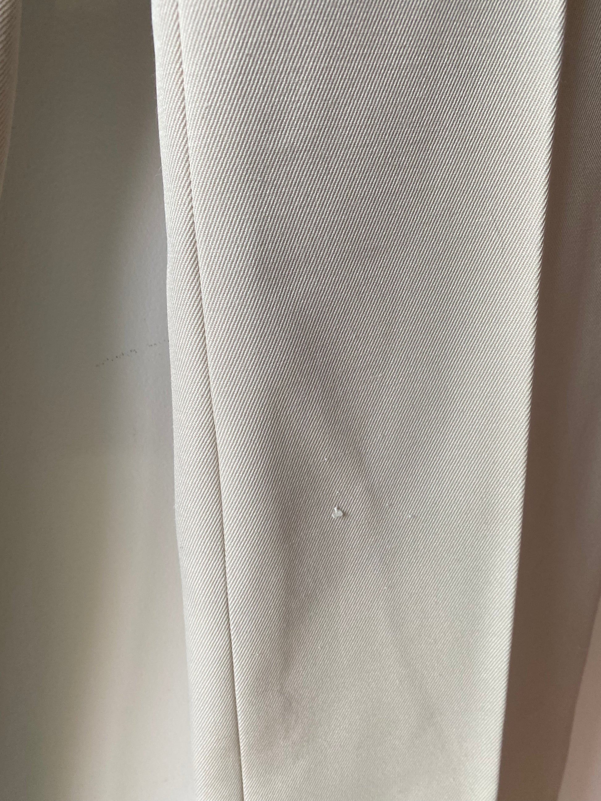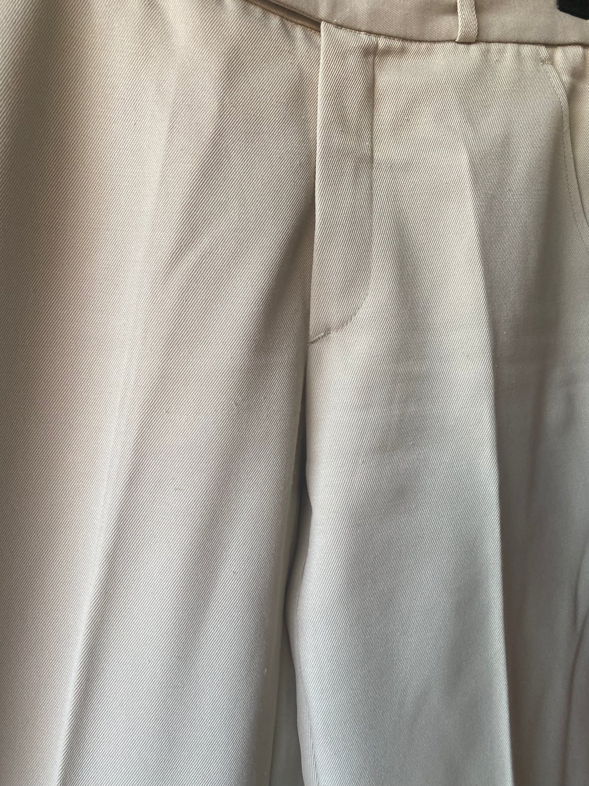 Pantalon de costume beige des années 70, deux poches, passant pour une ceinture, coupe droite.