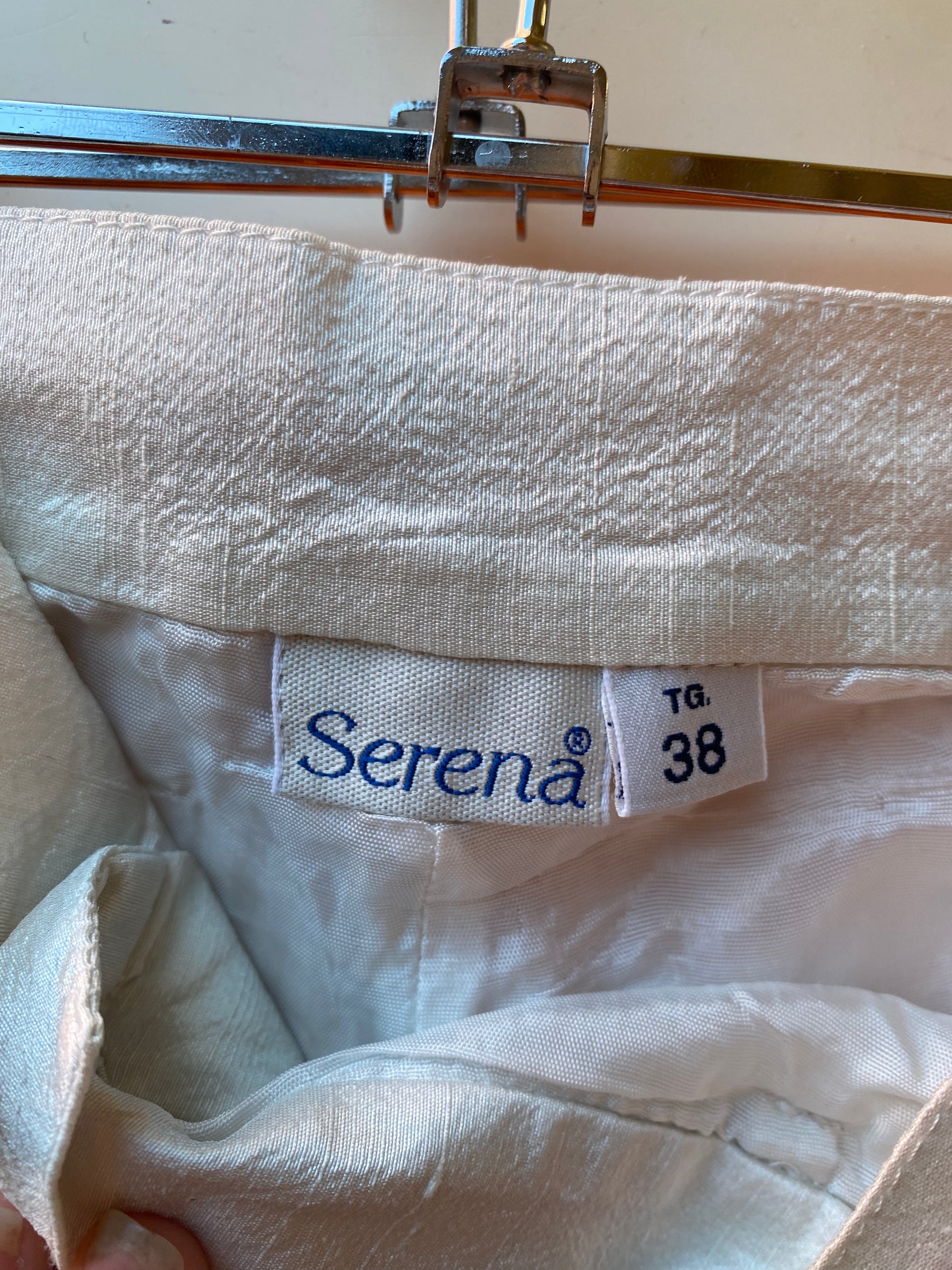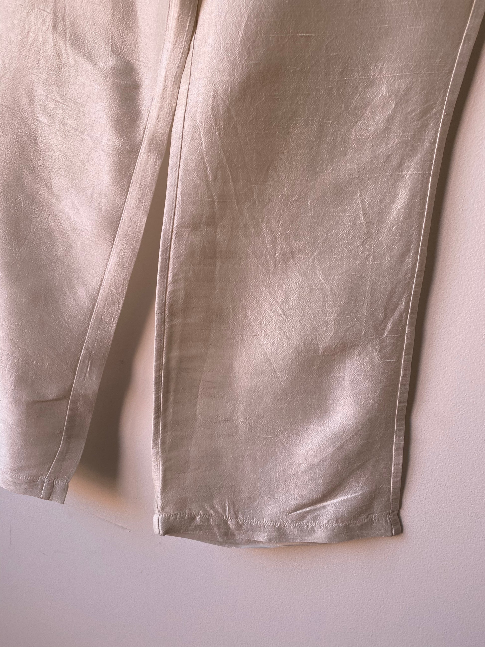 Pantalon droit / large des années 70, blanc, pas de poches, passant pour une ceinture.