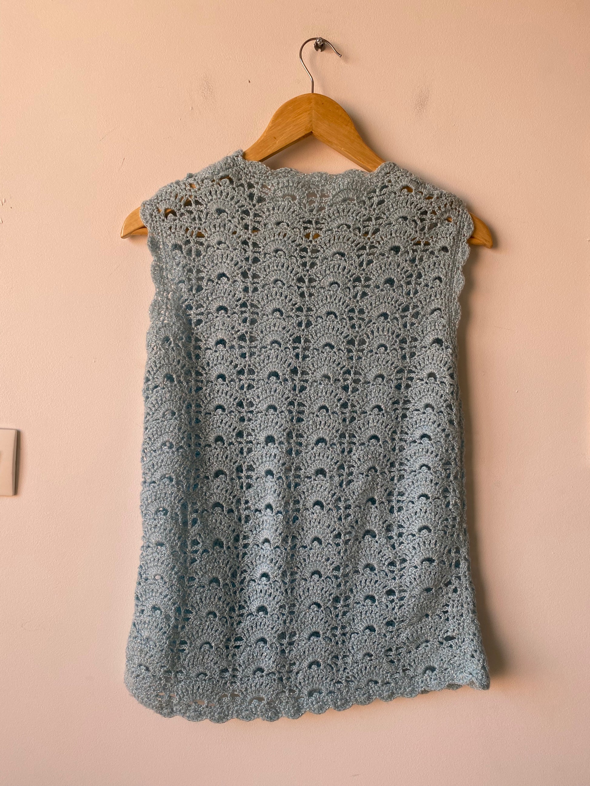 Pull en maille ajourée des années 70, bleu clair et fil lurex argenté, col rond.
