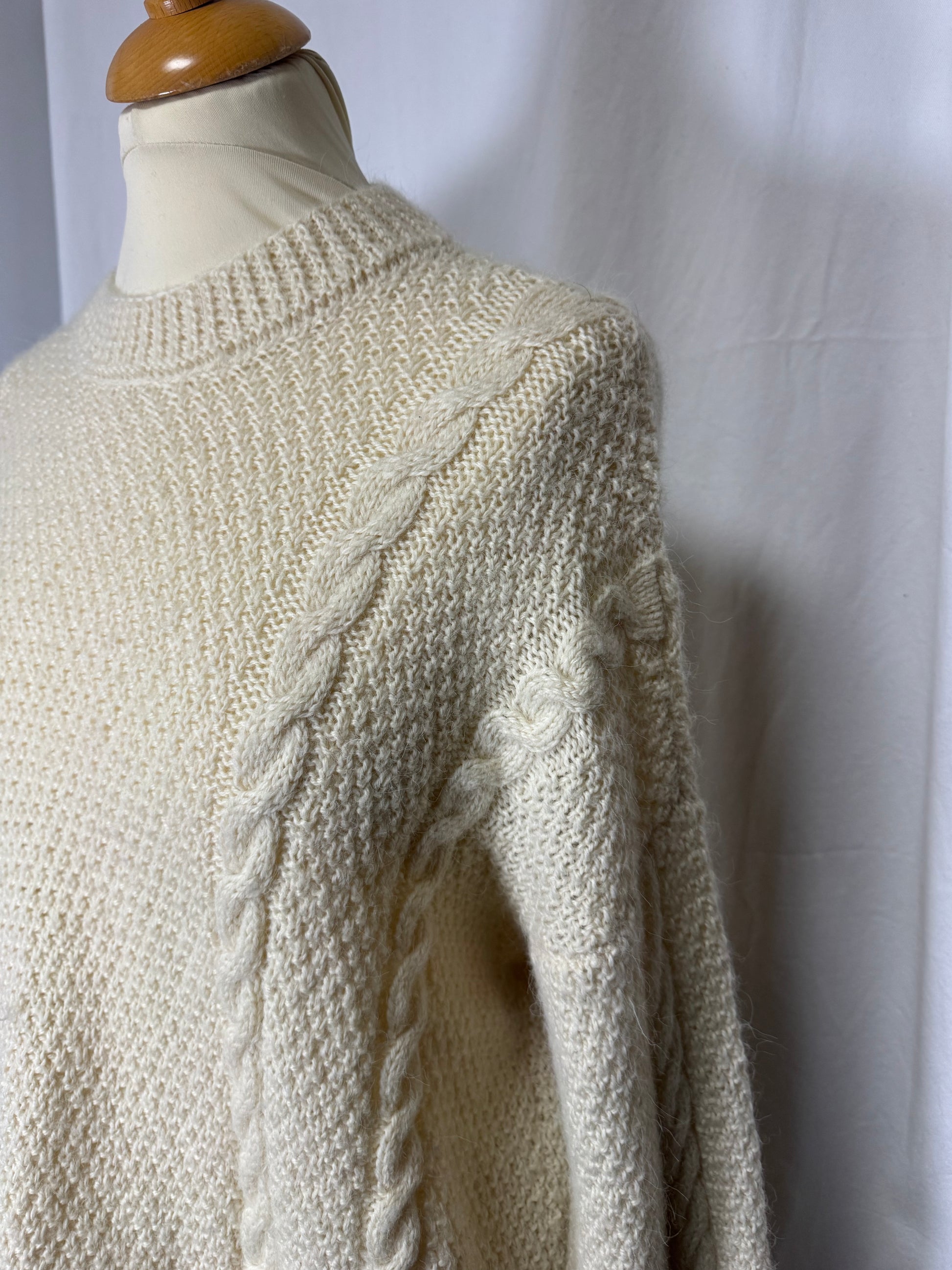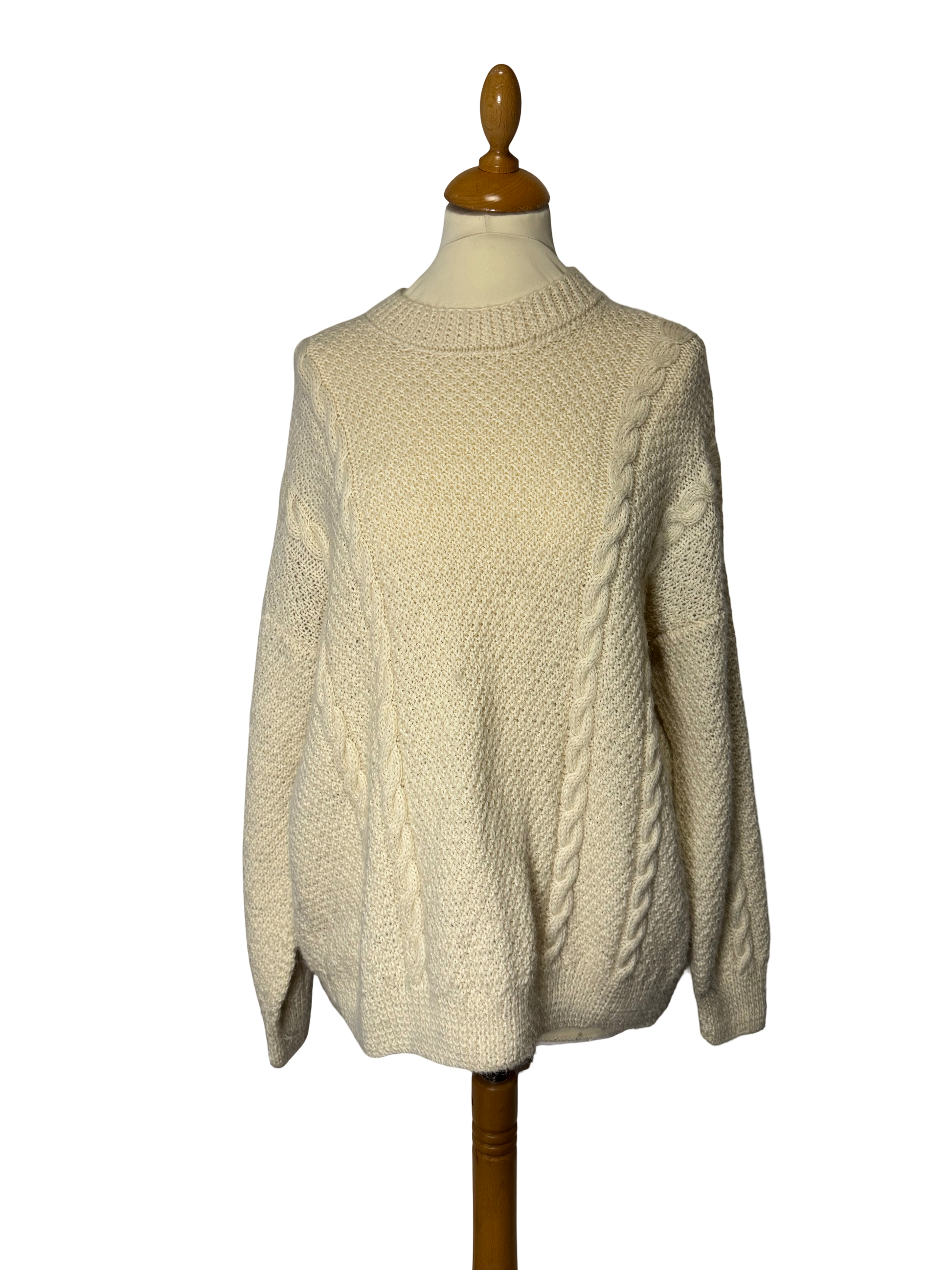Pull en maille, torsade, col rond, écrue/beige.