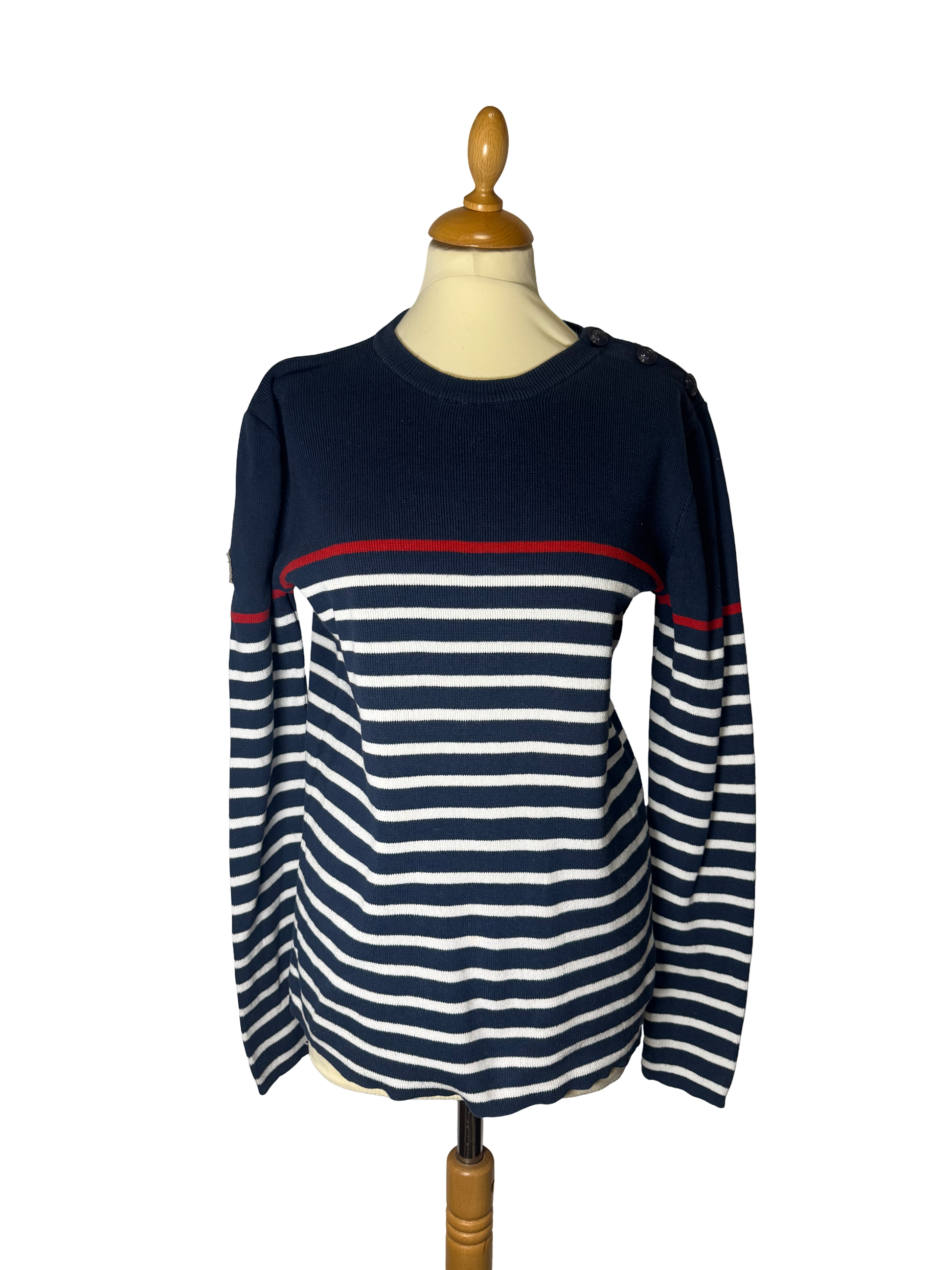 Pull marinière, bleu et blanc, col rond, trois boutons sur l'épaule.