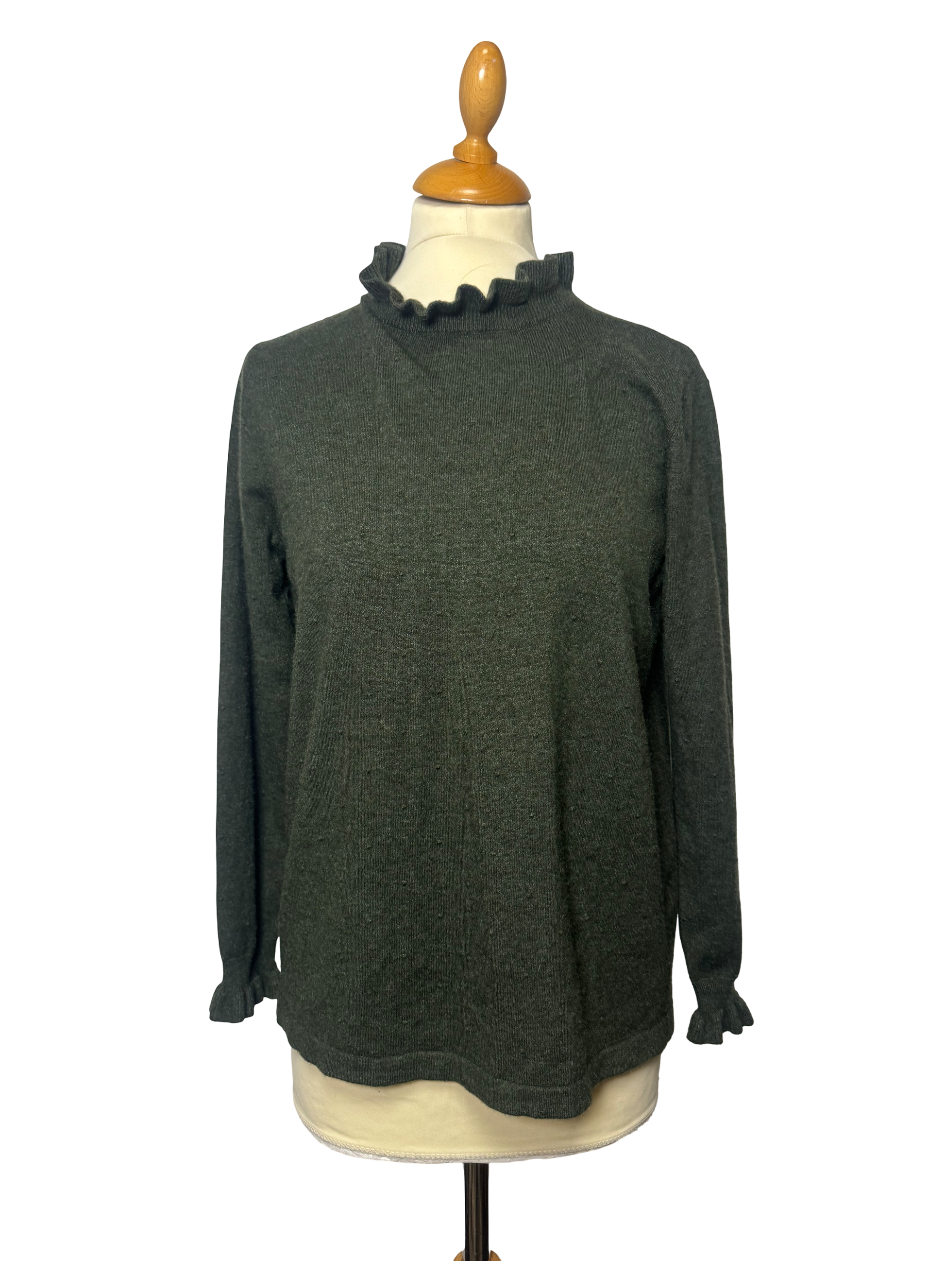 Pull vert kaki, col rond, relief de petit point, petit volant sur le col et les bouts de manches.