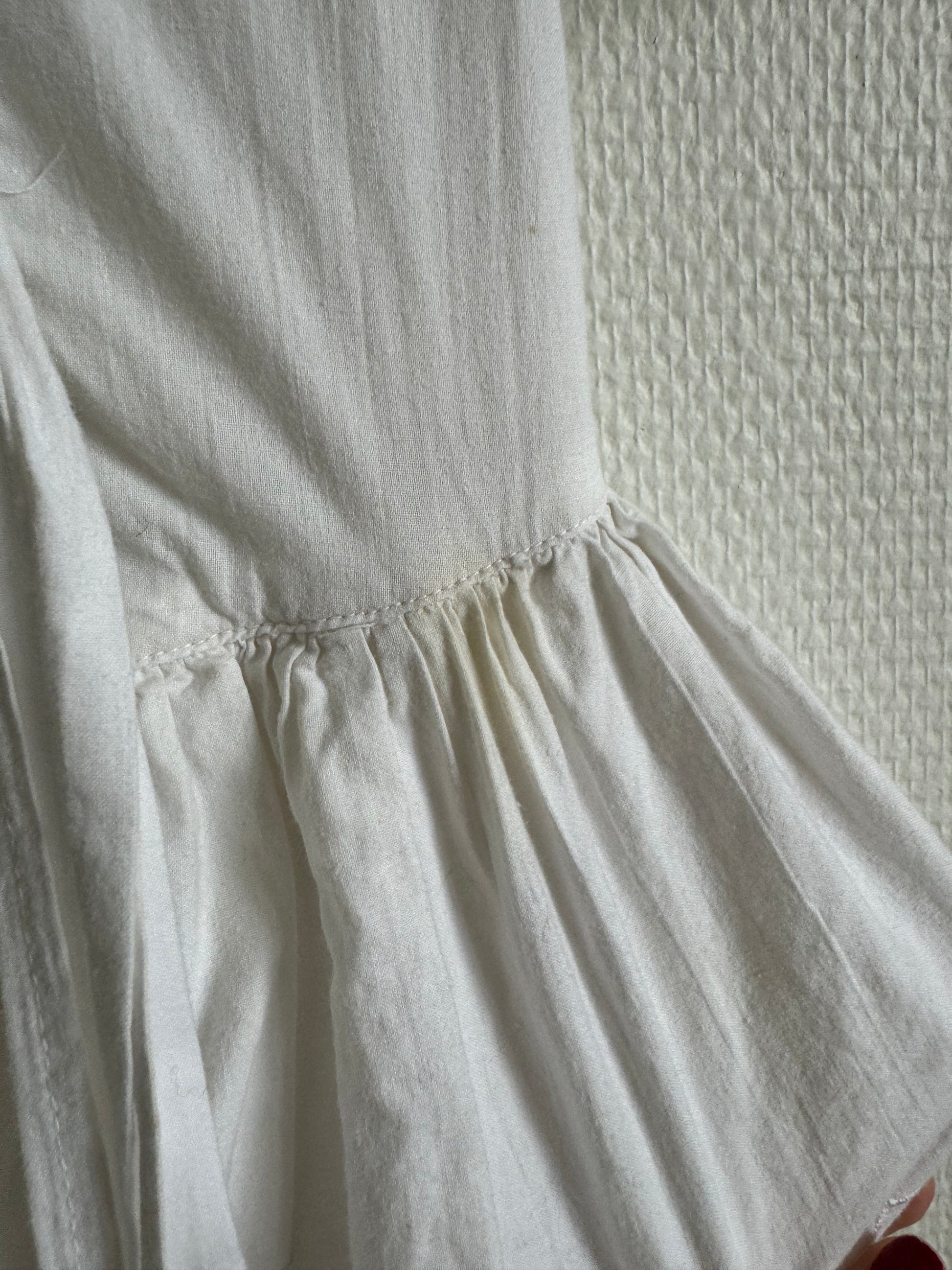Robe blanche, broderie floral, col arrondie, ceinture intégré, volant, manche courte légèrement bouffante.