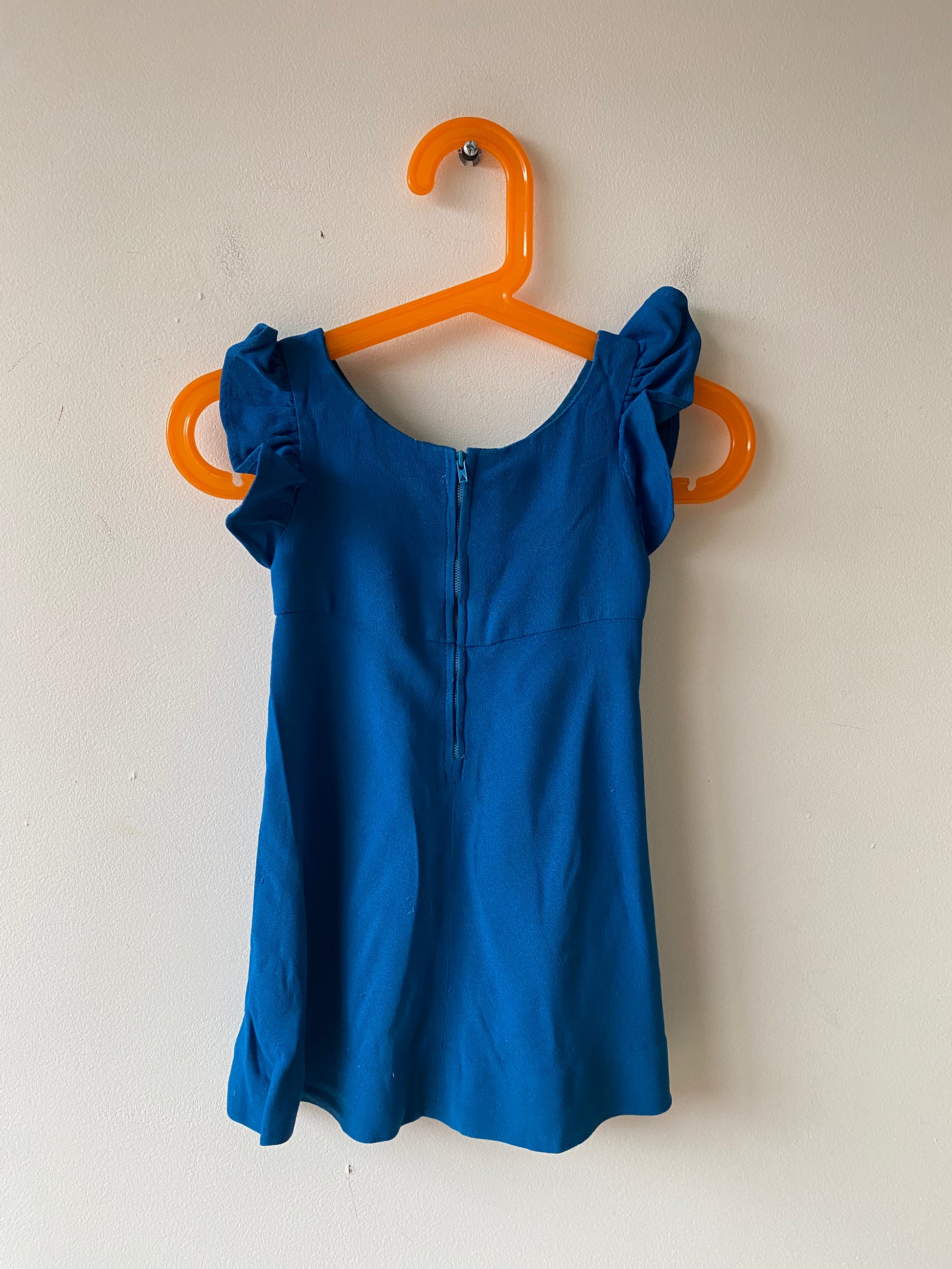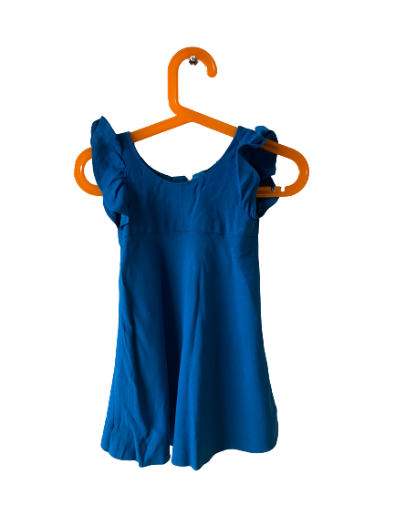 Robe bleu électrique sans manches, froufrou sur les emmanchures, col rond, fermeture éclair dans le dos.