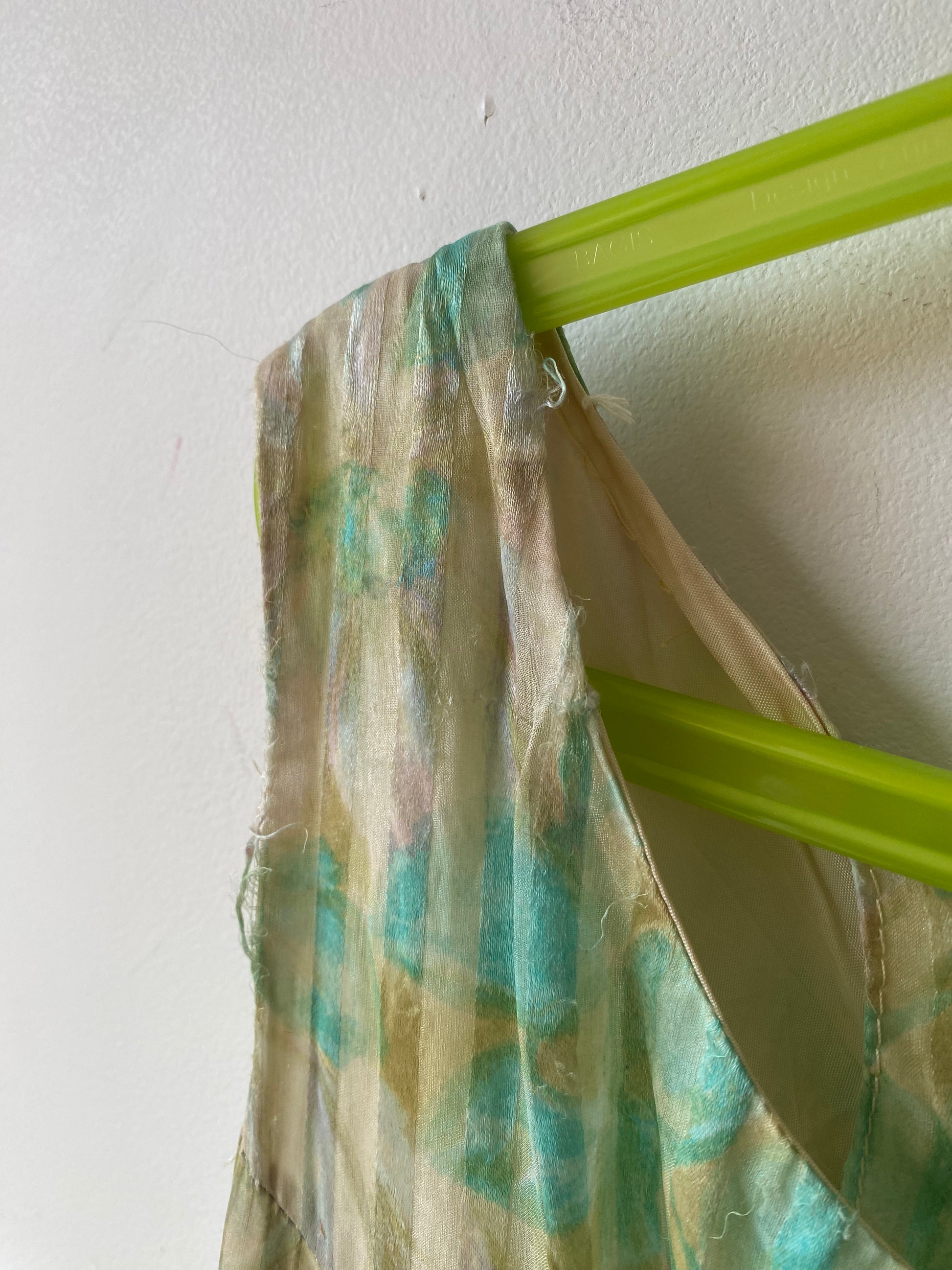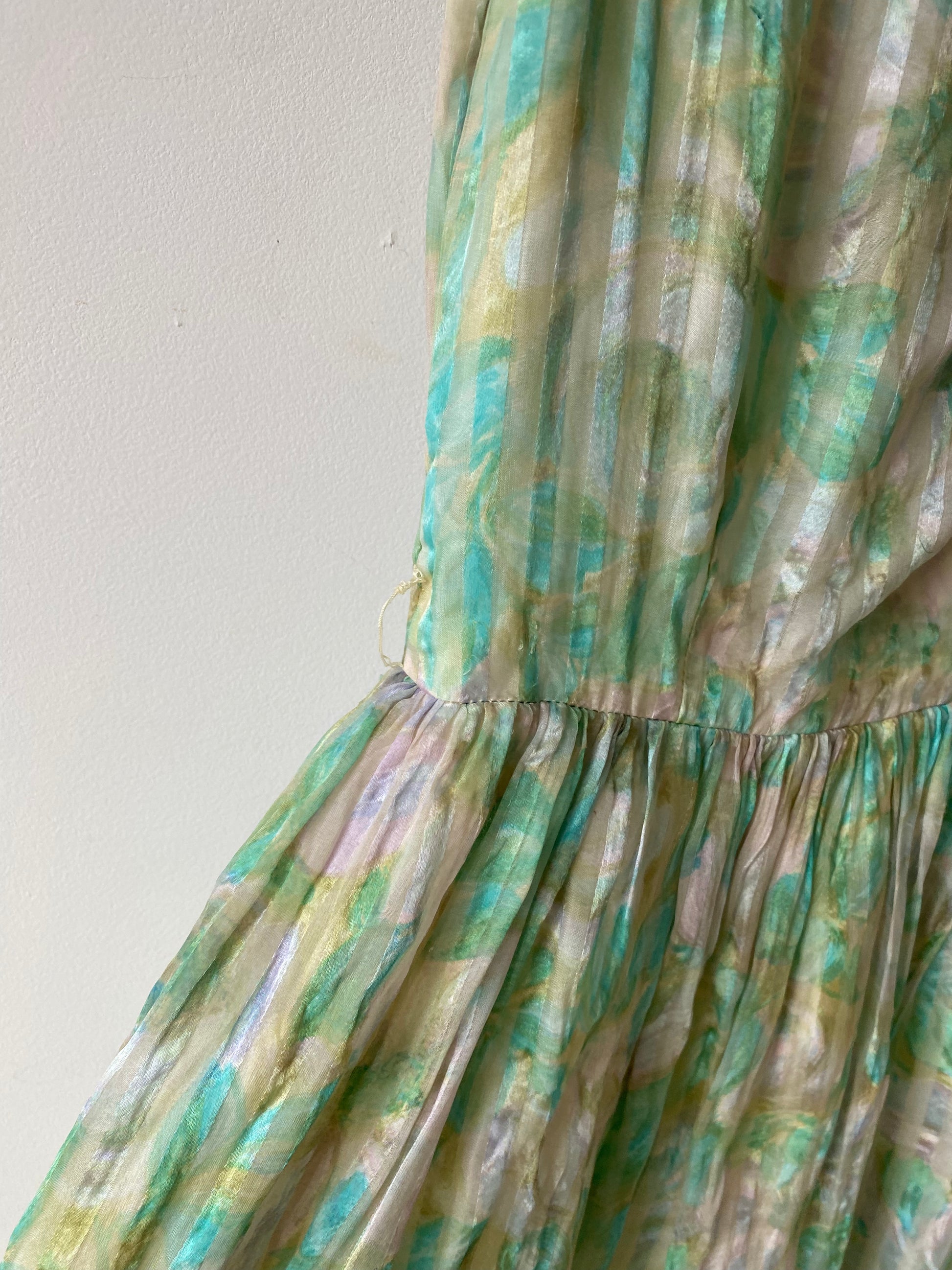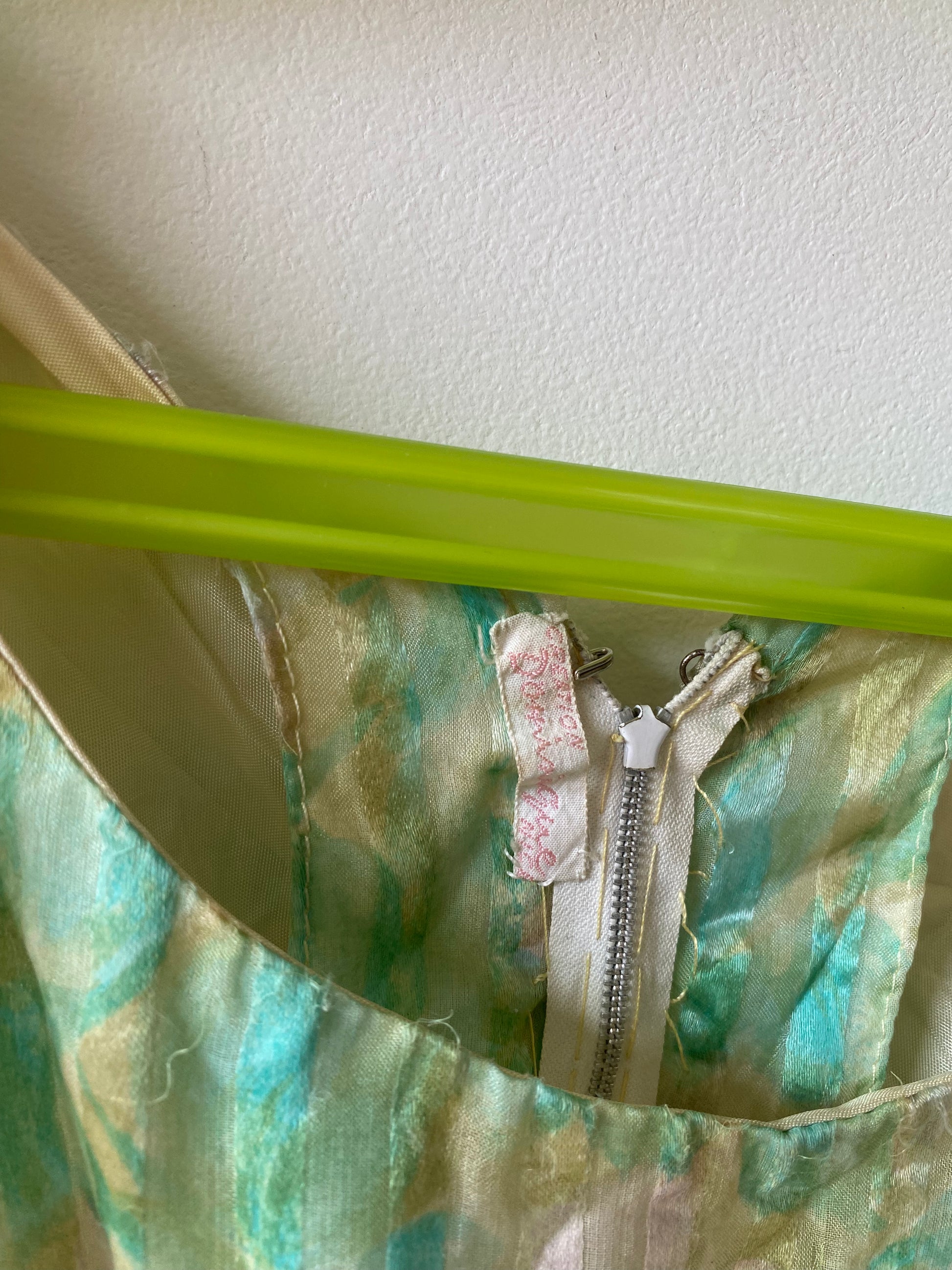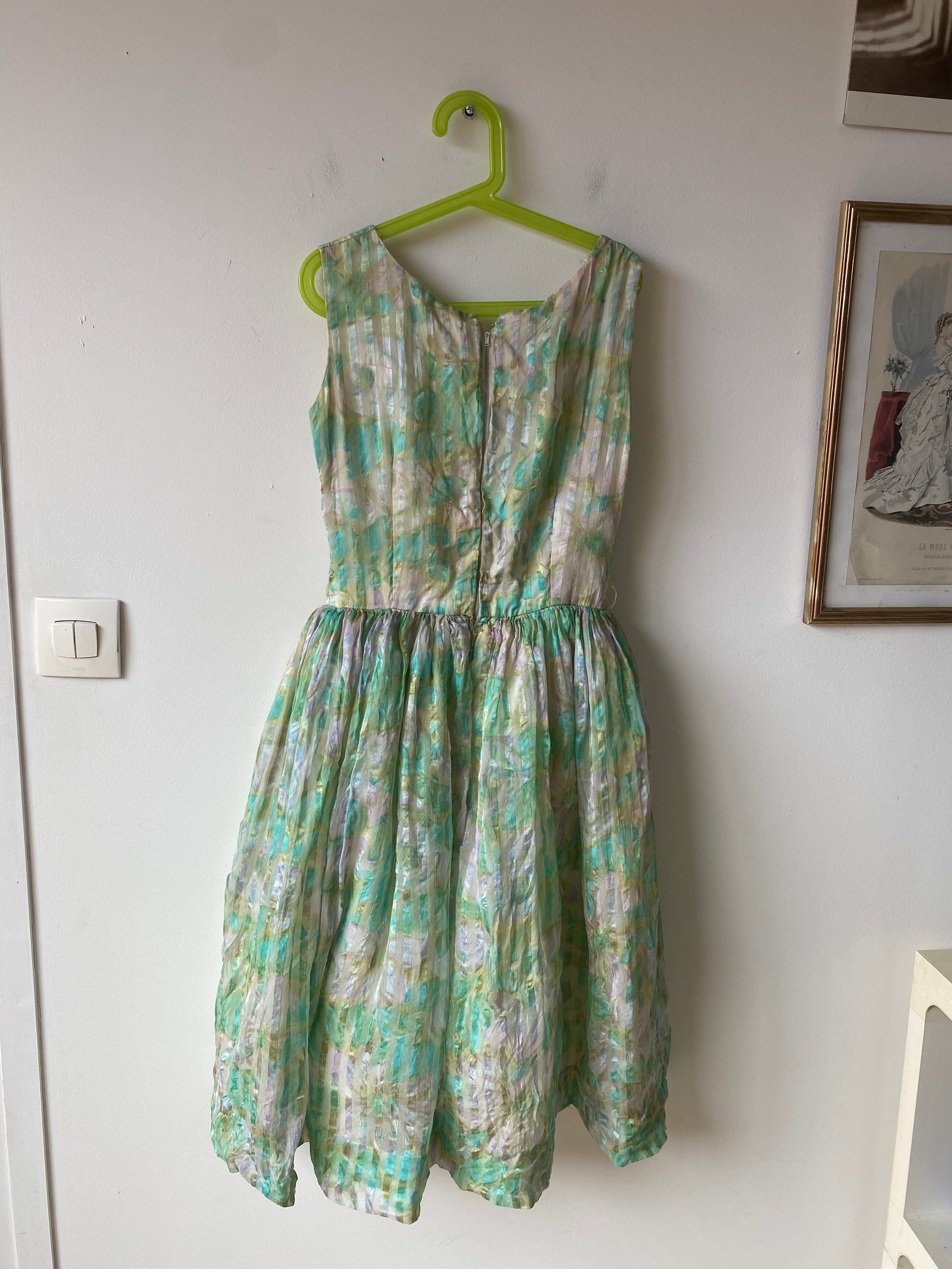 Robe longue bouffante avec deux jupons, sans manche, imprimé fleuri abstrait vert, plissé à la taille, fermeture éclair dans le dos, une broche en métal argenté sur l'avant, col rond.