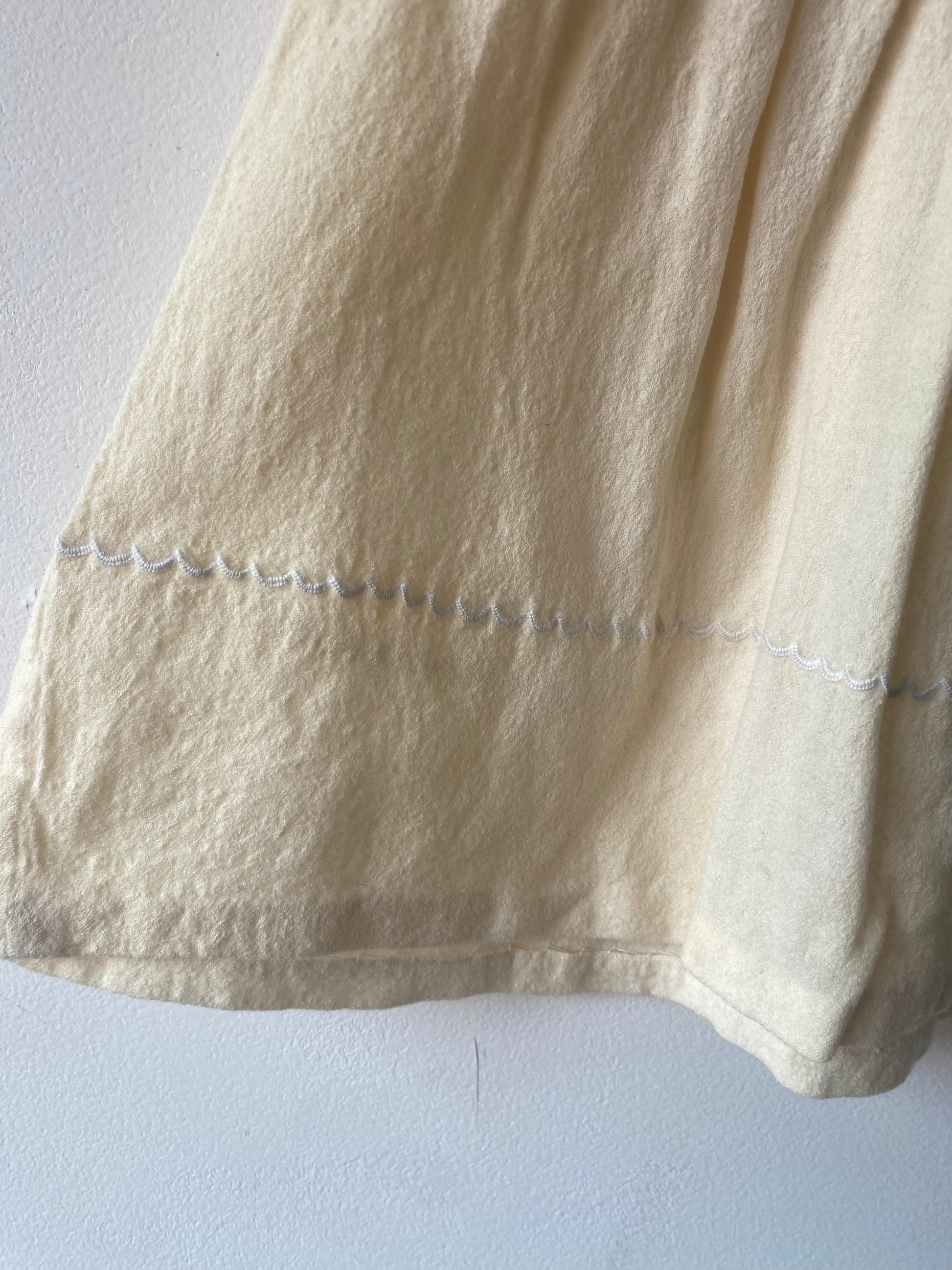Robe jaune pastel à manche courte, petit col Claudine, broderie ajourée sur le haut, boutonné dans le dos.