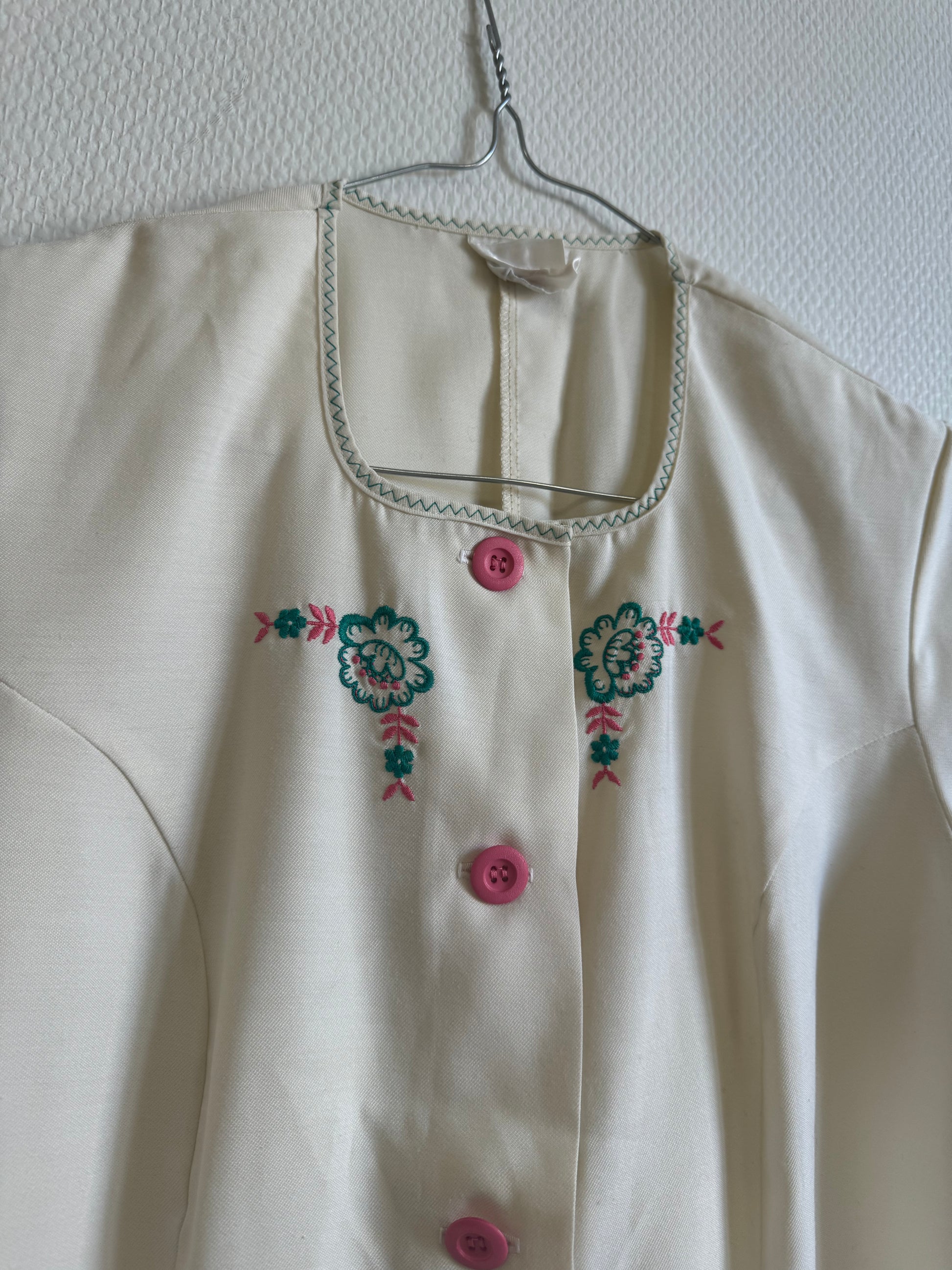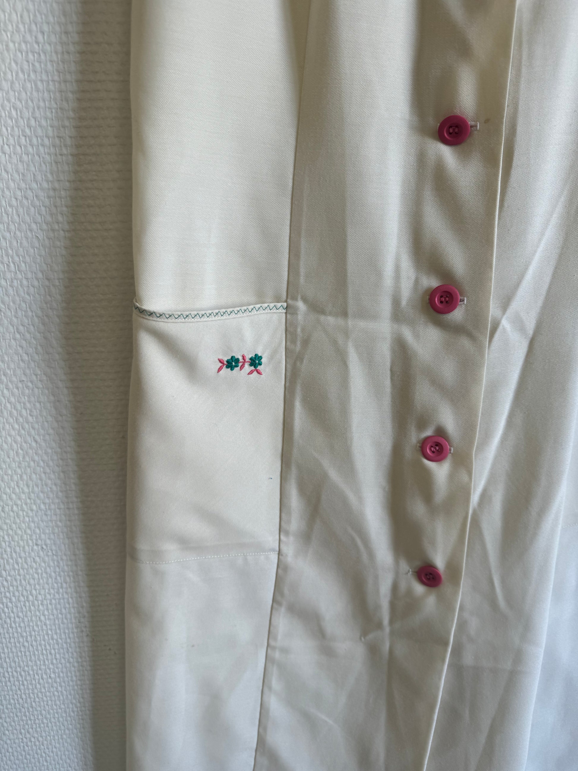 Robe mi longue des années 70, manche courte, broderie florale, boutons rose, deux poches, légèrement transparente.