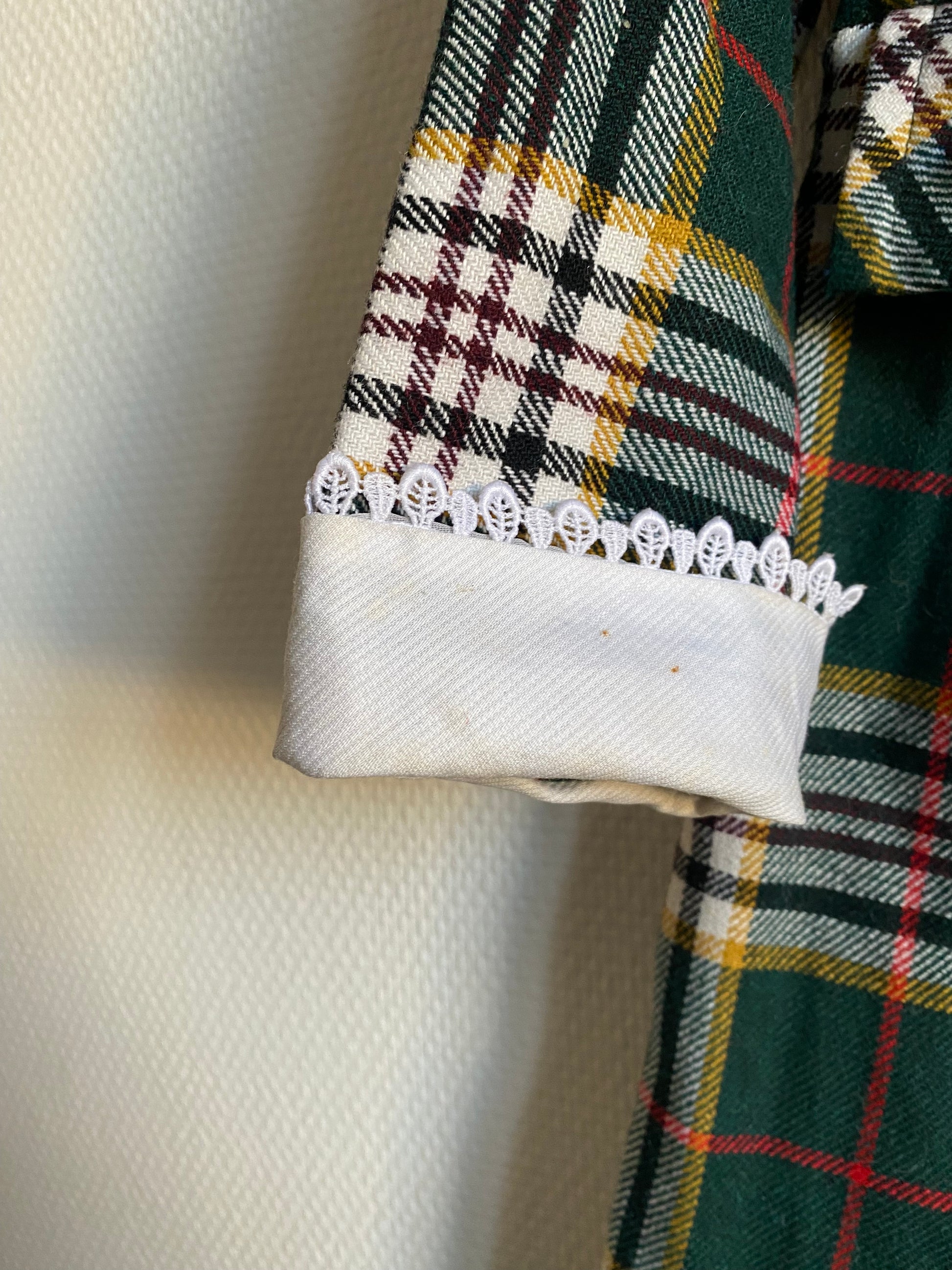 Robe mi longue écossaise verte, col rond, bout de manche blanc, boutonnée dans le dos, made in france.