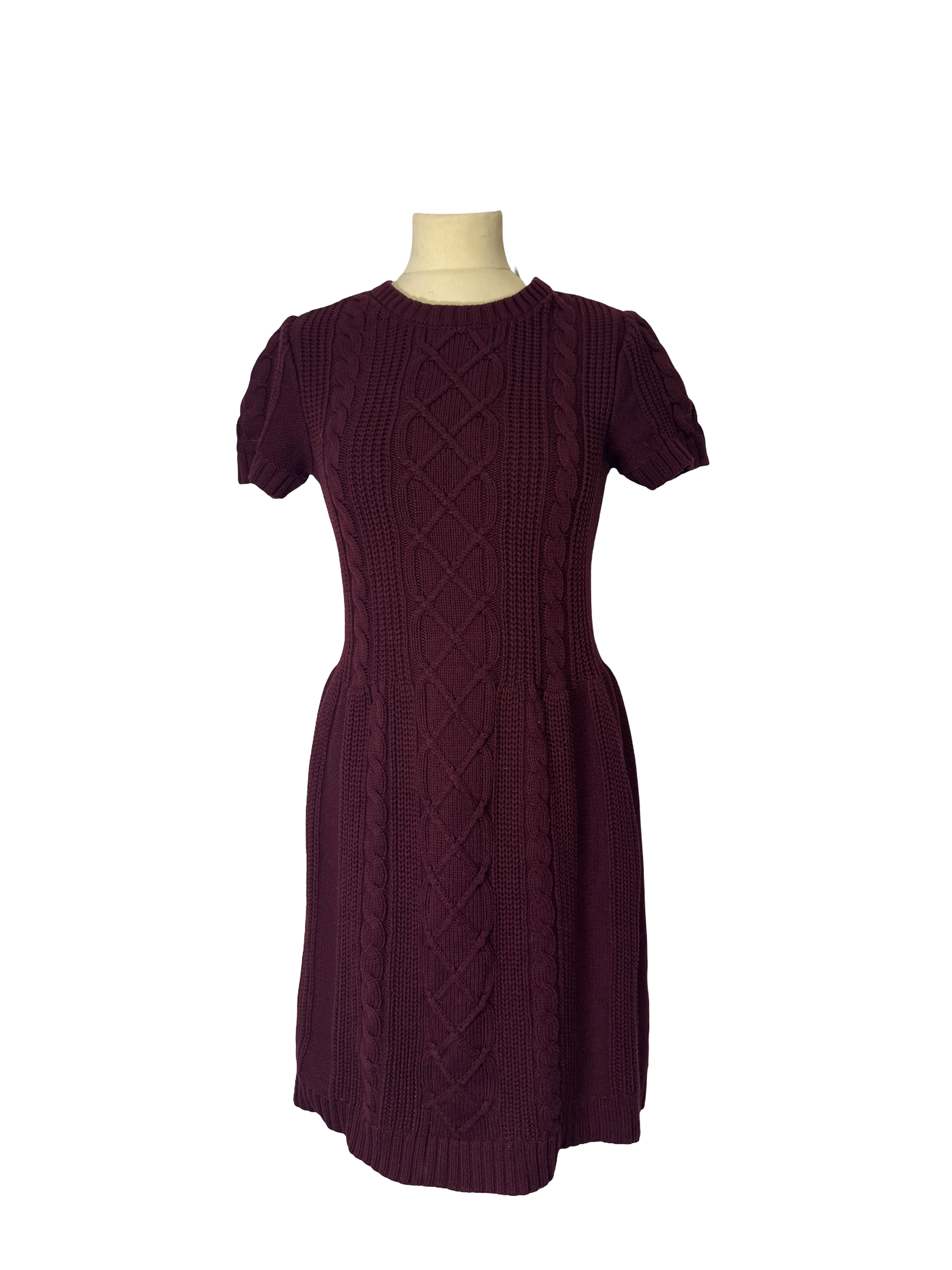 Robe mi longue en maille torsade bordeaux, col rond, manches courtes.