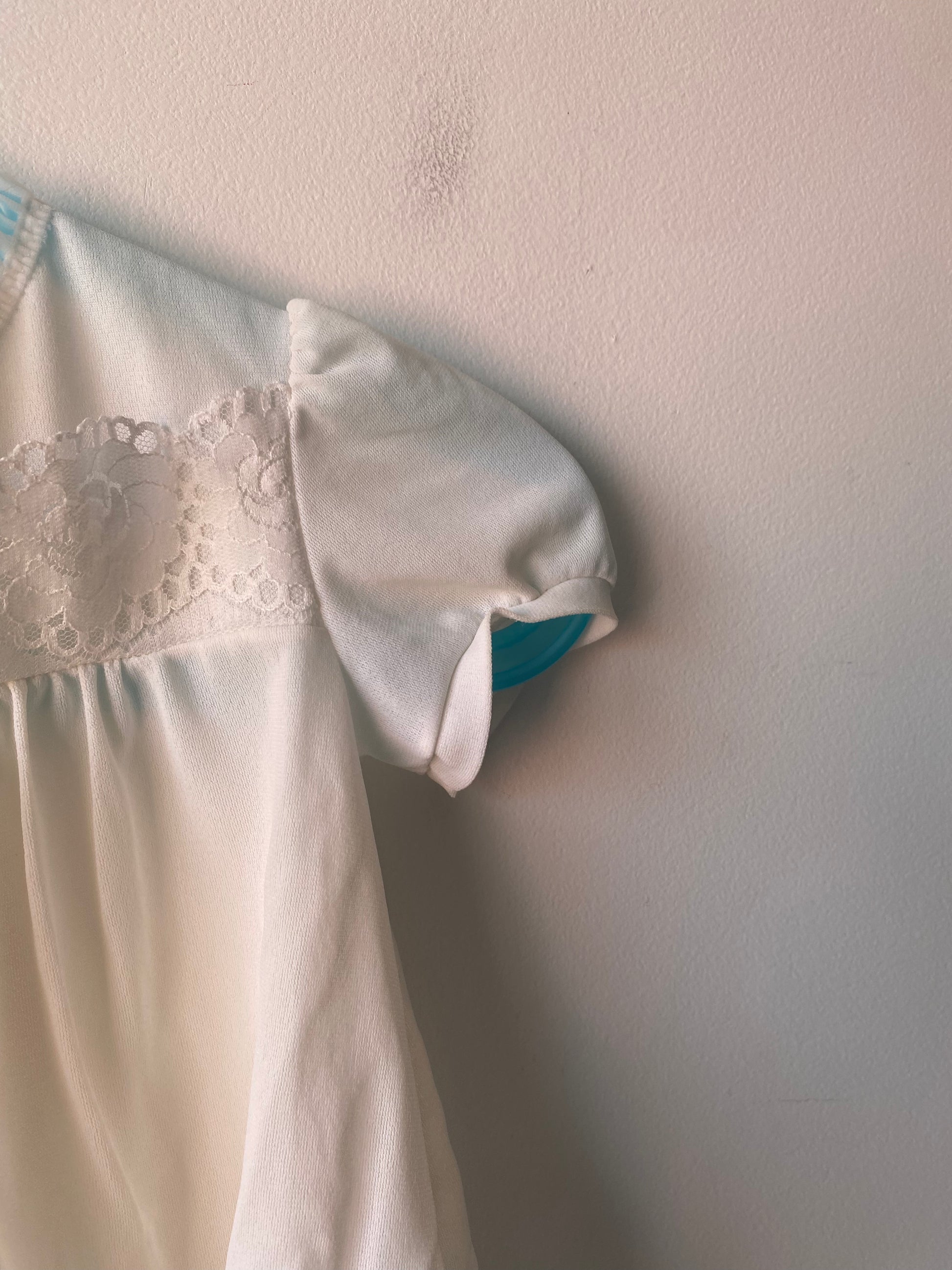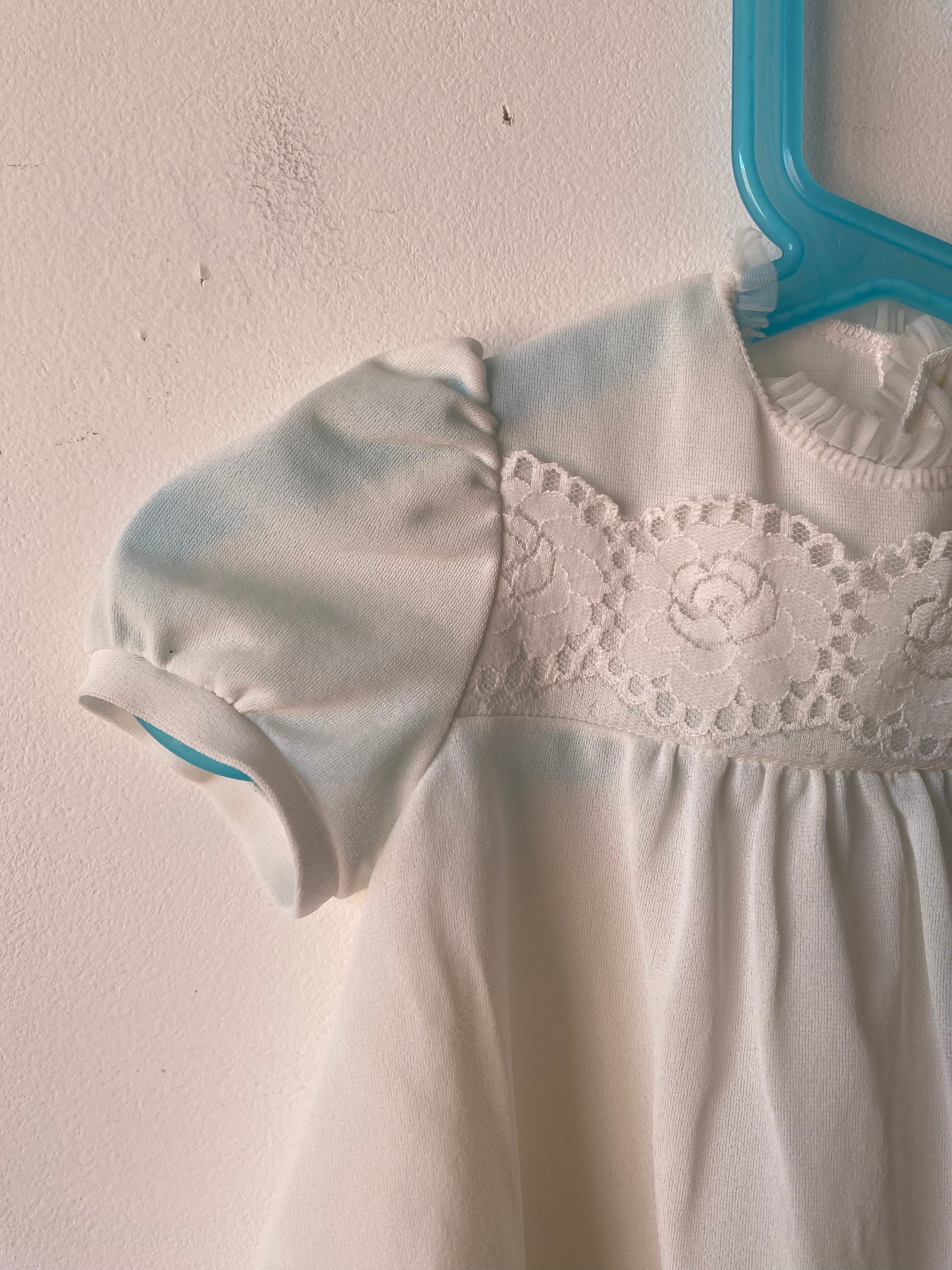 Robe blanche/crème transparente avec détails de dentelle fleurs, col rond, un bouton dans le dos.