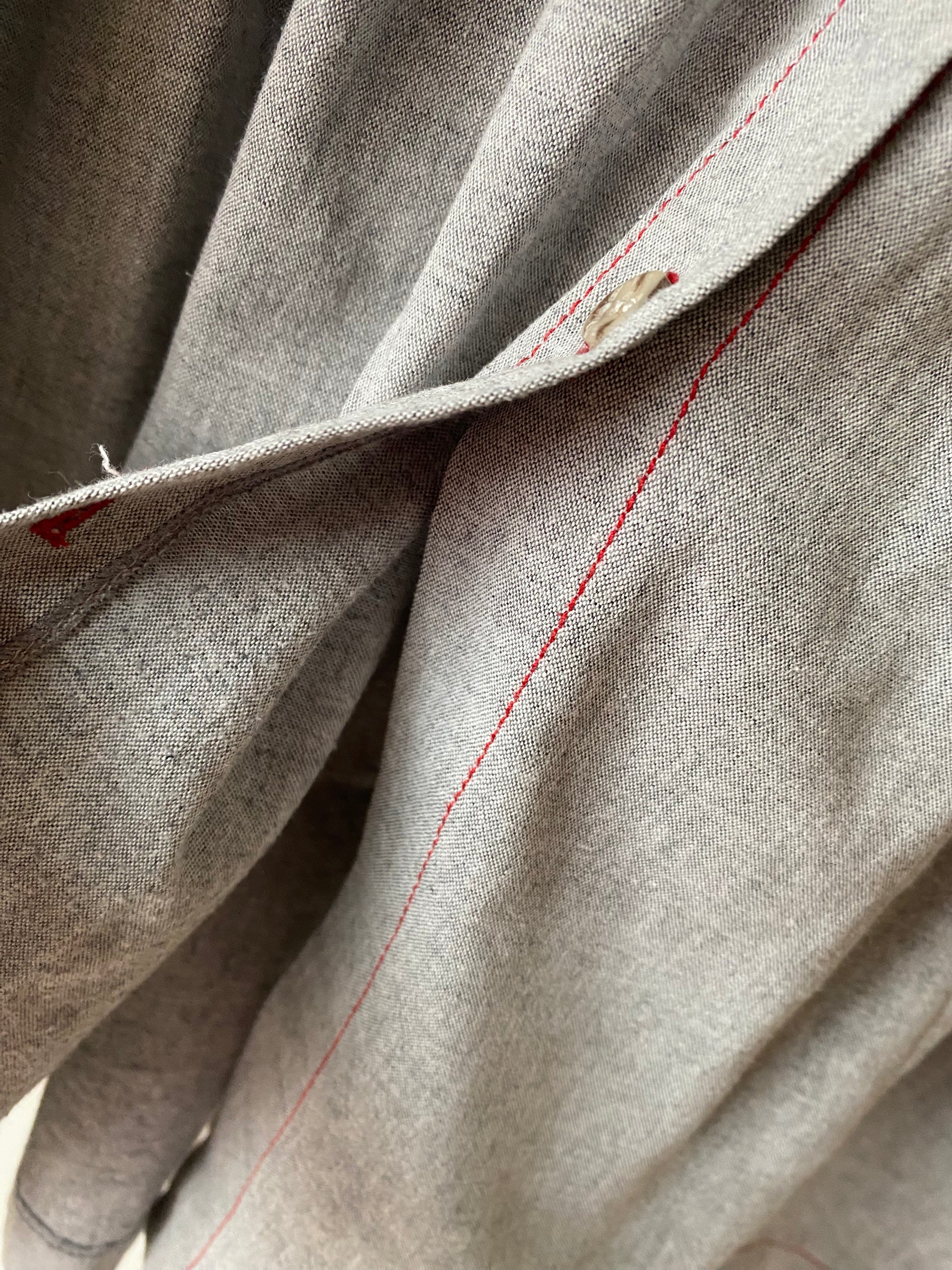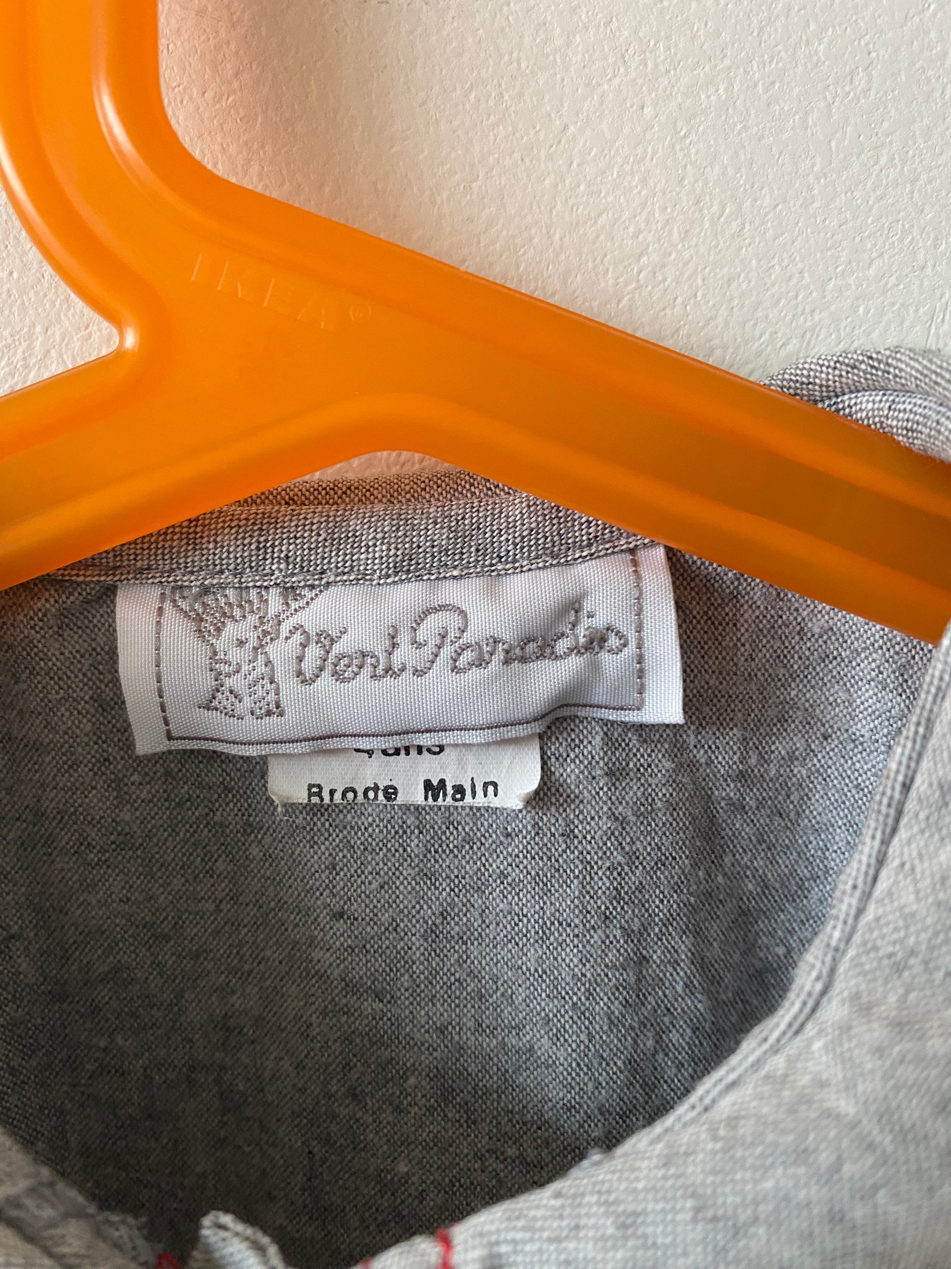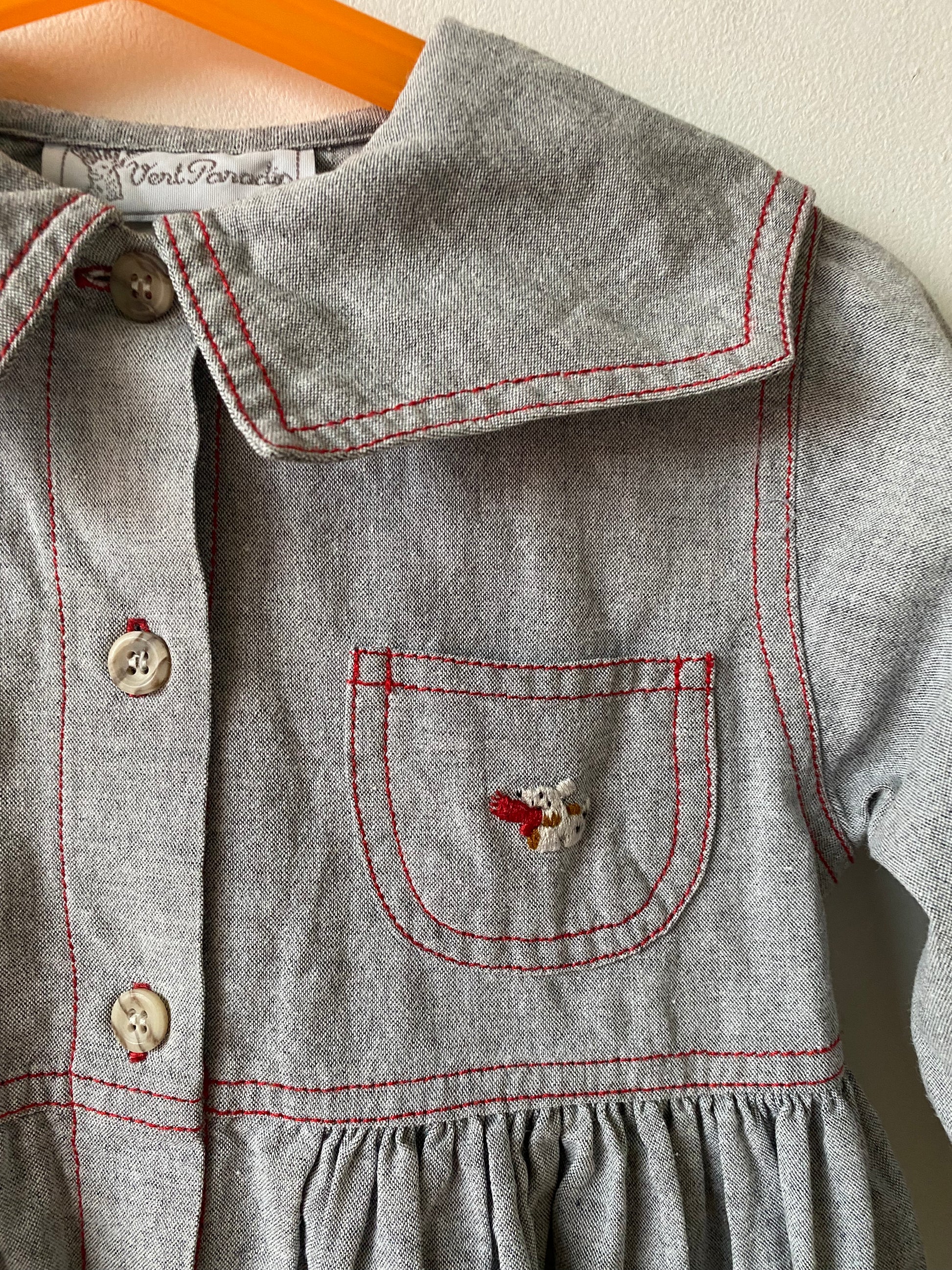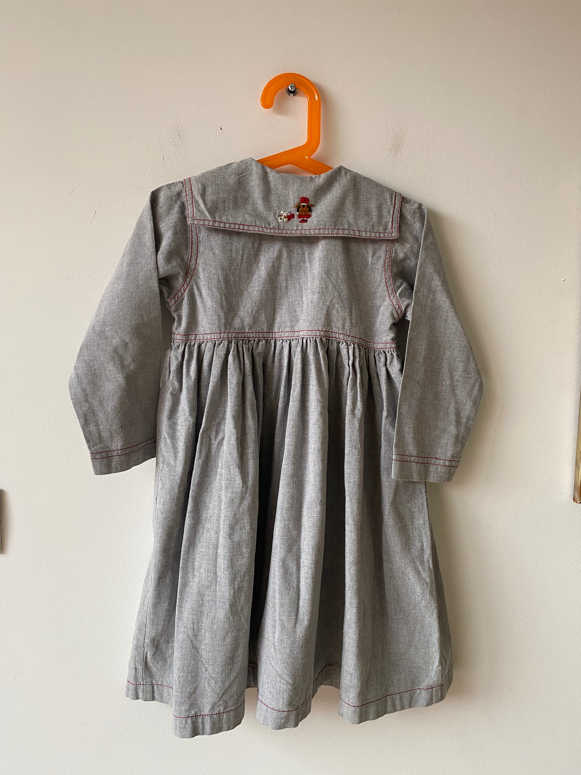 Robe à manche longue grise, grand col, deux petites poches au niveau de la poitrine, jupe plissée, broderie sur les poches et sur le dos du col.