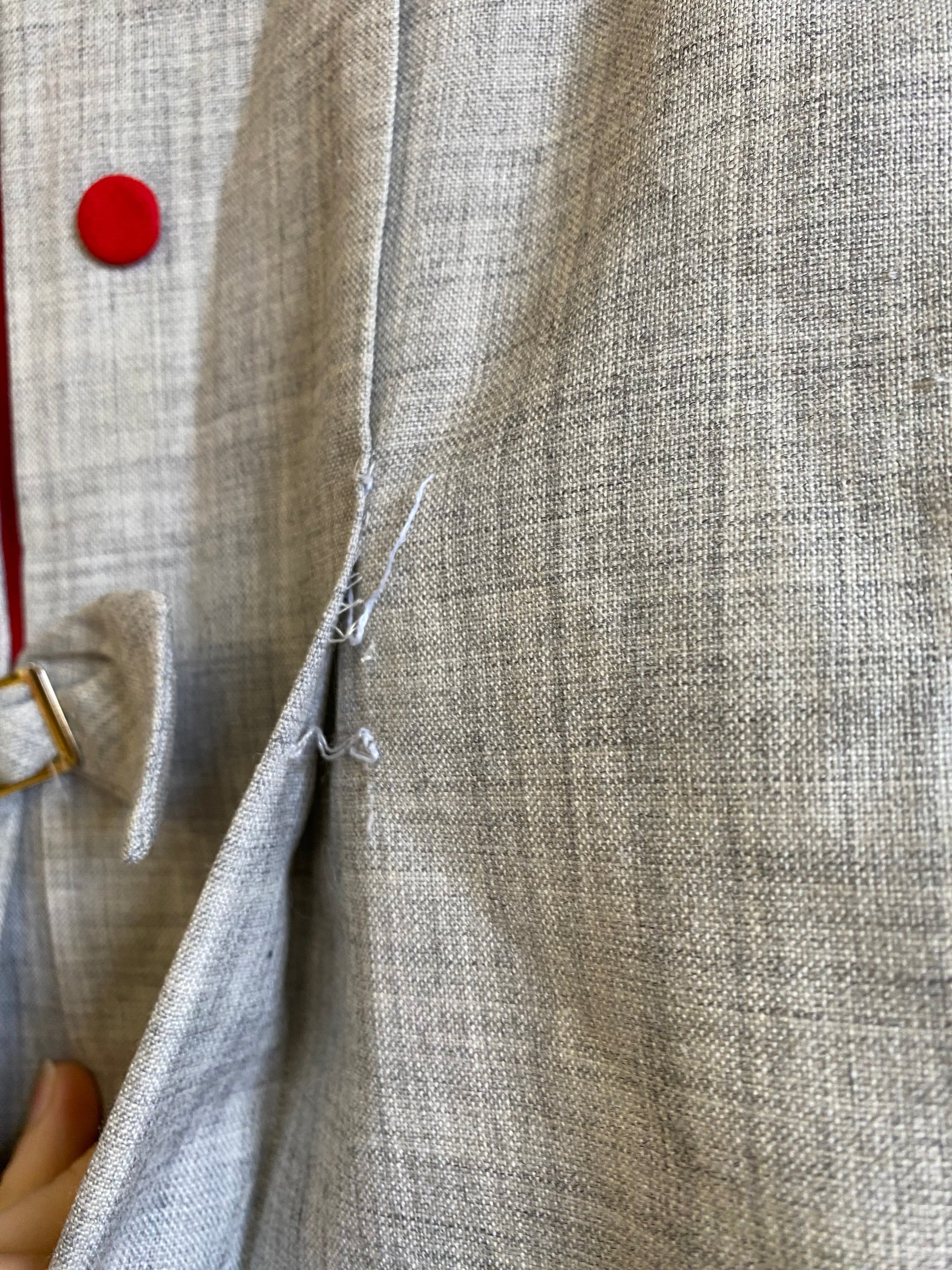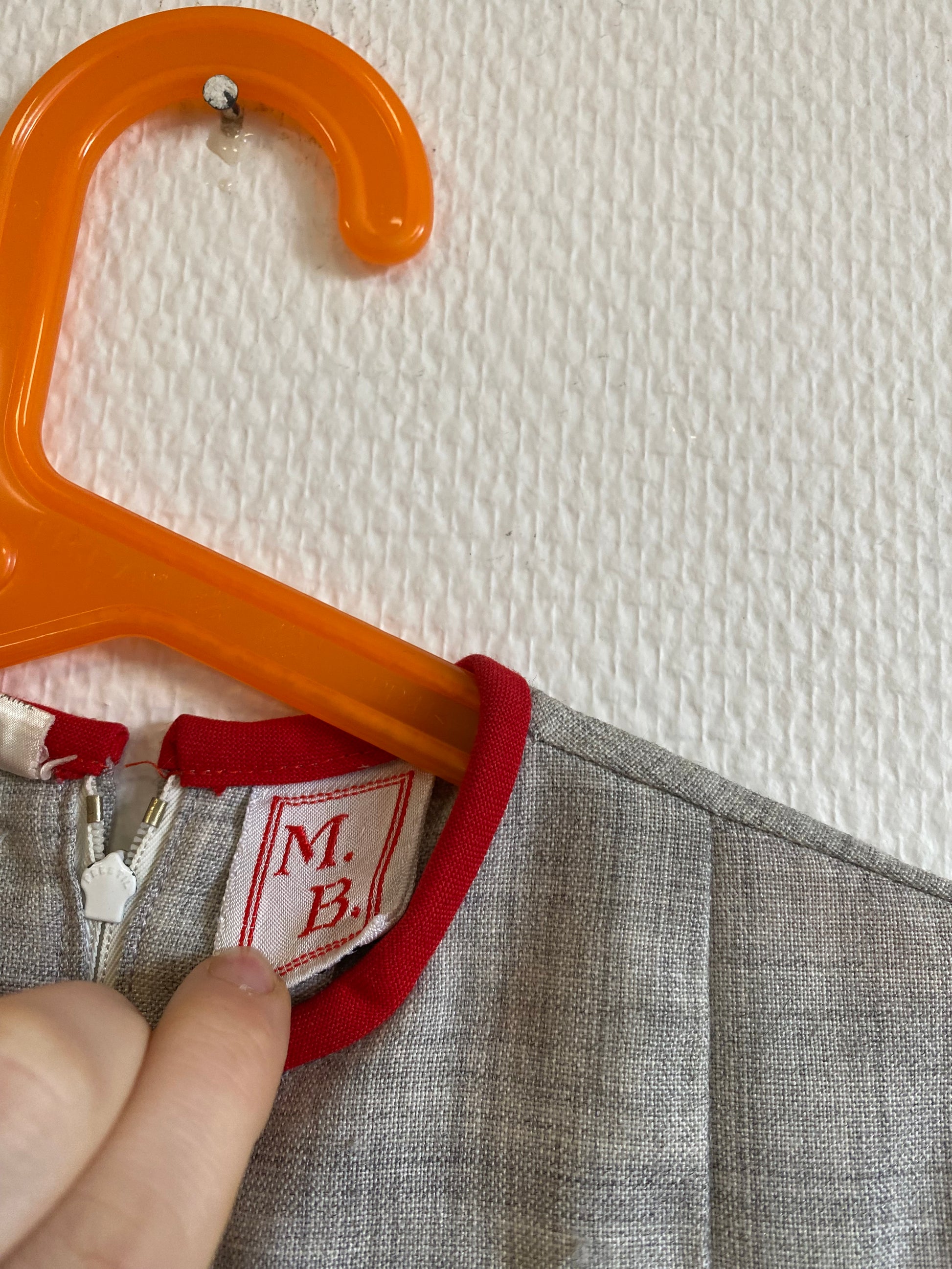 Robe grise à détails rouge, col rond, manche courte, boutons décoratifs, fermeture éclair dans le dos.