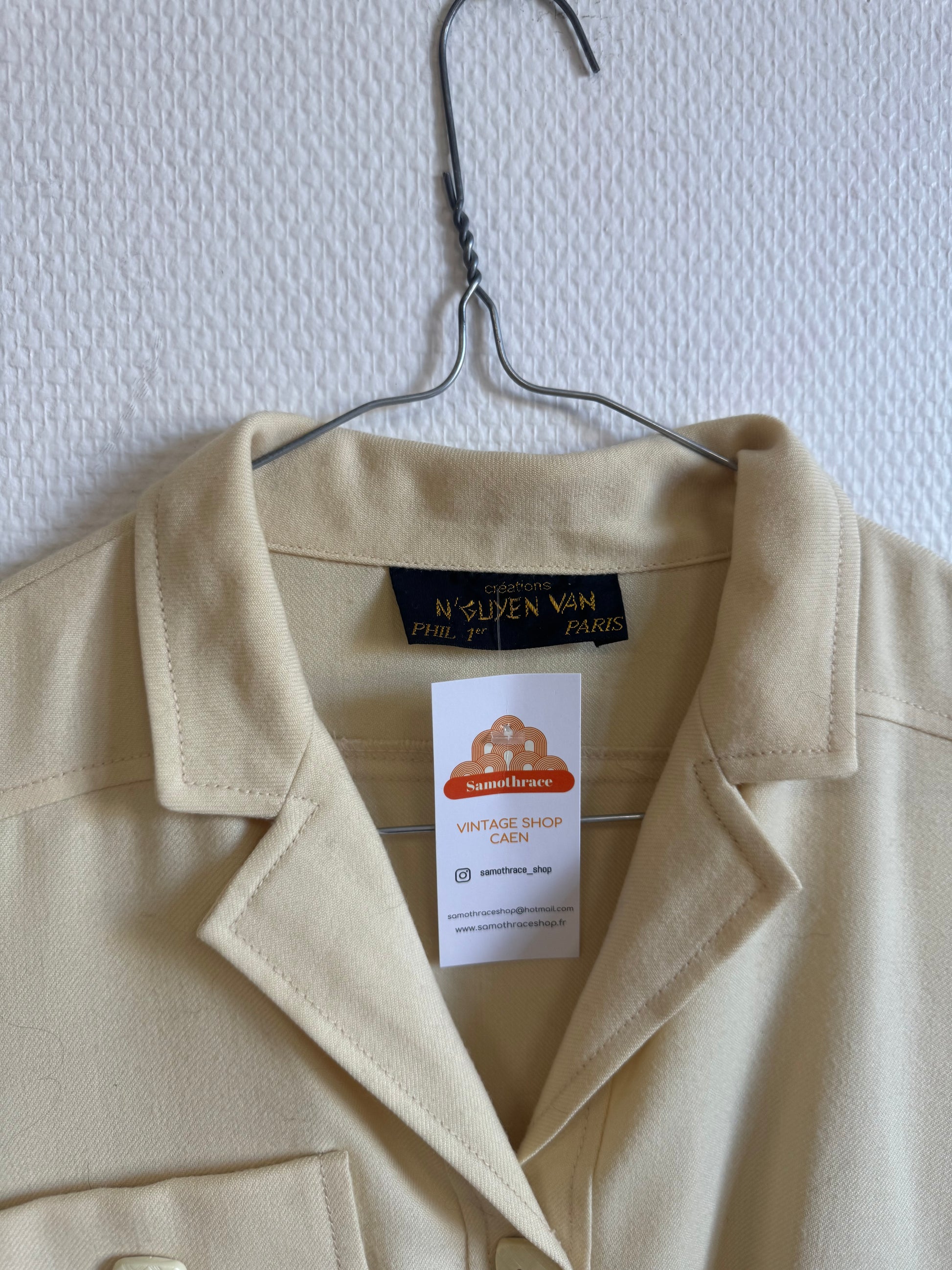 Robe longue jaune pale, sans manche, boutonnée, ajustable à la taille, trois poches