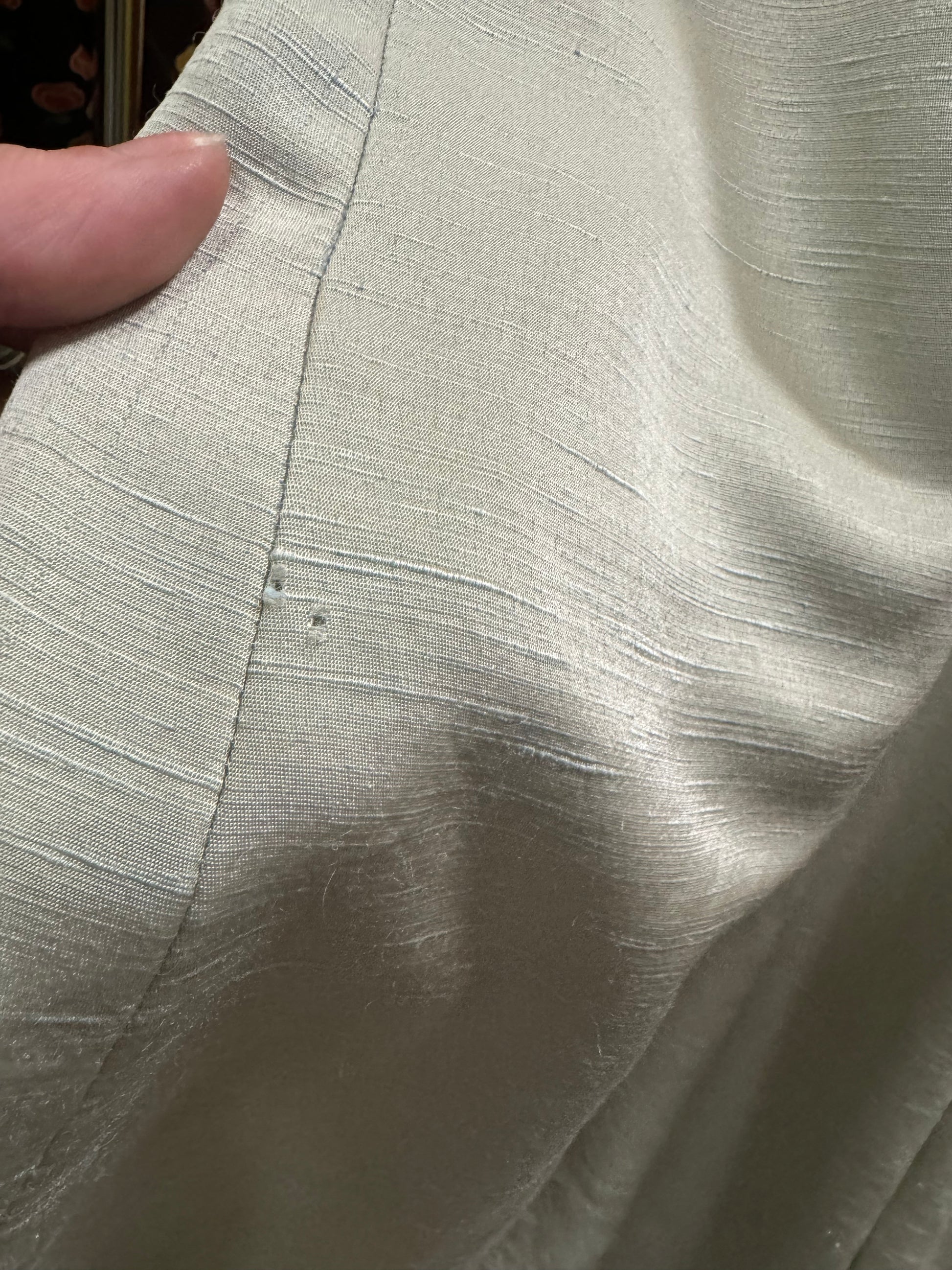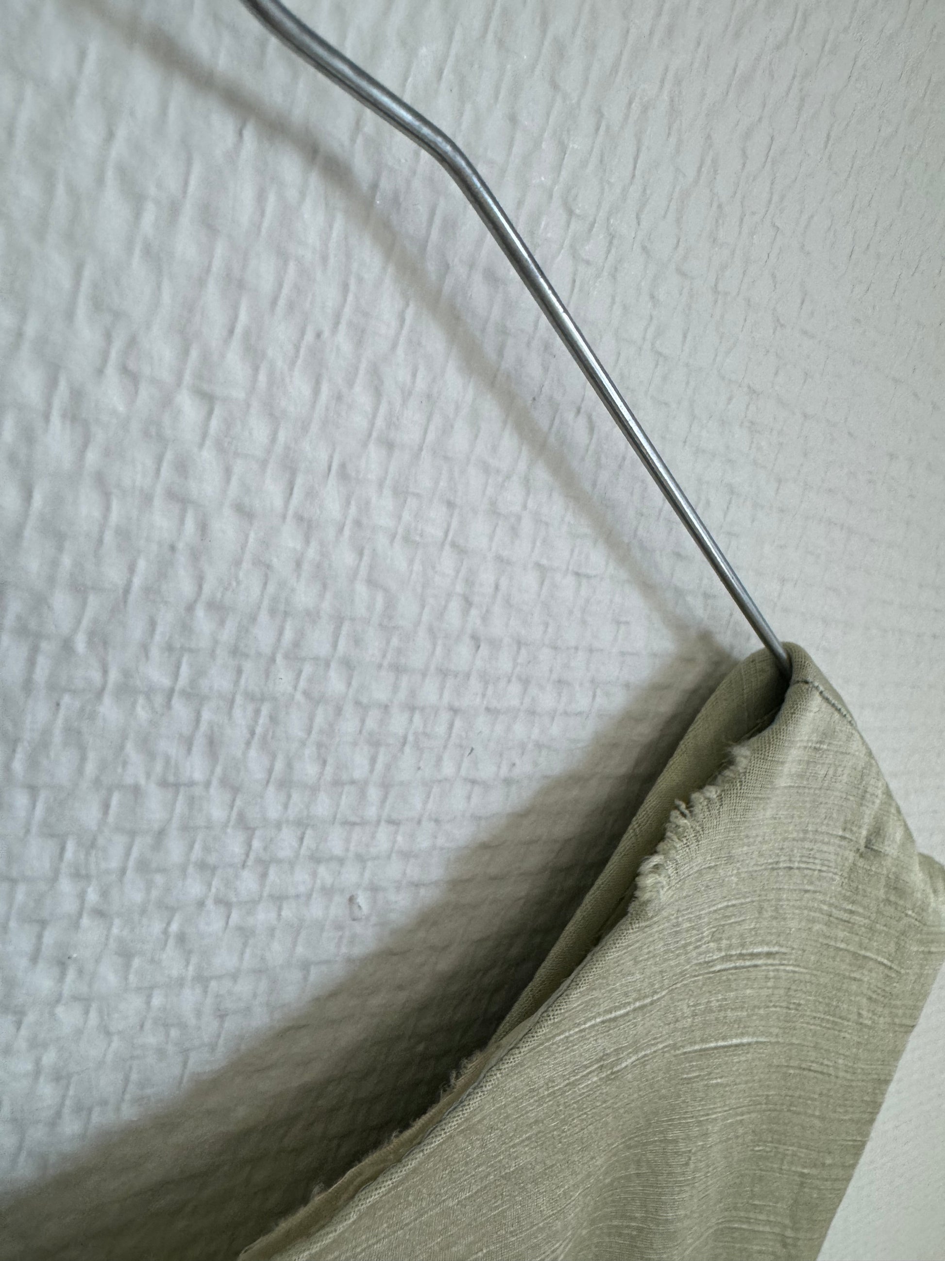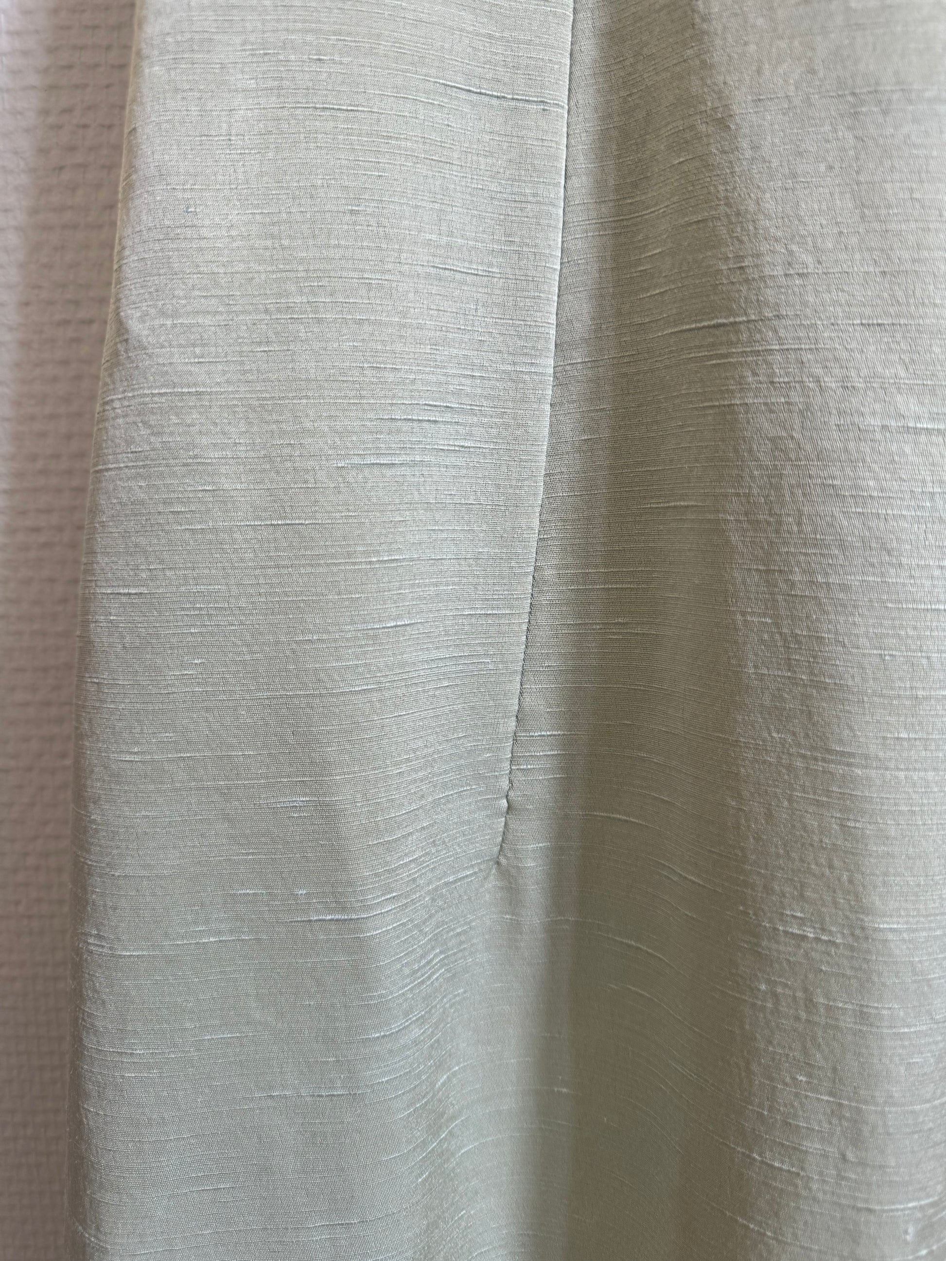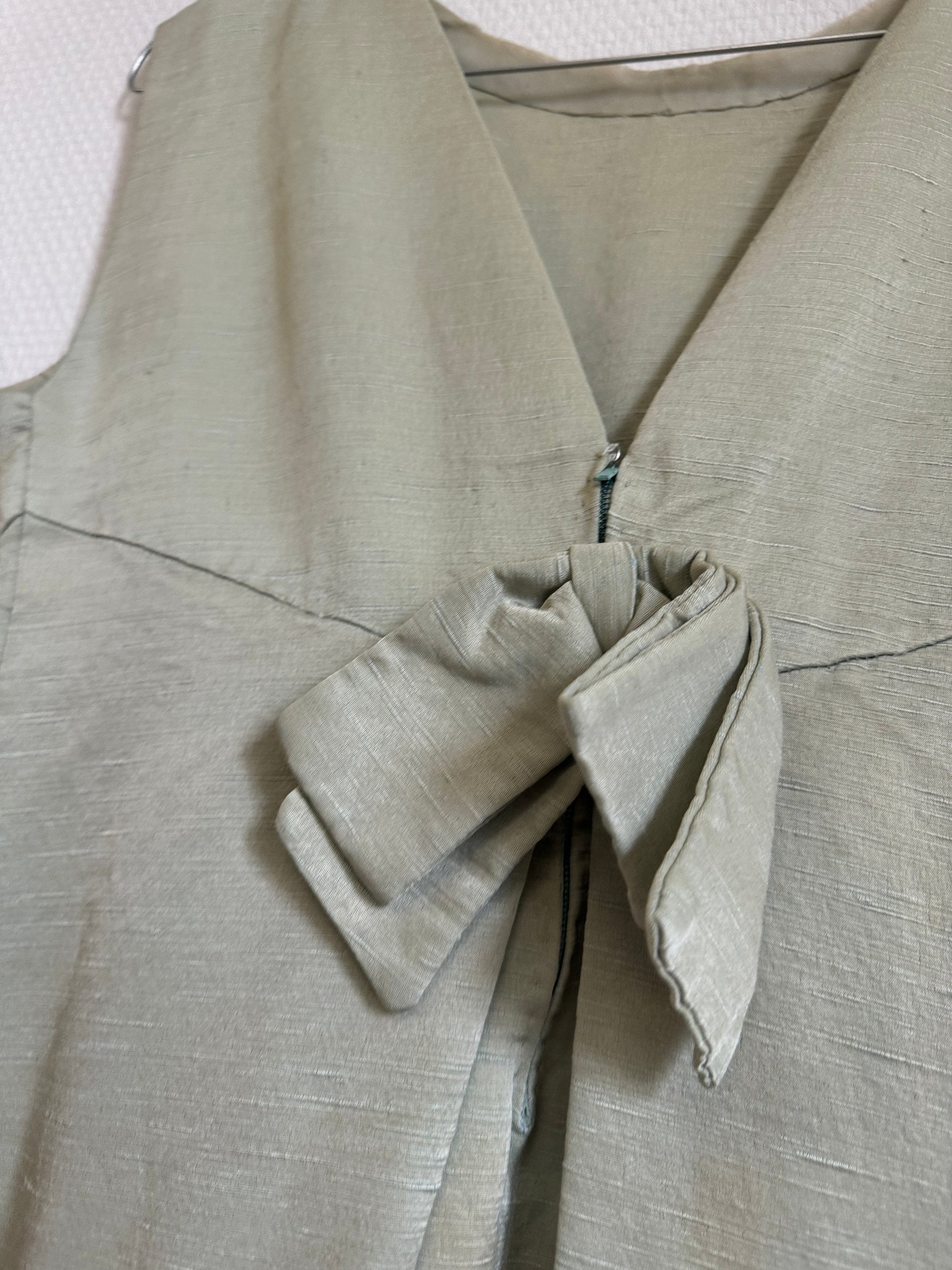 Robe longue des années 70, vert texturé, col rond, fermeture éclair et noeud dans le dos.