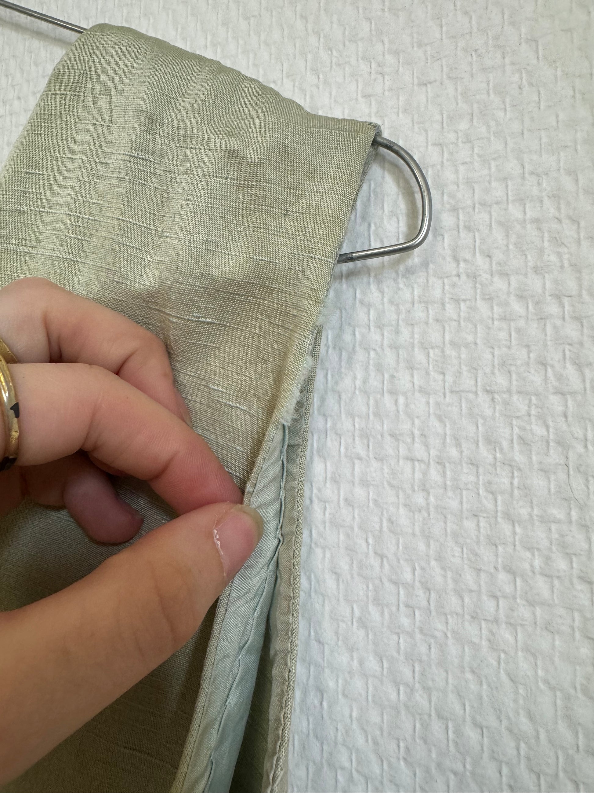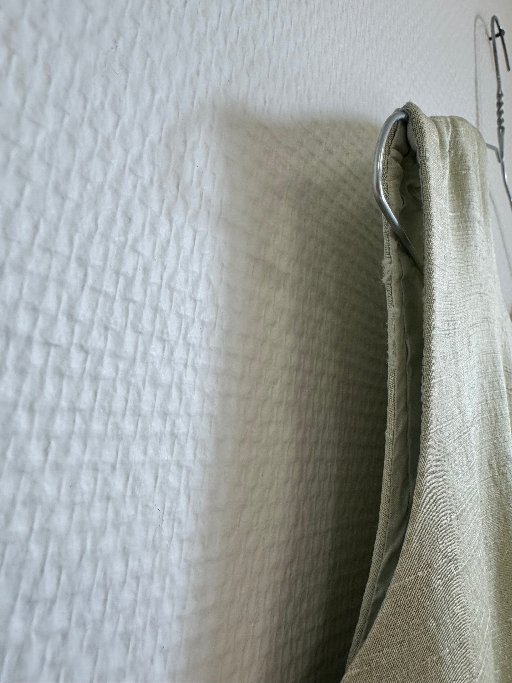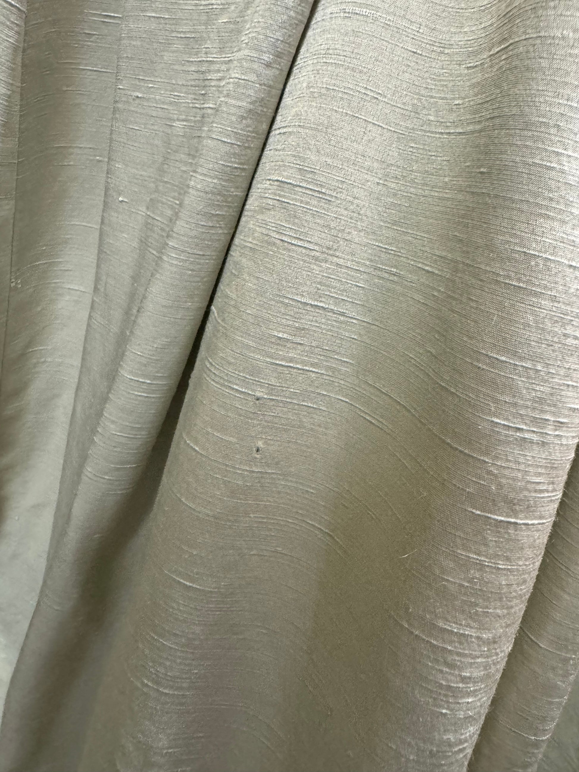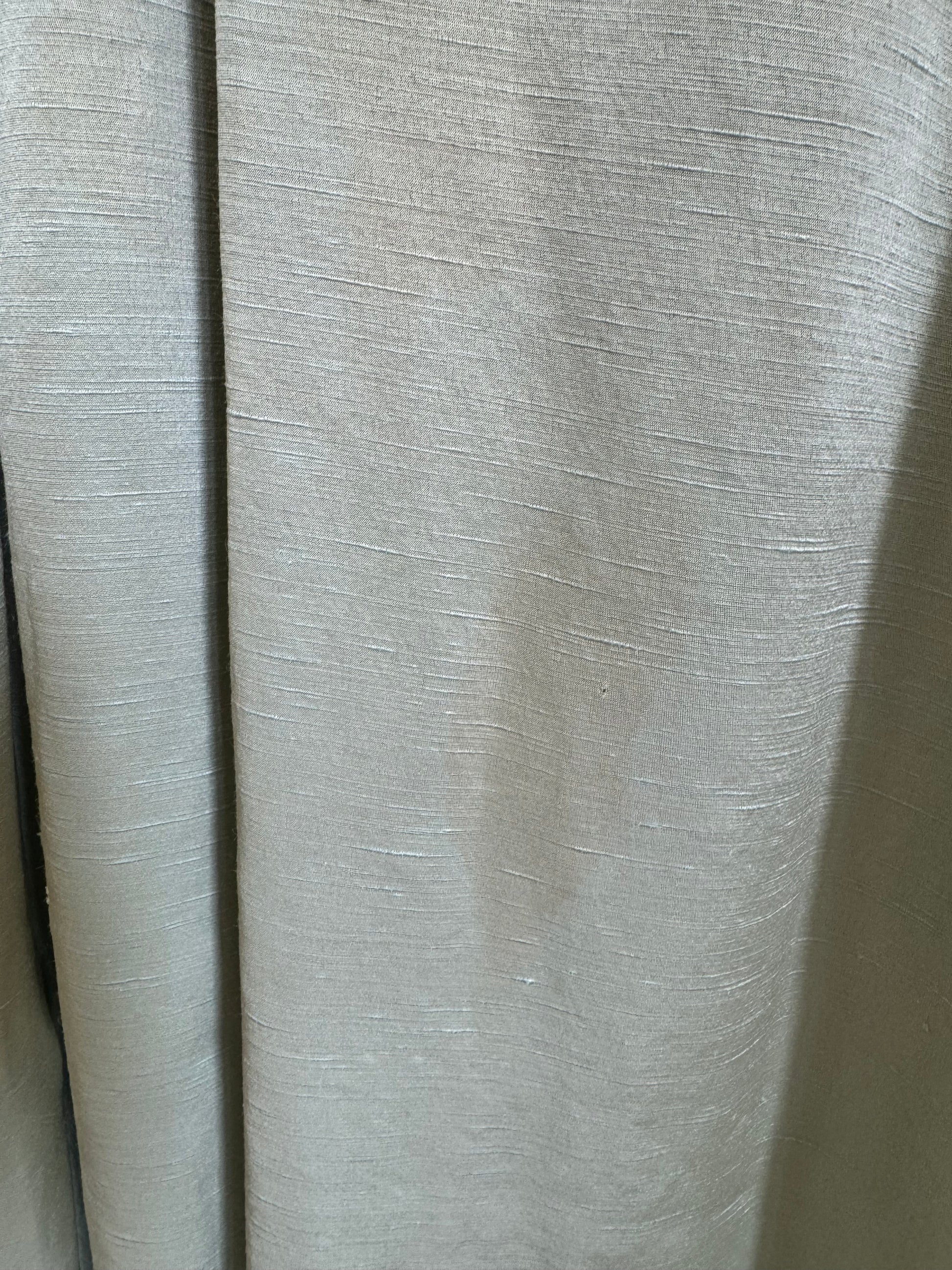 Robe longue des années 70, vert texturé, col rond, fermeture éclair et noeud dans le dos.