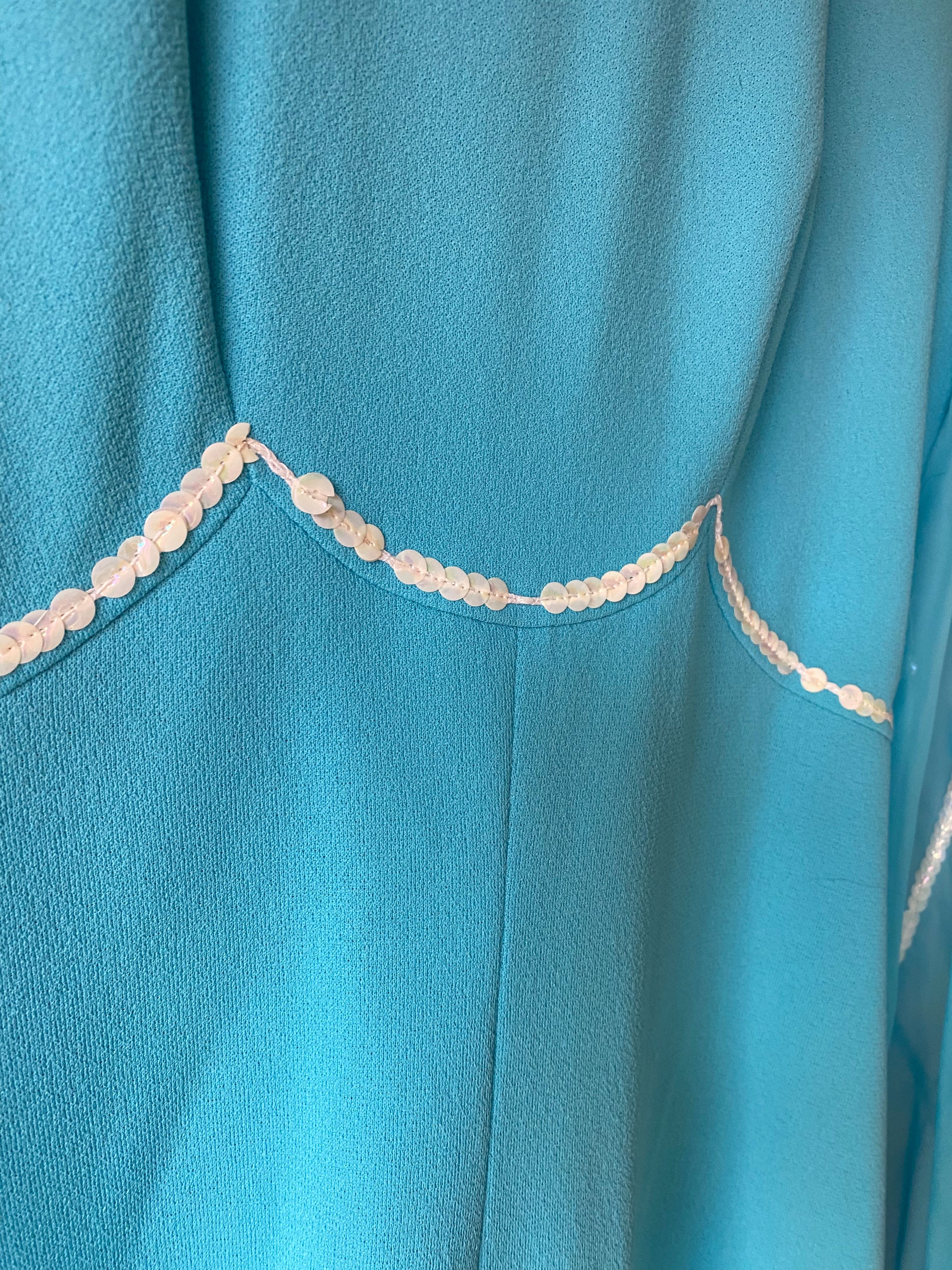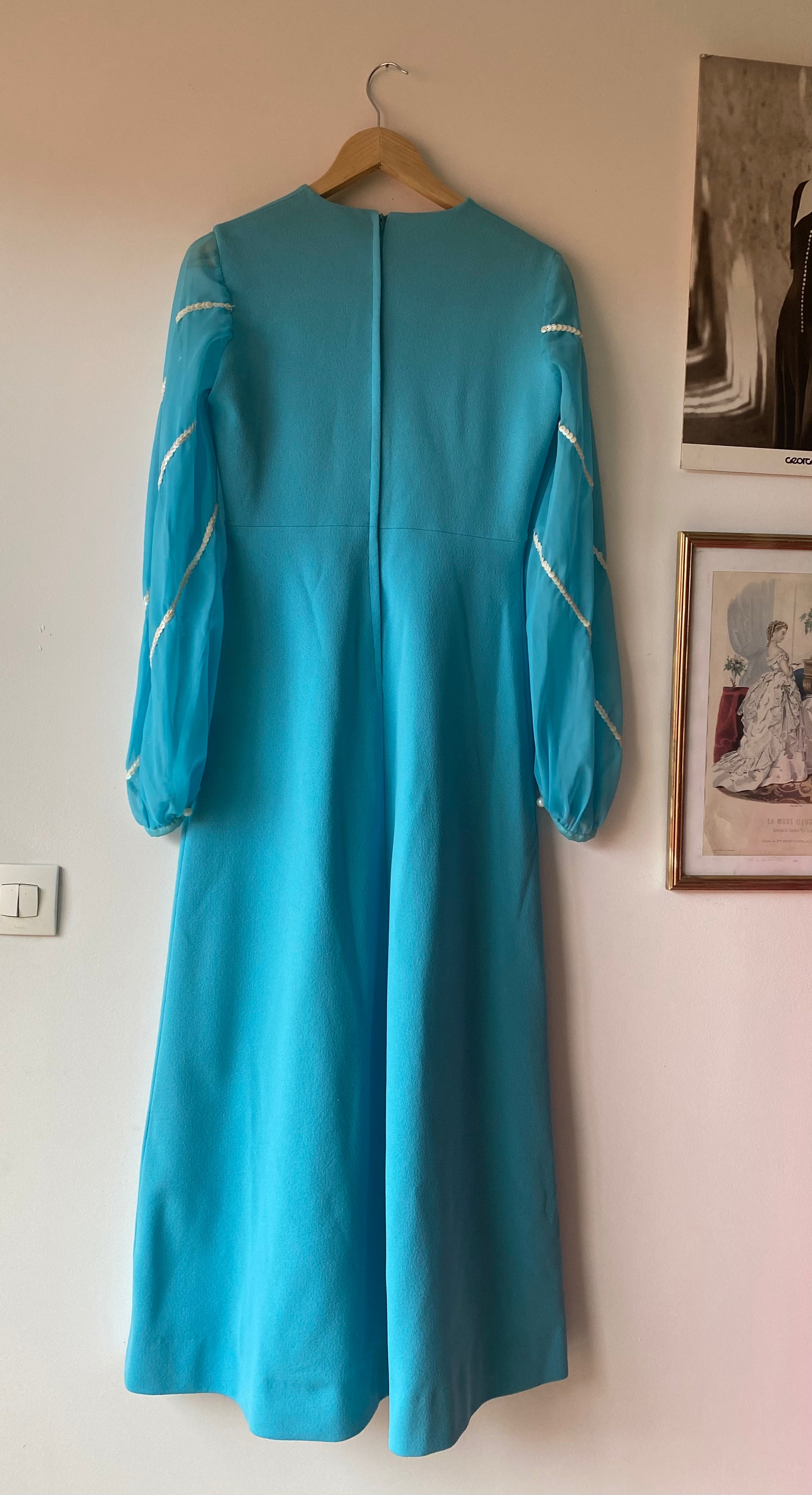 Robe longue des années 70, manches transparente, bleu turquoise, détails de paillette blanche, poitrine marquée, col rond, fermeture éclair dans le dos, coupe évasée.