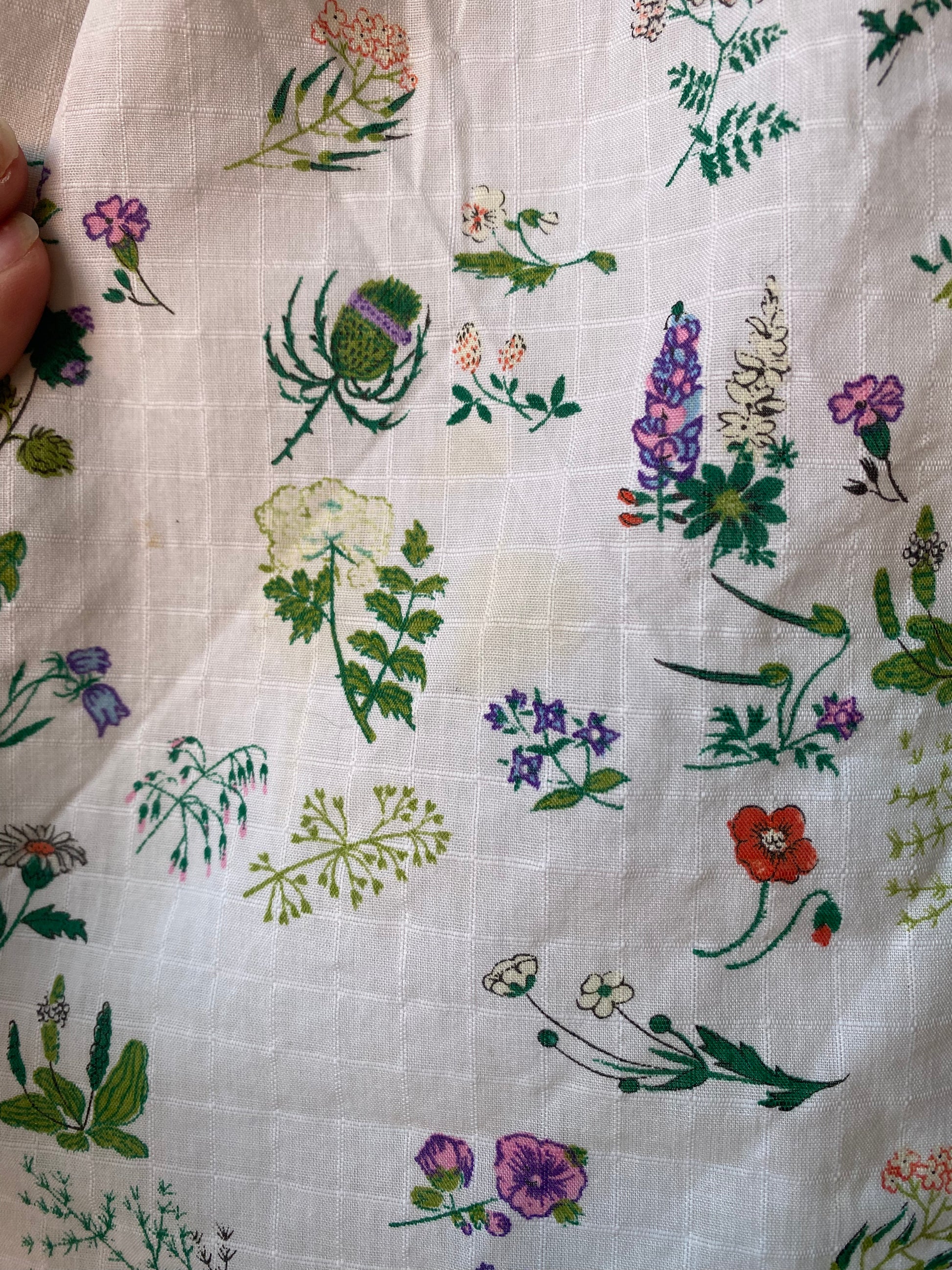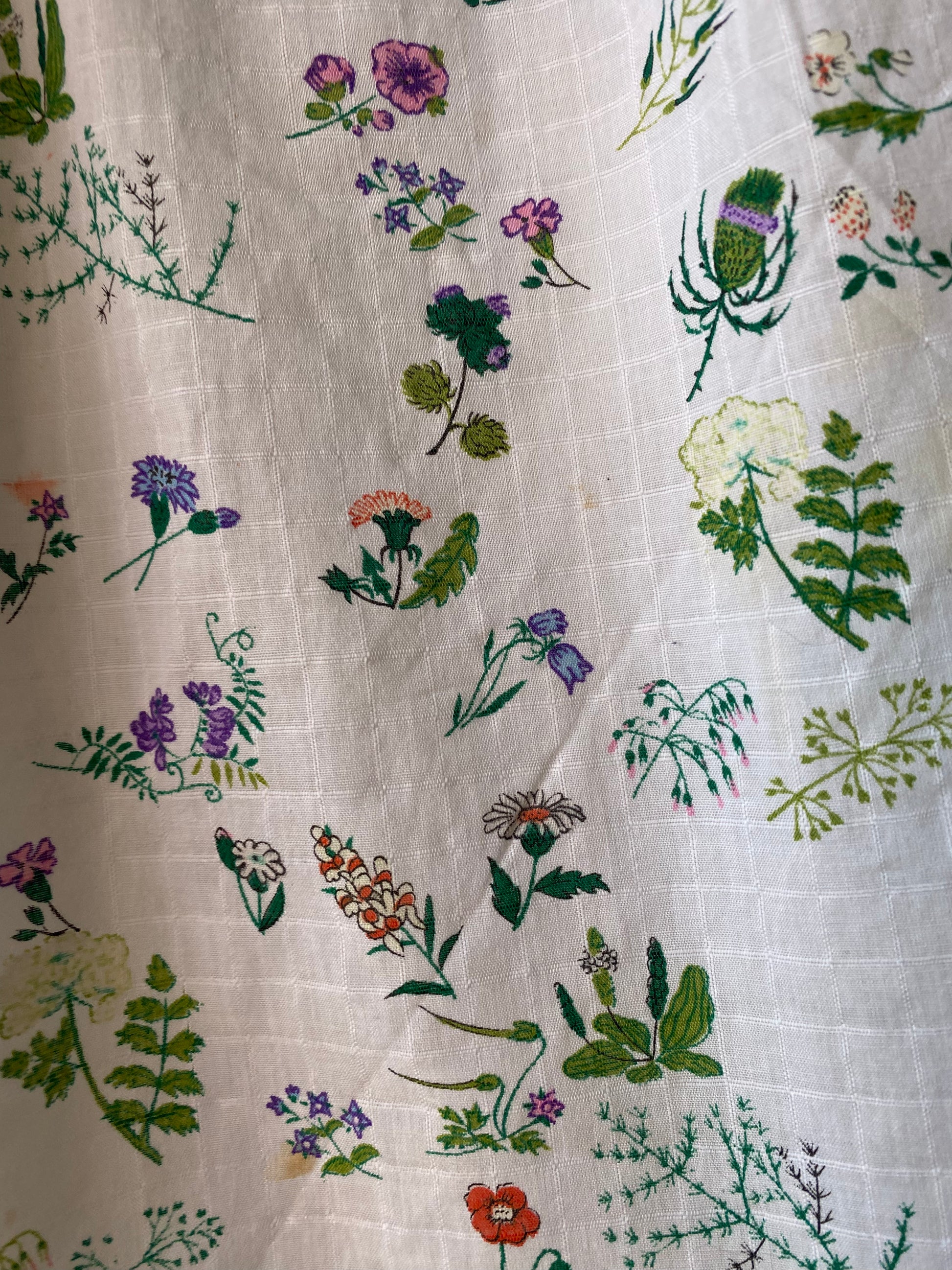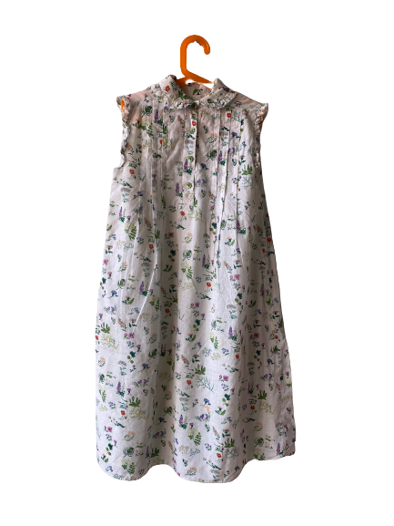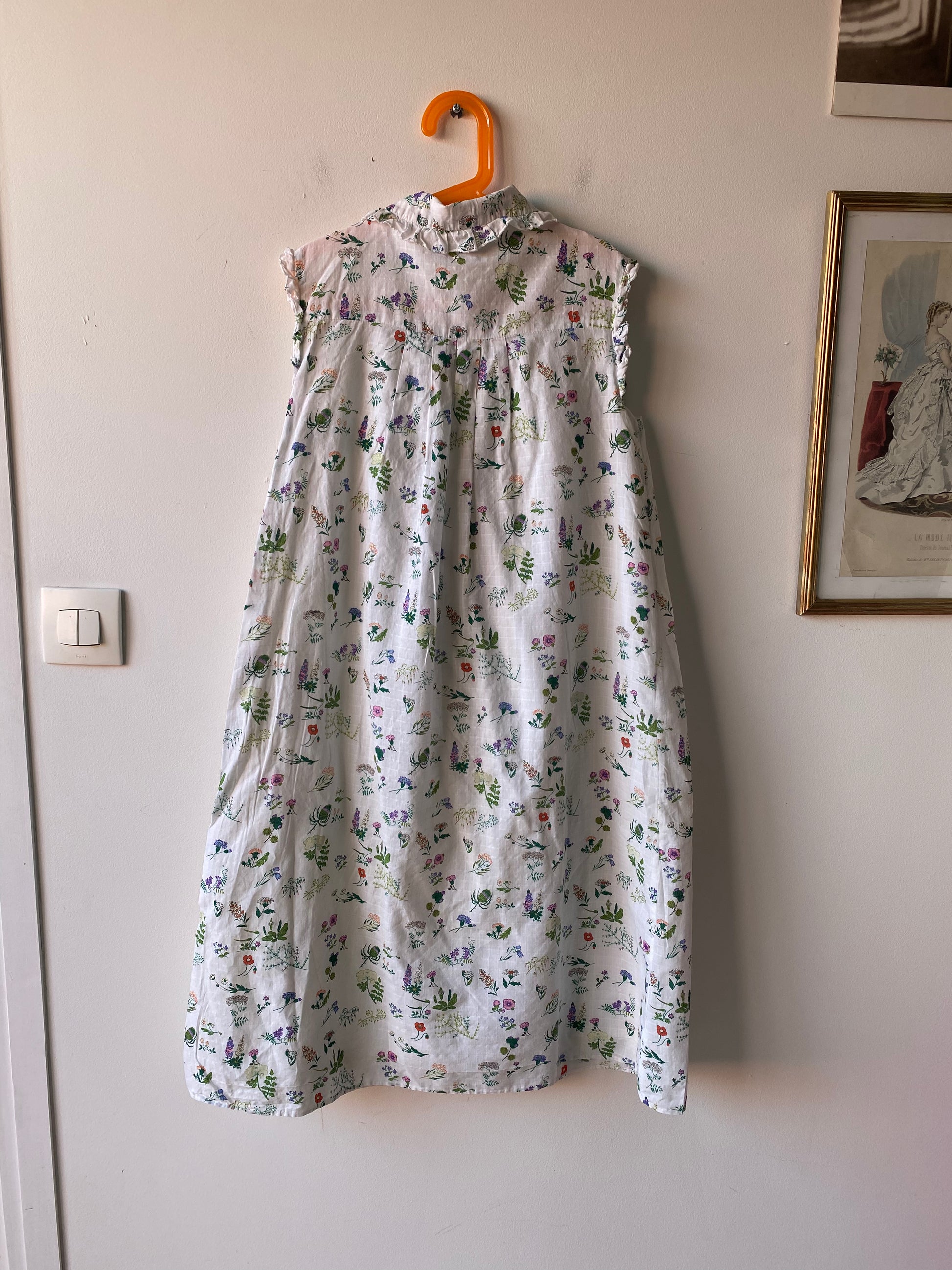 Robe longue à fleurs verte, rose et rouge sur fond blanc, sans manche, petit col Claudine, quatre boutons en forme de fleurs verte sur le col.