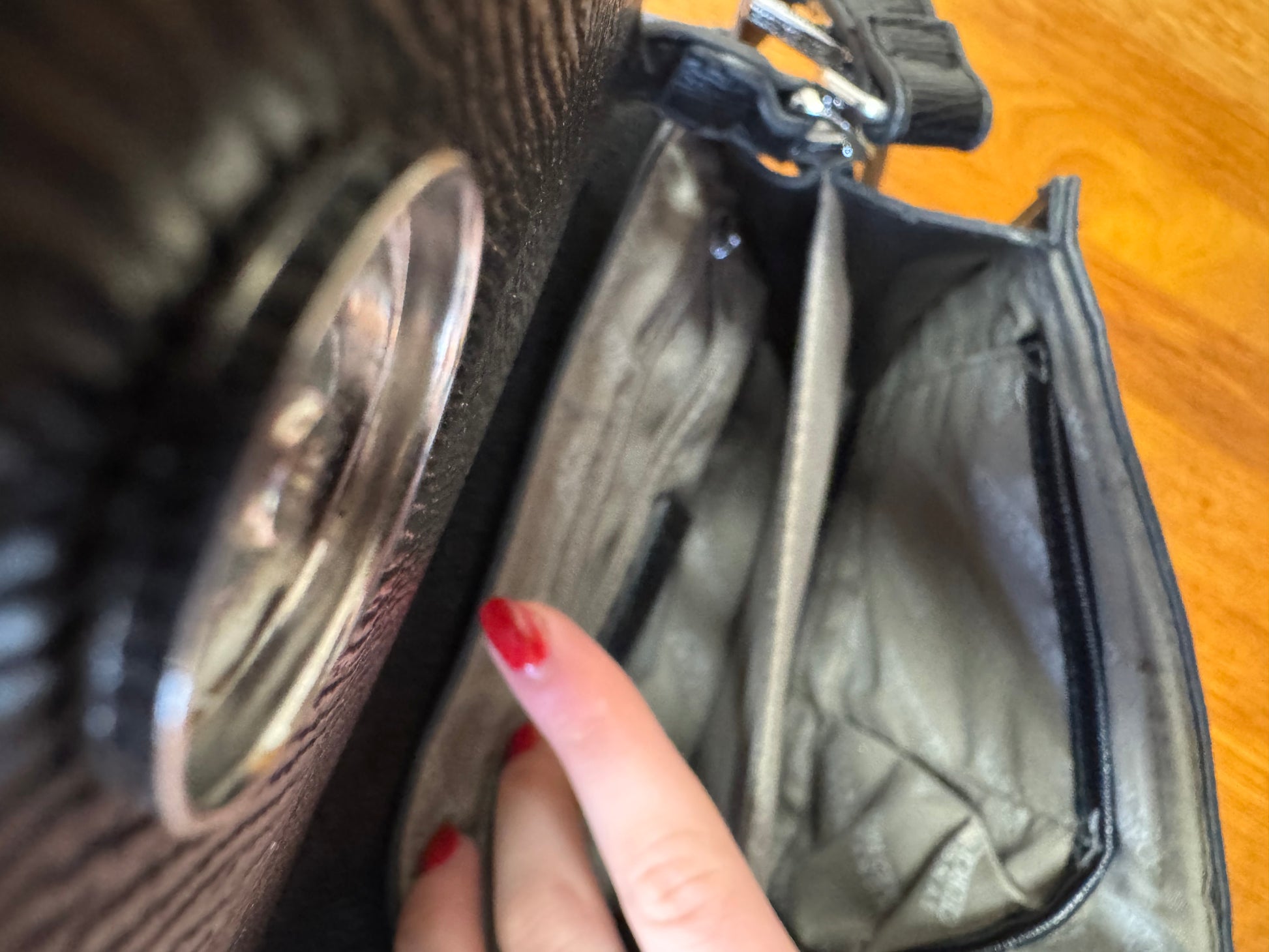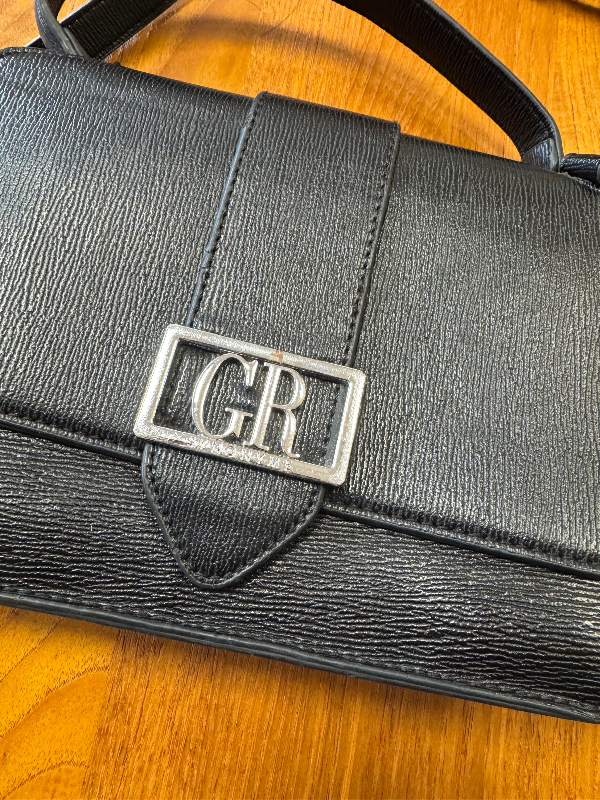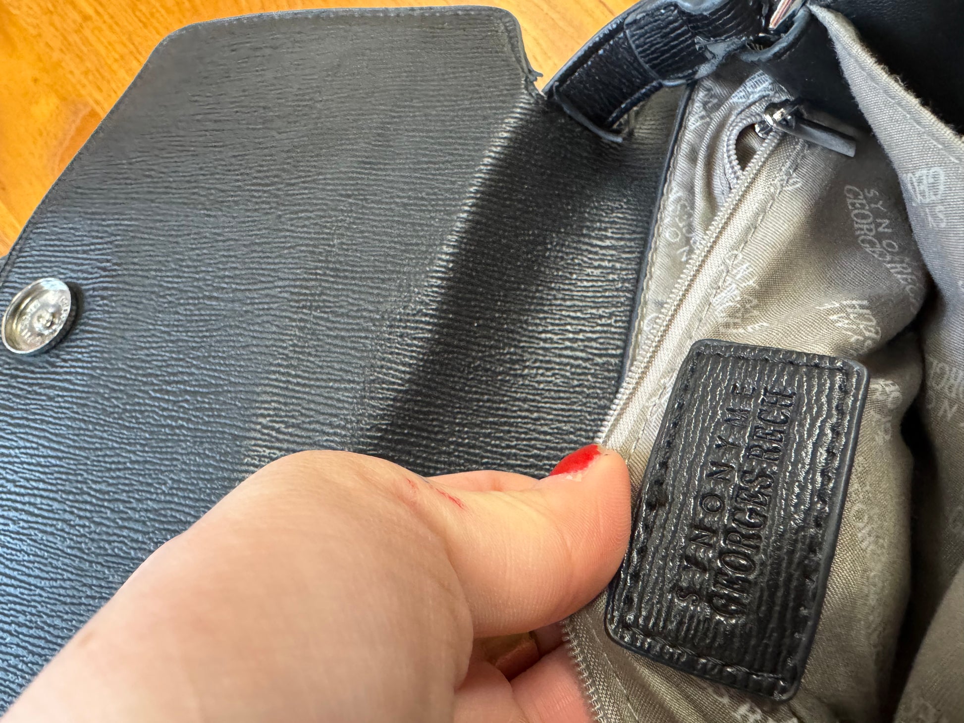 Sac bandoulière, effet cuir épie, possibilité de le porter main, empiècement métal argenté avec nom de la marque, bandoulière ajustable.