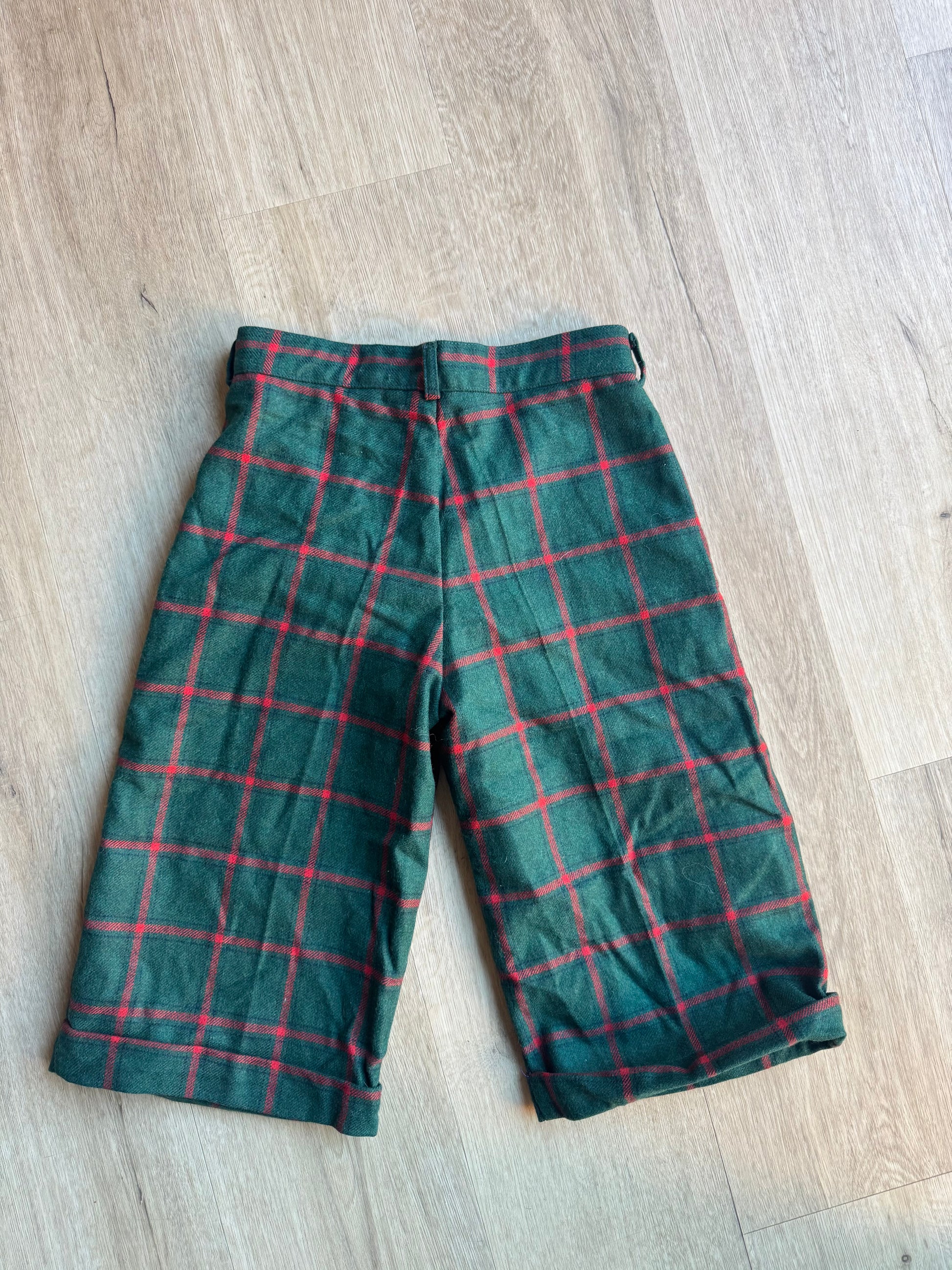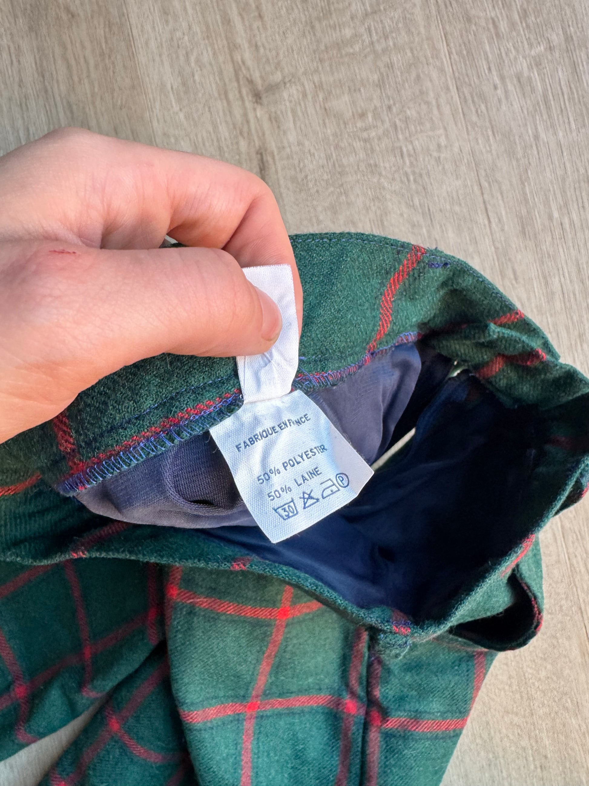 Short long vert, carreaux courge, passant pour une ceinture, deux poches, écossais.