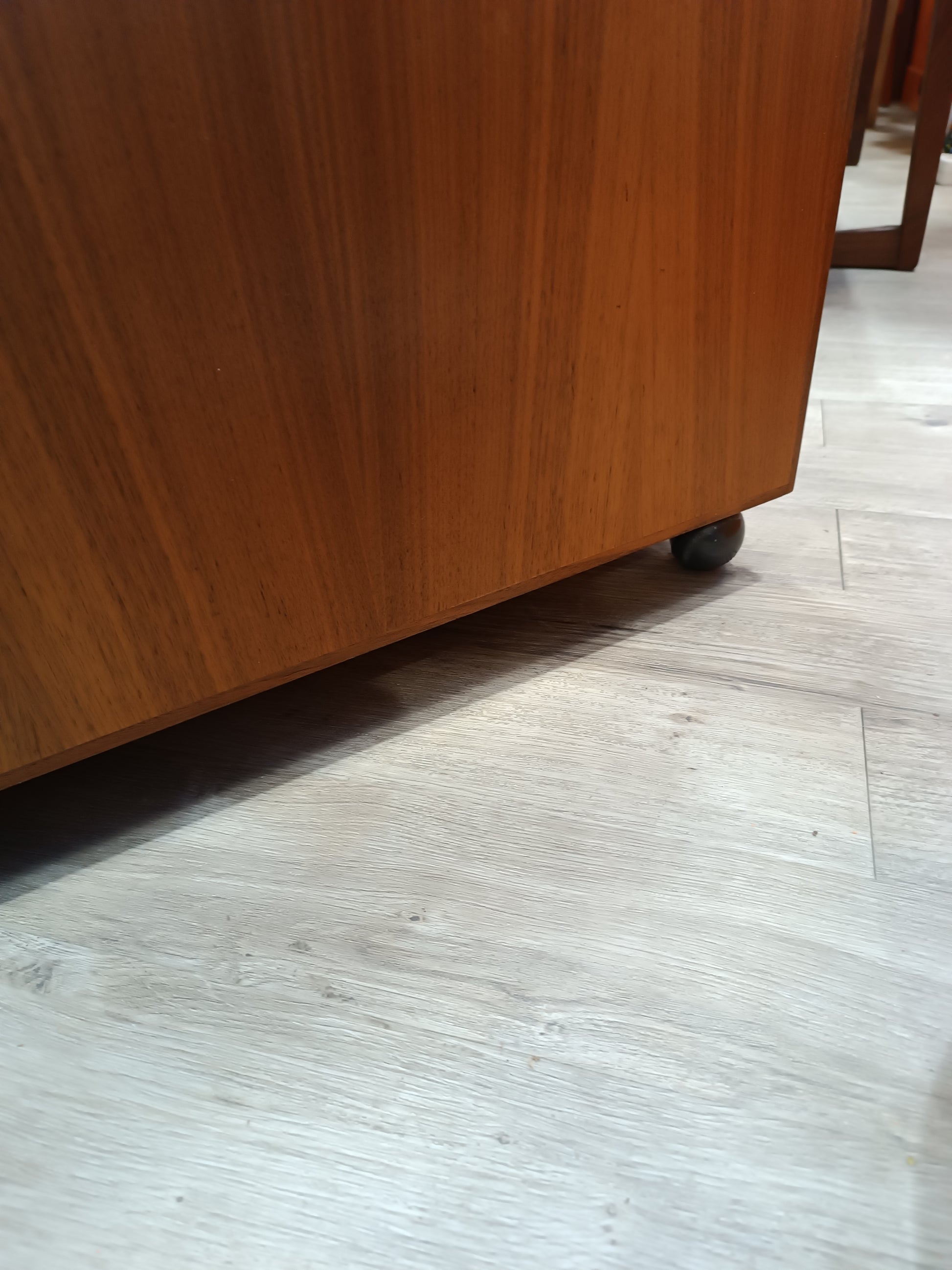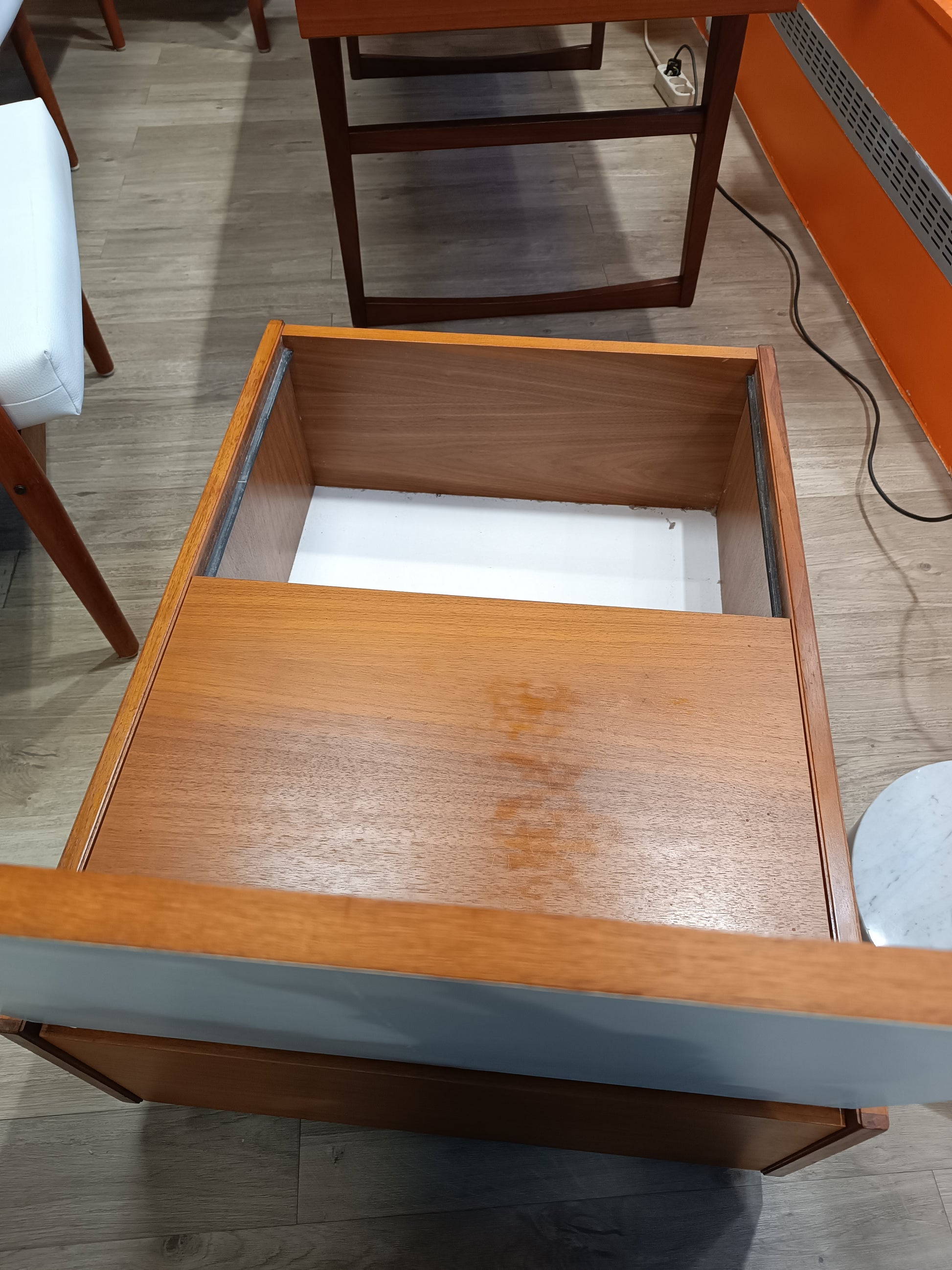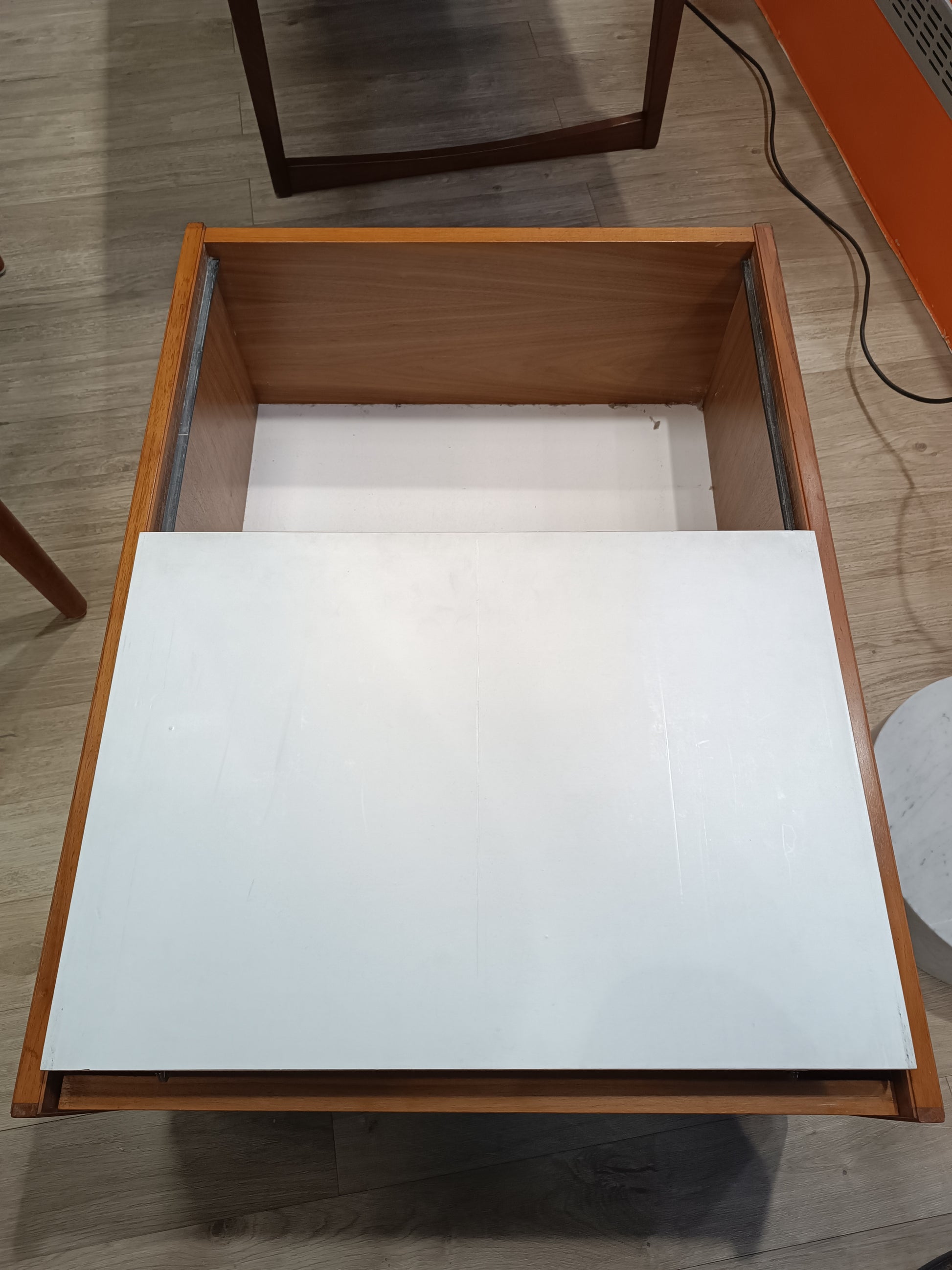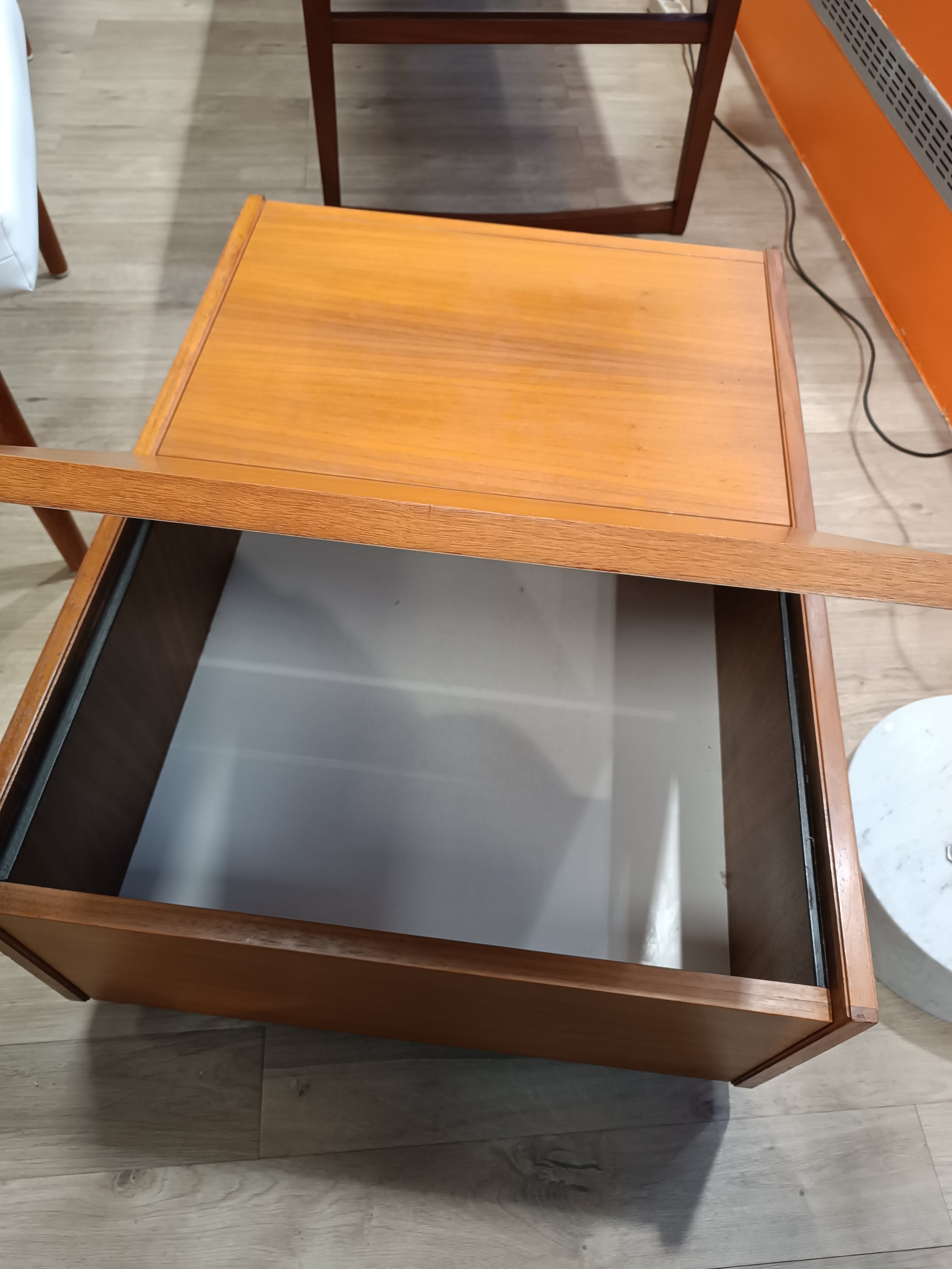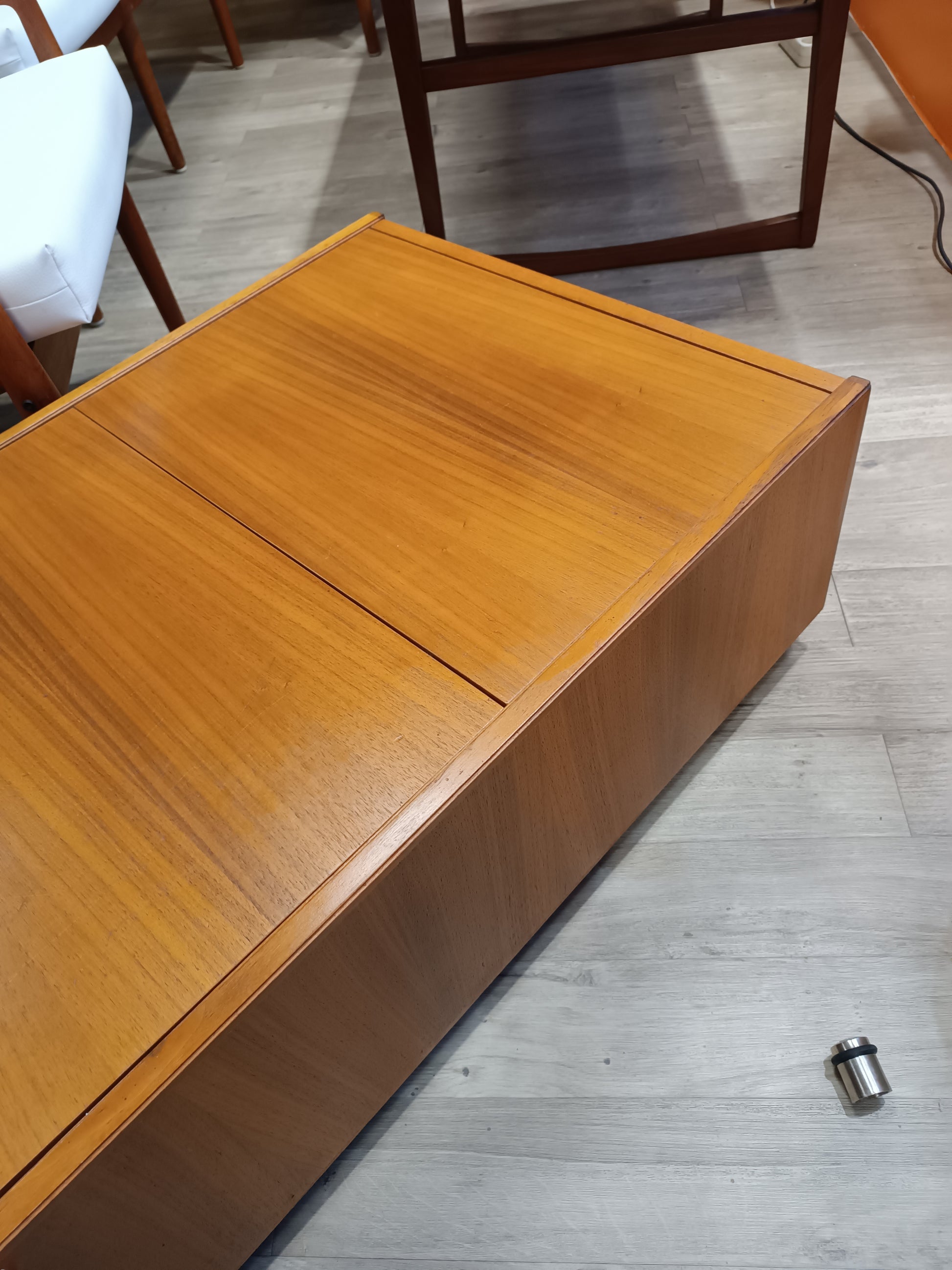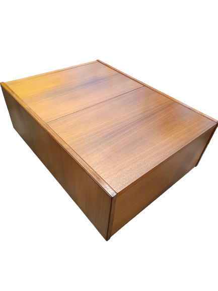 Table basse scandinave en teck a roulettes années 70's. Coffre/cocktail bar intégré, interieur mélaminé blanc. Très bon état