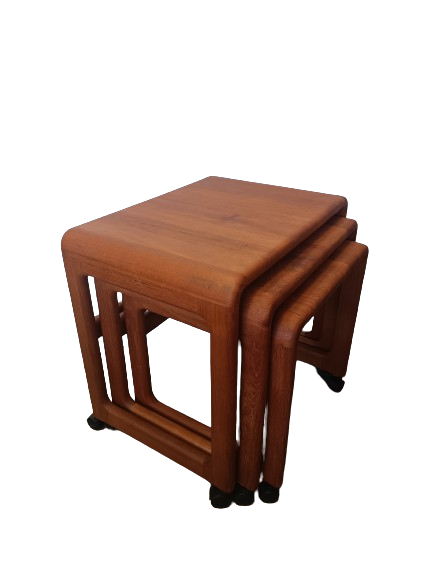 Tables gigognes par trois, scandinaves en teck massif années 70's. Elles disposent de roulettes pour pouvoir les manipuler plus facilement. Le design est reconnaissable au style scandinave. Ensemble en très bon état