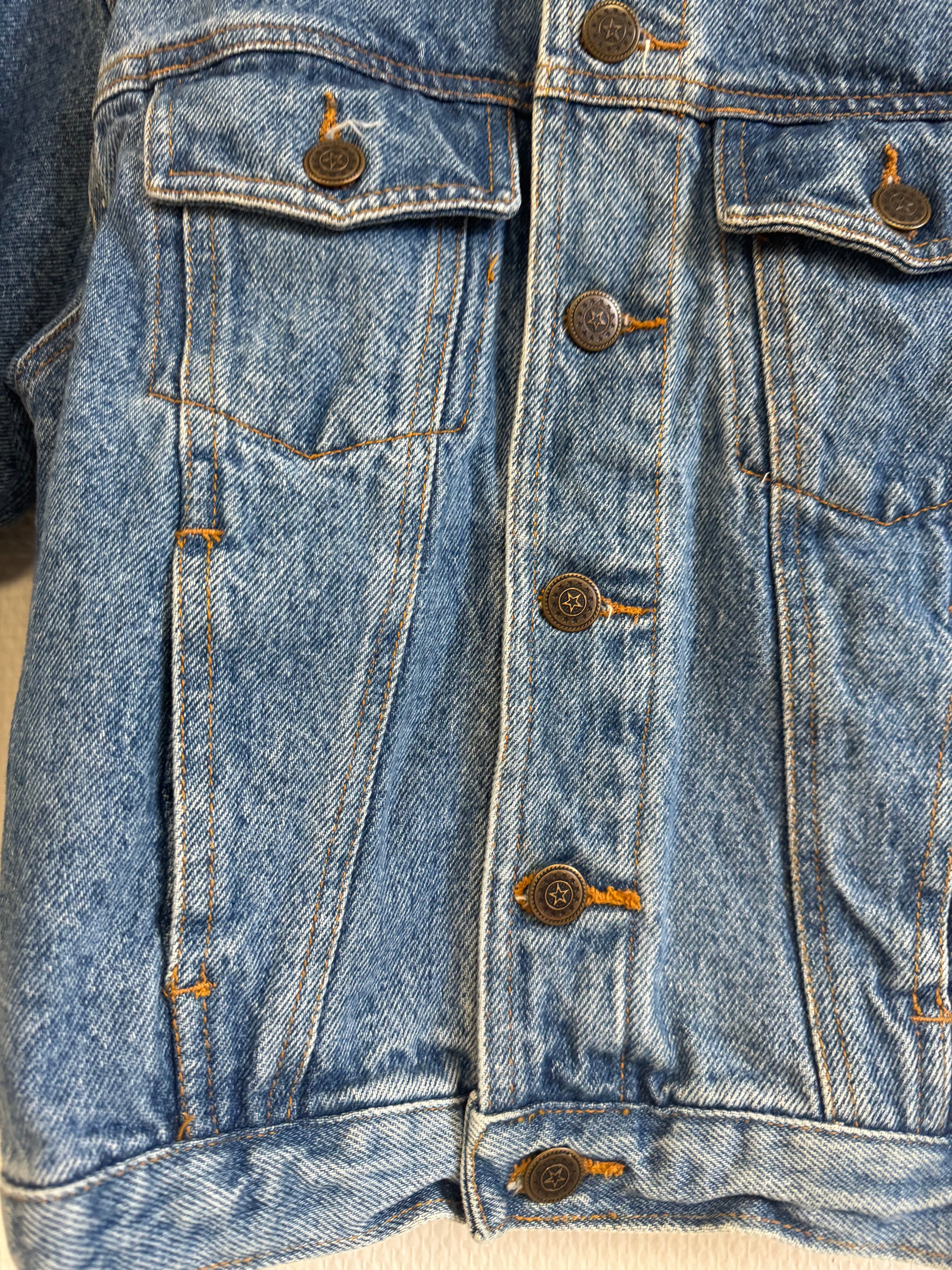 Veste en jean brut, bleu, deux poches avec boutons, écusson dans le haut du dos.